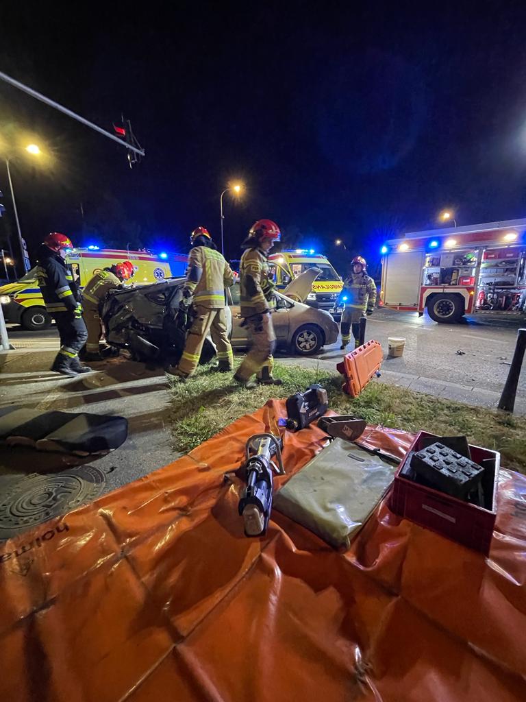 Po przybyciu na miejsce stwierdzono, że w wypadku uczestniczyły dwa samochody osobowe. Trzy z czterech osób przemieszczających się nimi znajdowały się poza pojazdami pod opieką przybyłych wcześniej na miejsce Zespołów Ratownictwa Medycznego. Pasażer jednego z aut pozostawał uwięziony na tylnej kanapie.