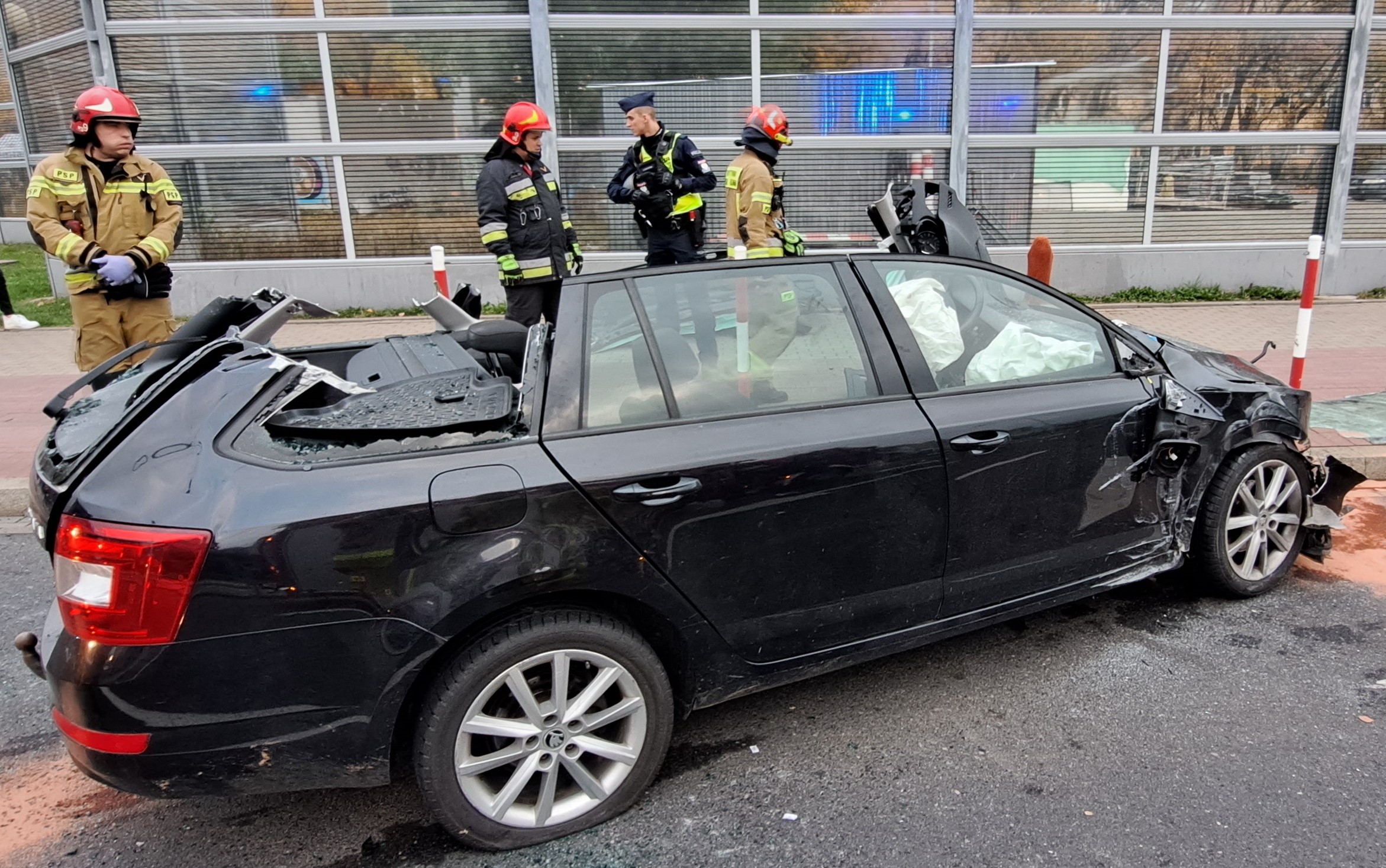 Działania PSP polegały na zabezpieczeniu miejsca zdarzenia oraz udzieleniu pierwszej pomocy uczestnikom zdarzenia zgodnie z procedurami. Następnie przystąpiono do wykonania dostępu do osoby poszkodowanej przy użyciu sprzętu hydraulicznego. Po wykonaniu dostępu osoba poszkodowana została ewakuowana na zewnątrz i przekazana Zespołowi Ratownictwa Medycznego. Wszystkie osoby biorące udział w zdarzeniu zostały zabrane do szpitala na szczegółowe badania. Okoliczności zdarzenia wyjaśni będący na miejscu patrol Policji.