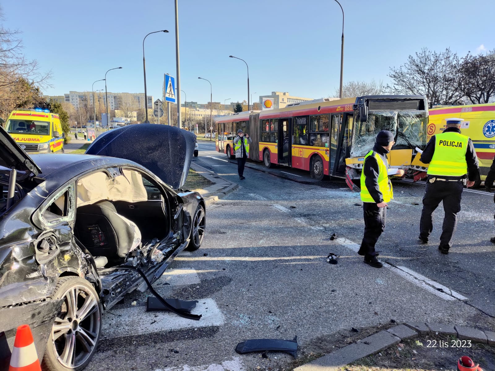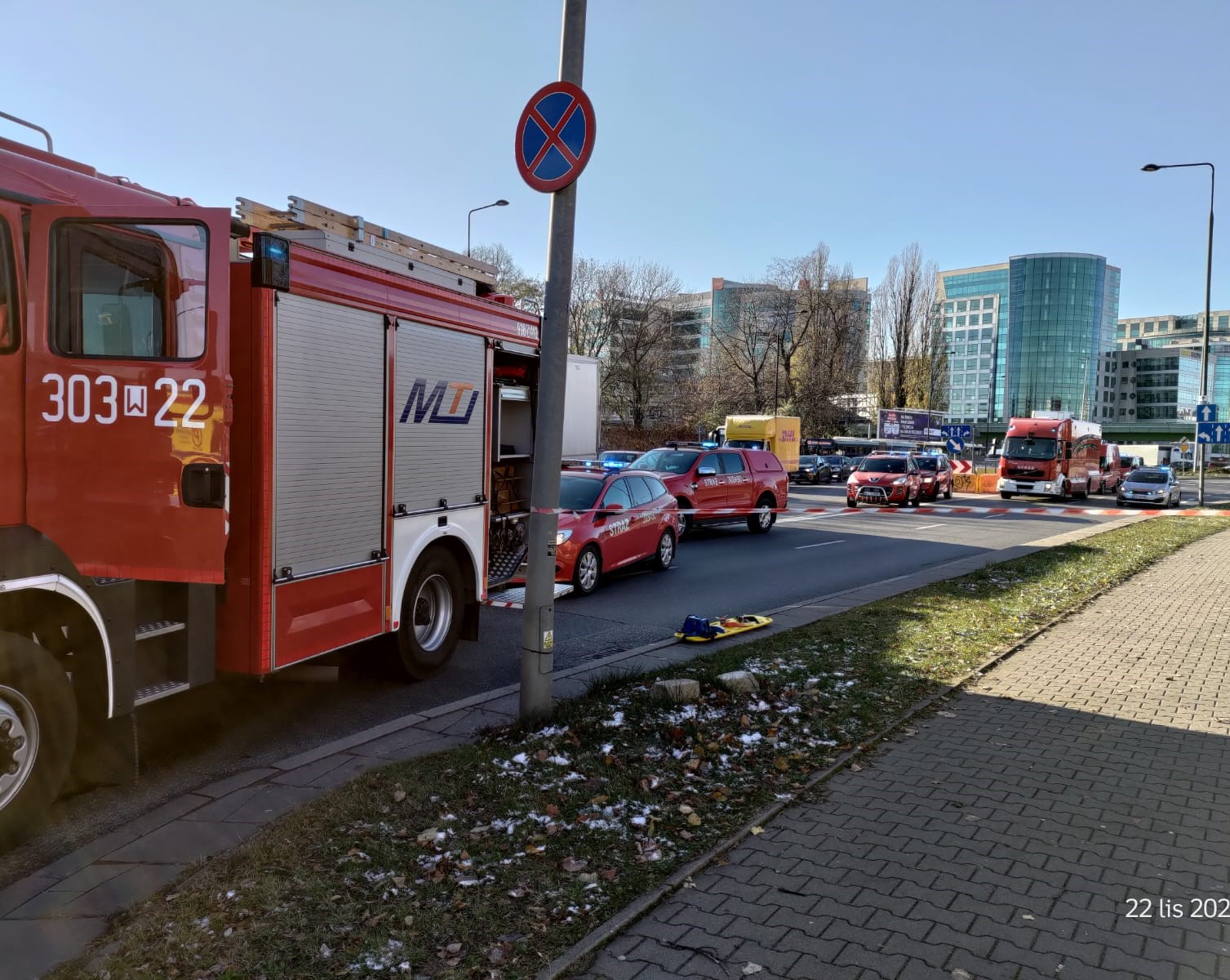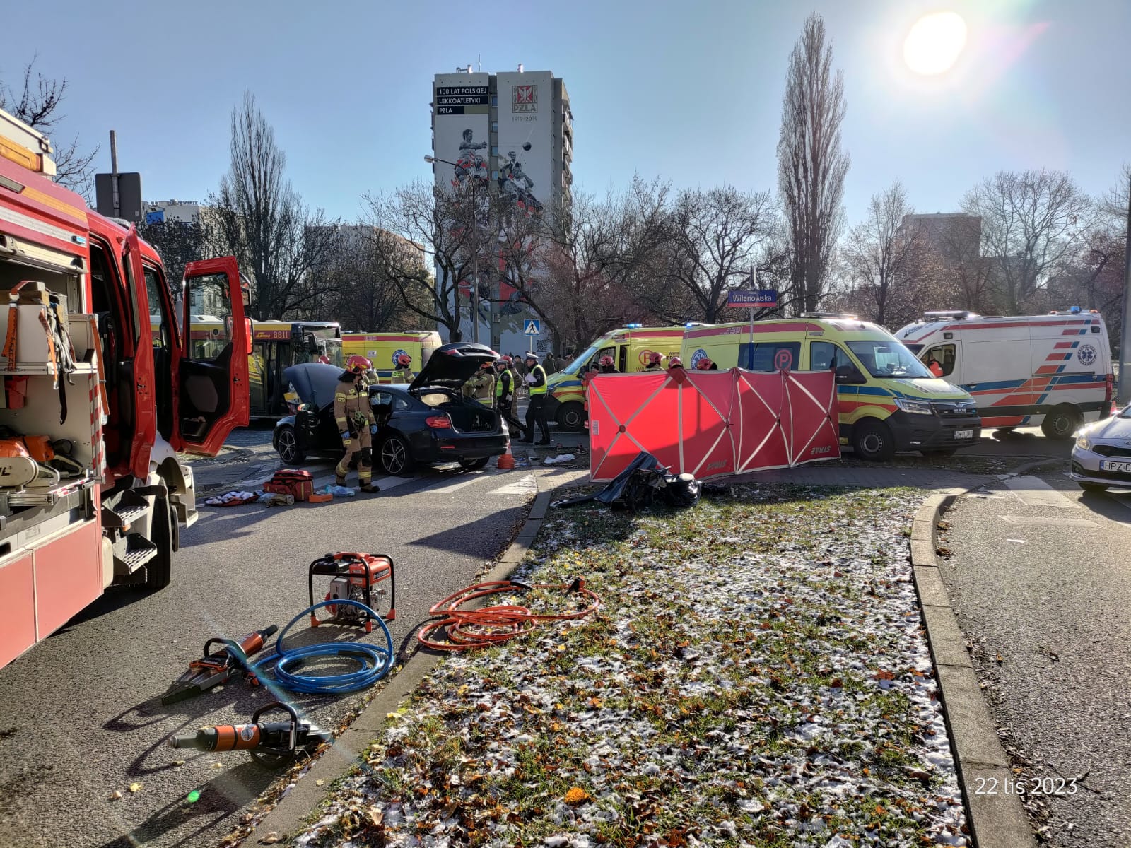 W dniu 22.11.2023 r. o godzinie 11:38 do Jednostki Ratowniczo - Gaśniczej nr 9 wpłynęło zgłoszenie o wypadku w Alei Wilanowskiej. Do zdarzenia w początkowej fazie zadysponowano zastępy z JRG 9 oraz JRG 3.