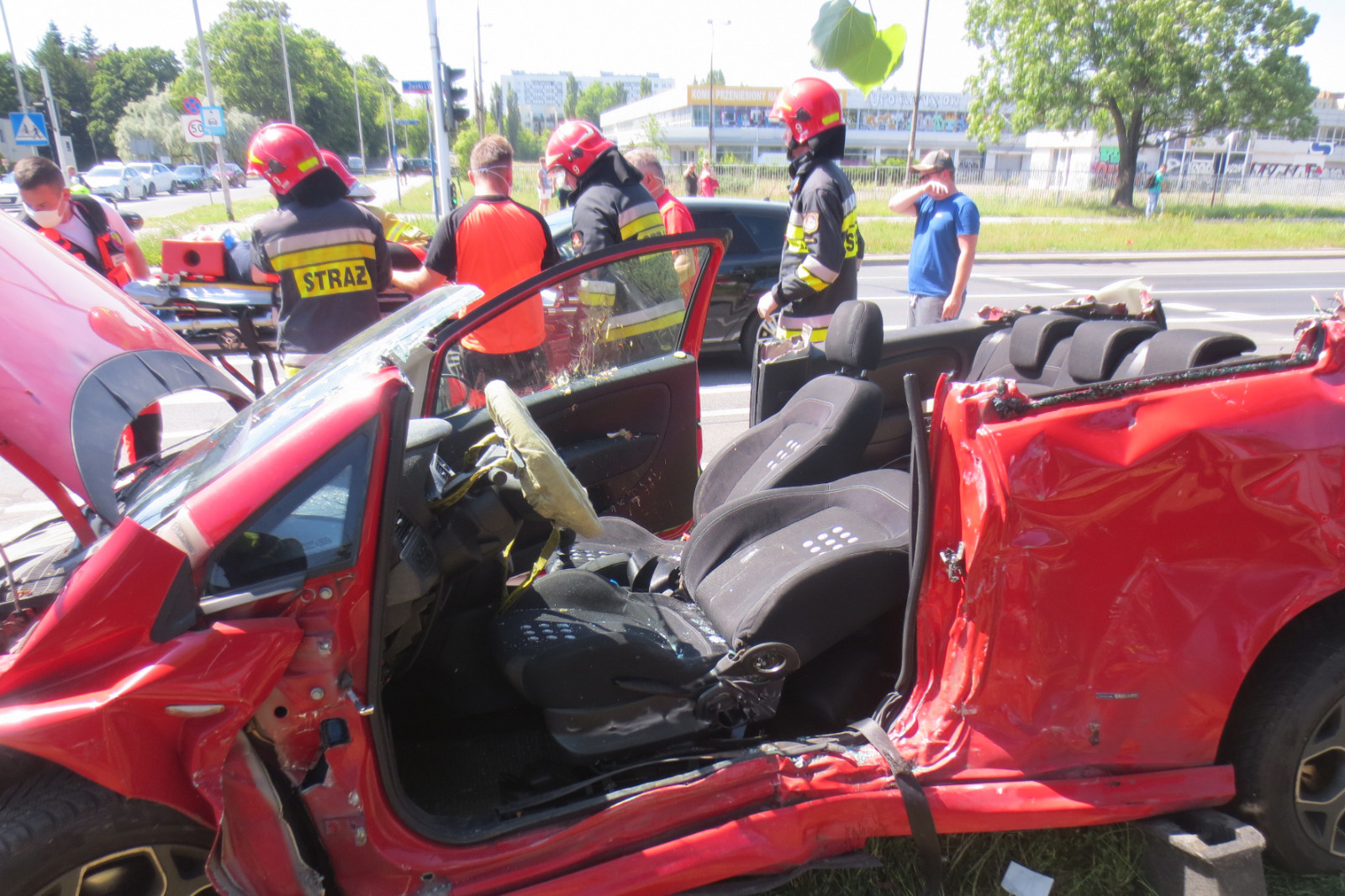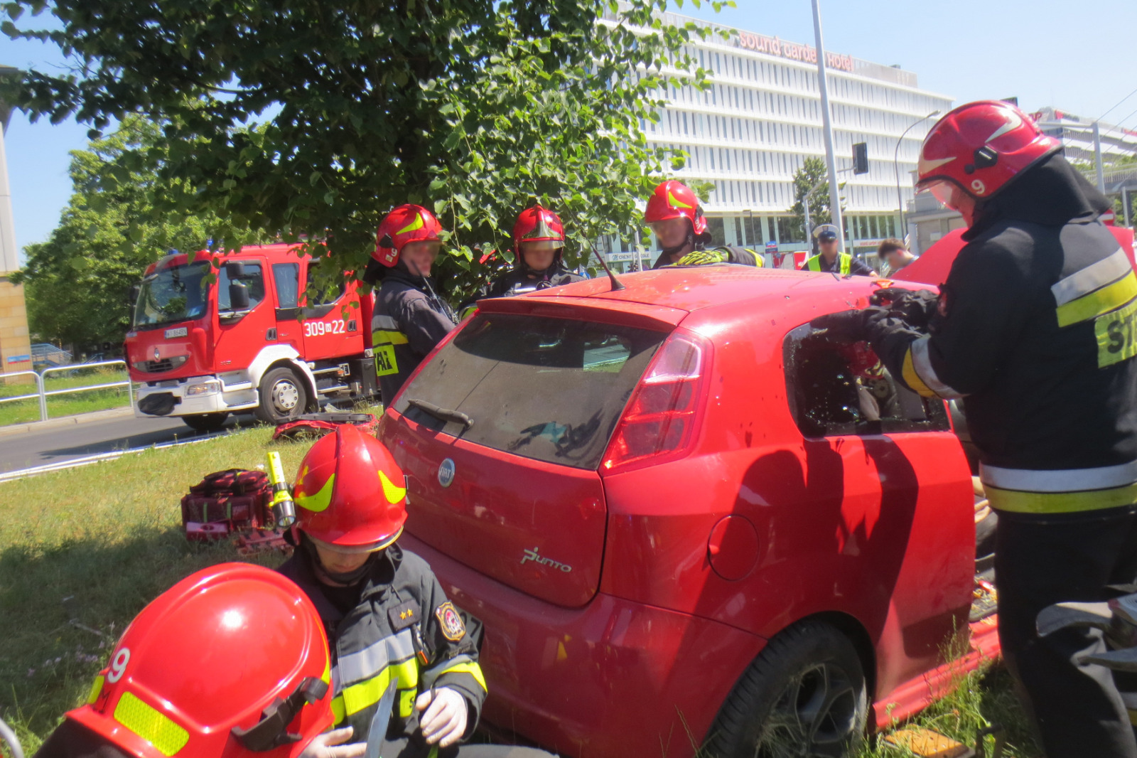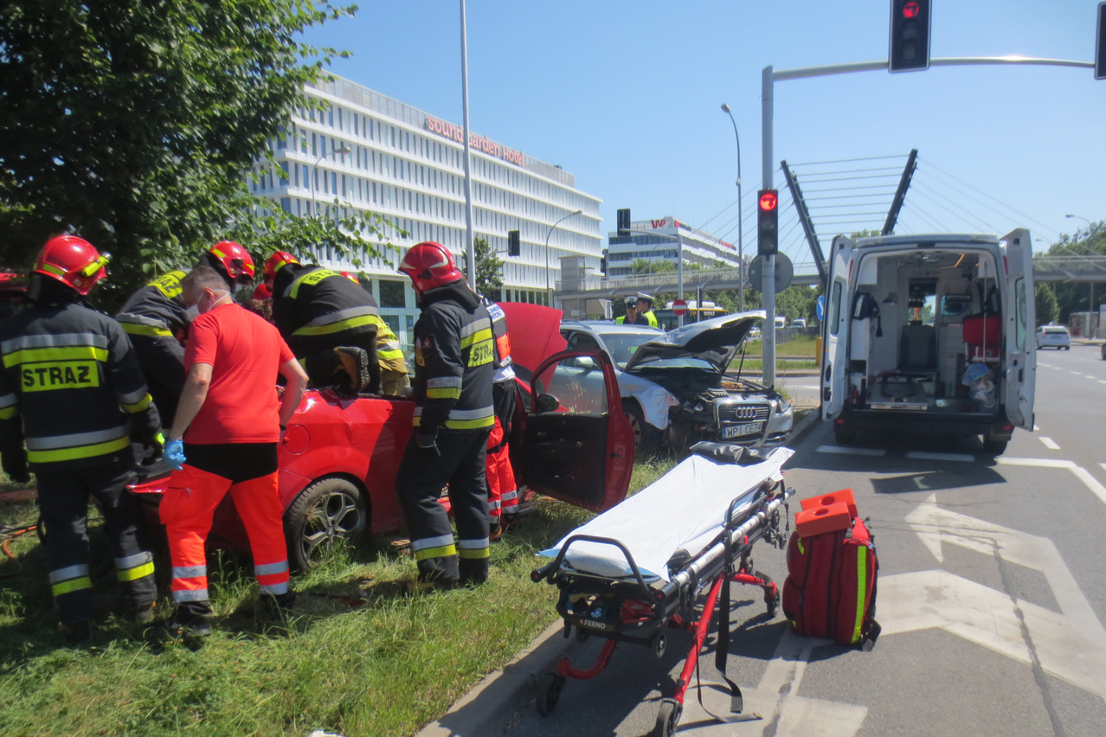 Po dojeździe zastępów PSP na miejsce zdarzenia stwierdzono zderzenie dwóch samochodów osobowych, przy czym obydwa auta znajdowały się na pasie zieleni oddzielającym jezdnie ul. Żwirki i Wigury biegnące w kierunku północnym i południowym. W wyniku zderzenia poszkodowana została jedna osoba, która w momencie przyjazdu strażaków na miejsce zdarzenia pozostawała w kierowanym przez siebie samochodzie ze względu na odniesione obrażenia oraz uszkodzenia pojazdu. Poszkodowana znajdowała się pod opieką personelu placówki medycznej znajdującej się nieopodal miejsca zdarzenia.