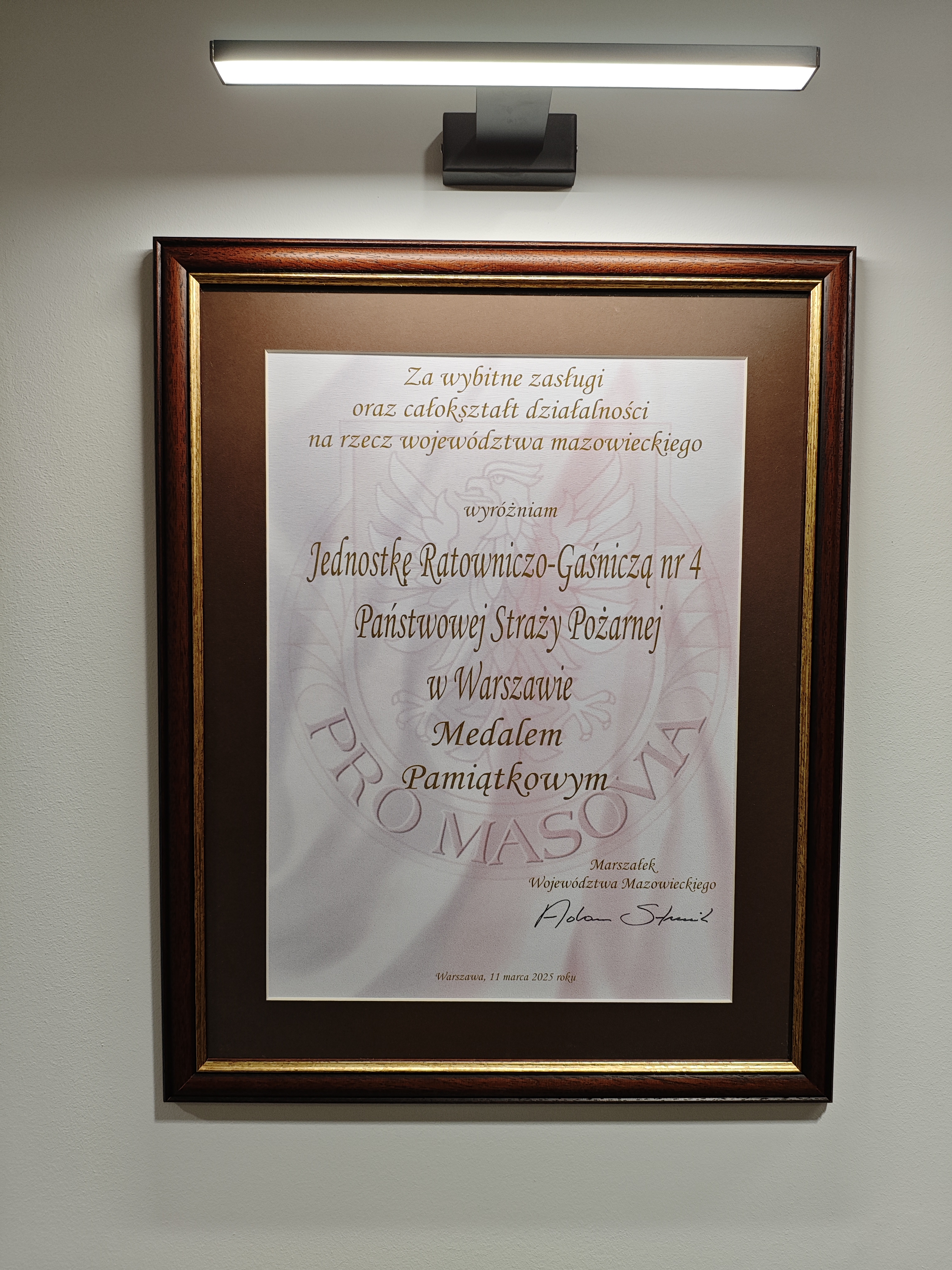 Jednostka Ratowniczo-Gaśnicza nr 4, która codziennie dba o bezpieczeństwo mieszkańców Woli, została uhonorowana medalem "Pro Masovia". Medal ten jest przyznawany przez Marszałka Województwa Mazowieckiego za działalność na rzecz mieszkańców Mazowsza.