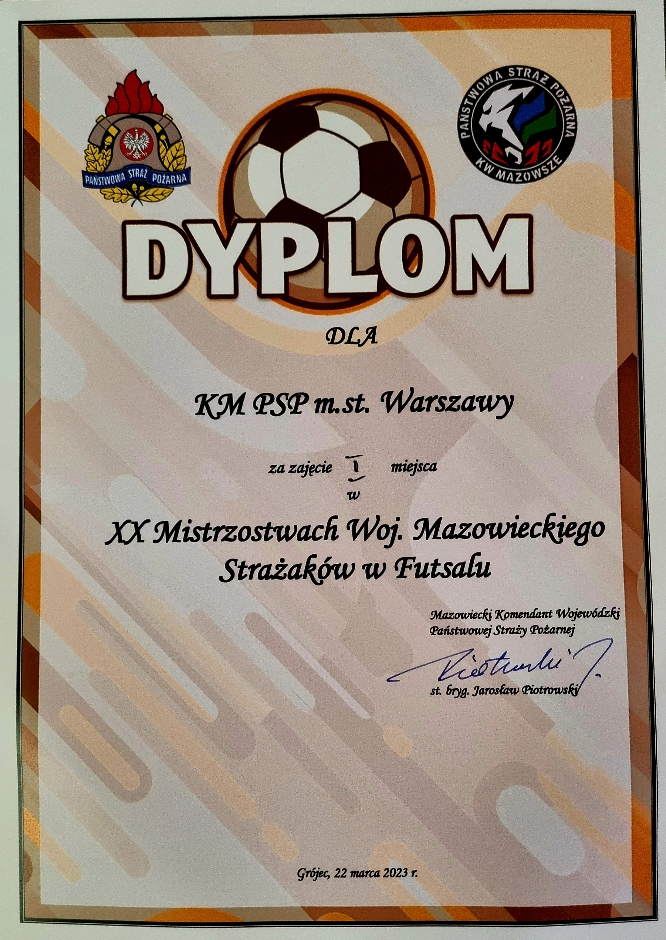 i KP PSP Mława. Faza grupowa dla piłkarzy ze stolicy przebiegła gładko, wygrywając wszystkie mecze zainkasowali 9 pkt. i z pierwszego miejsca wyszli z grupy. W półfinale drużyna stołeczni strażacy trafia na komendę powiatową z Piaseczna, z którą gładko wygrywają aż 7:0. W finale spotykają się KM PSP m.st. Warszawy oraz KM PSP Radom ( również finaliści z poprzedniego roku ) . Po bardzo zaciętym pojedynku, w którym Komenda Miejska z Warszawy szybko zdobyła dwie bramki piłkarze