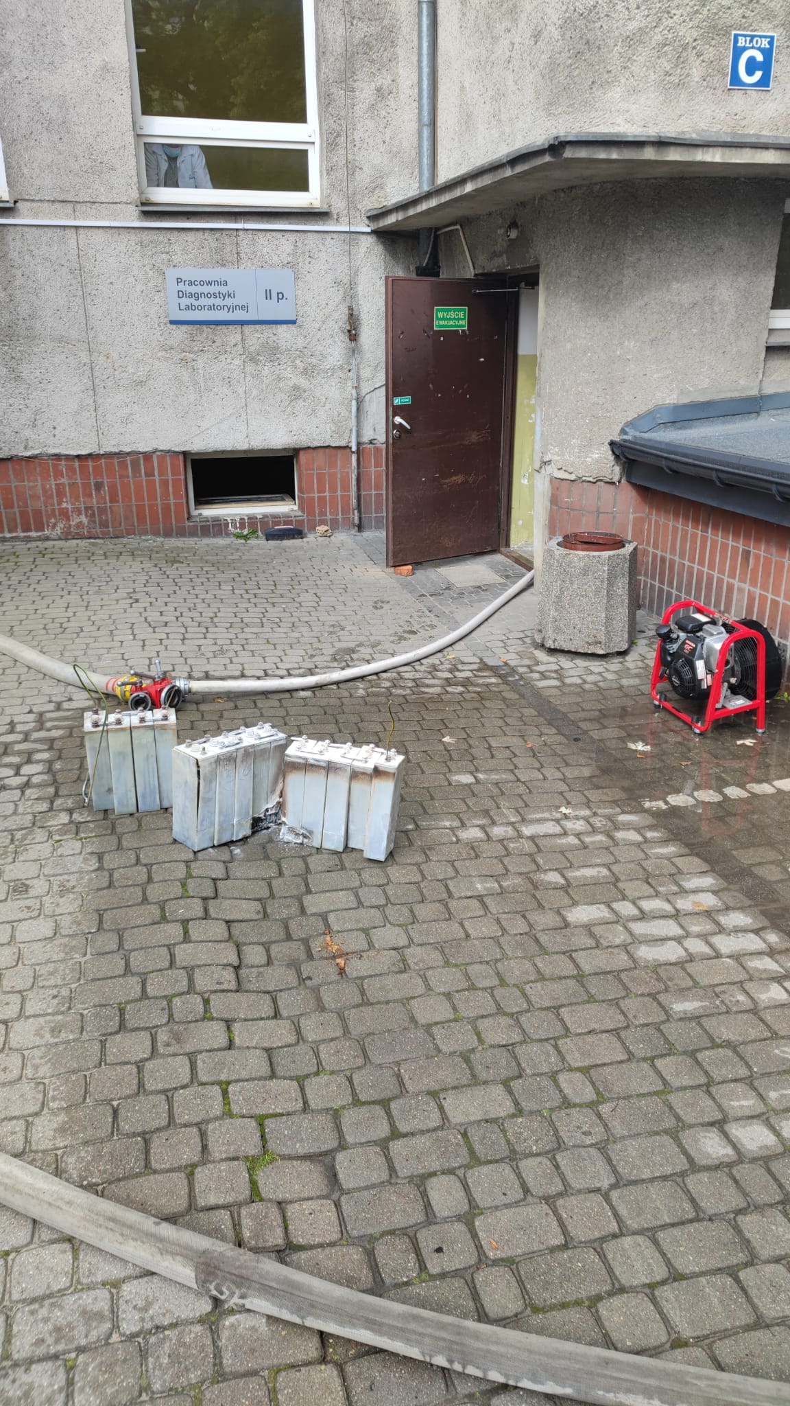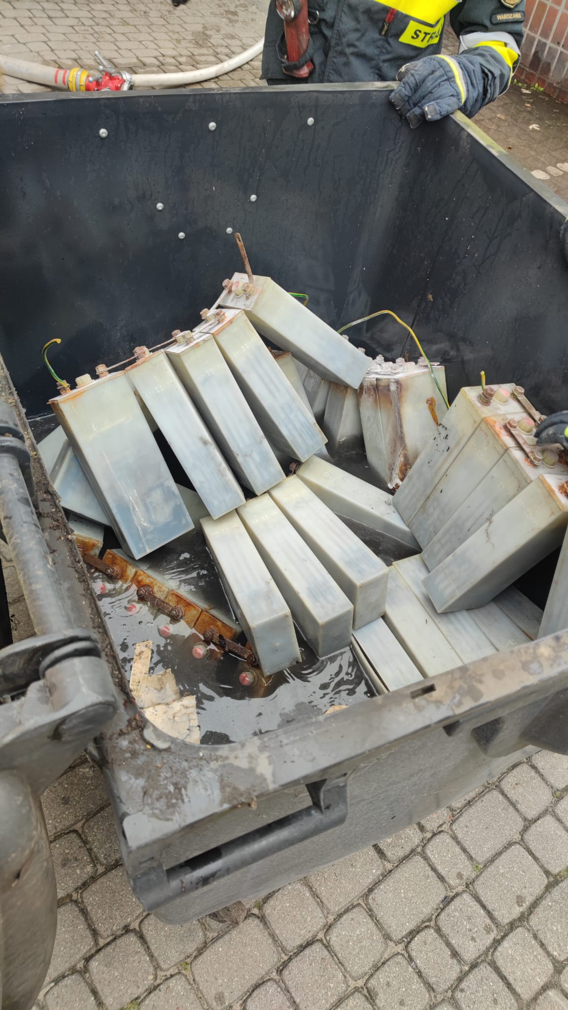 - rozkręceniu akumulatorów , wyniesieniu ich na zewnątrz budynku do kontenera i zalaniu wodą ,