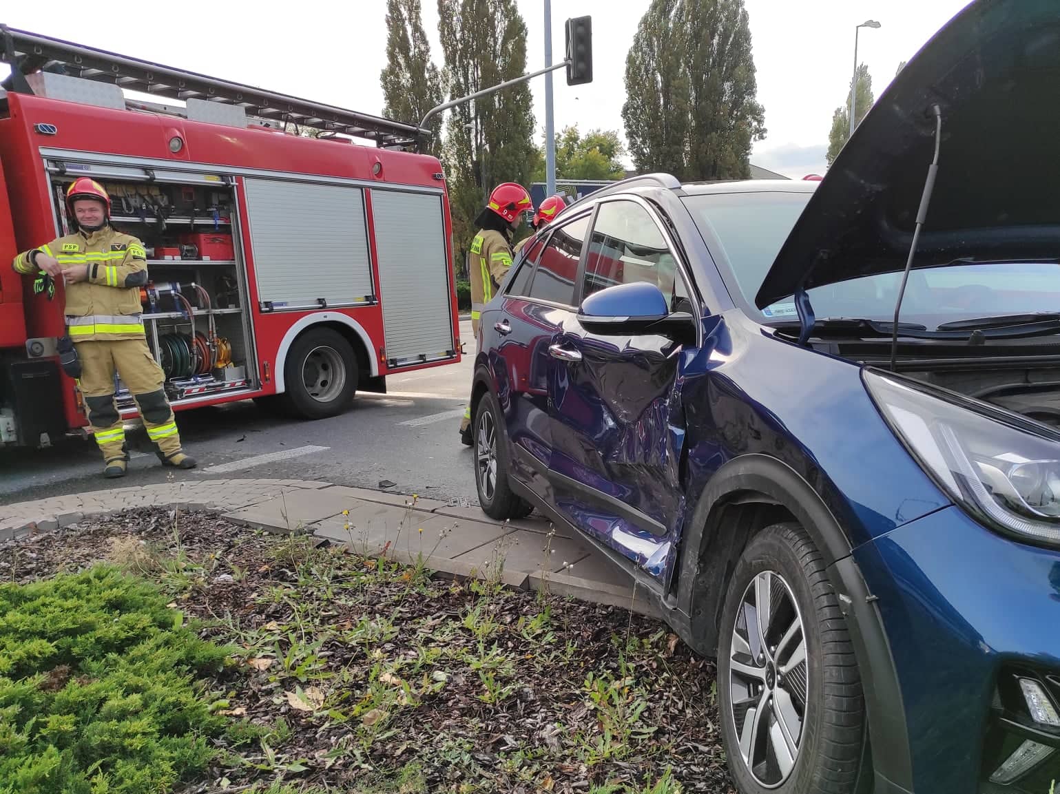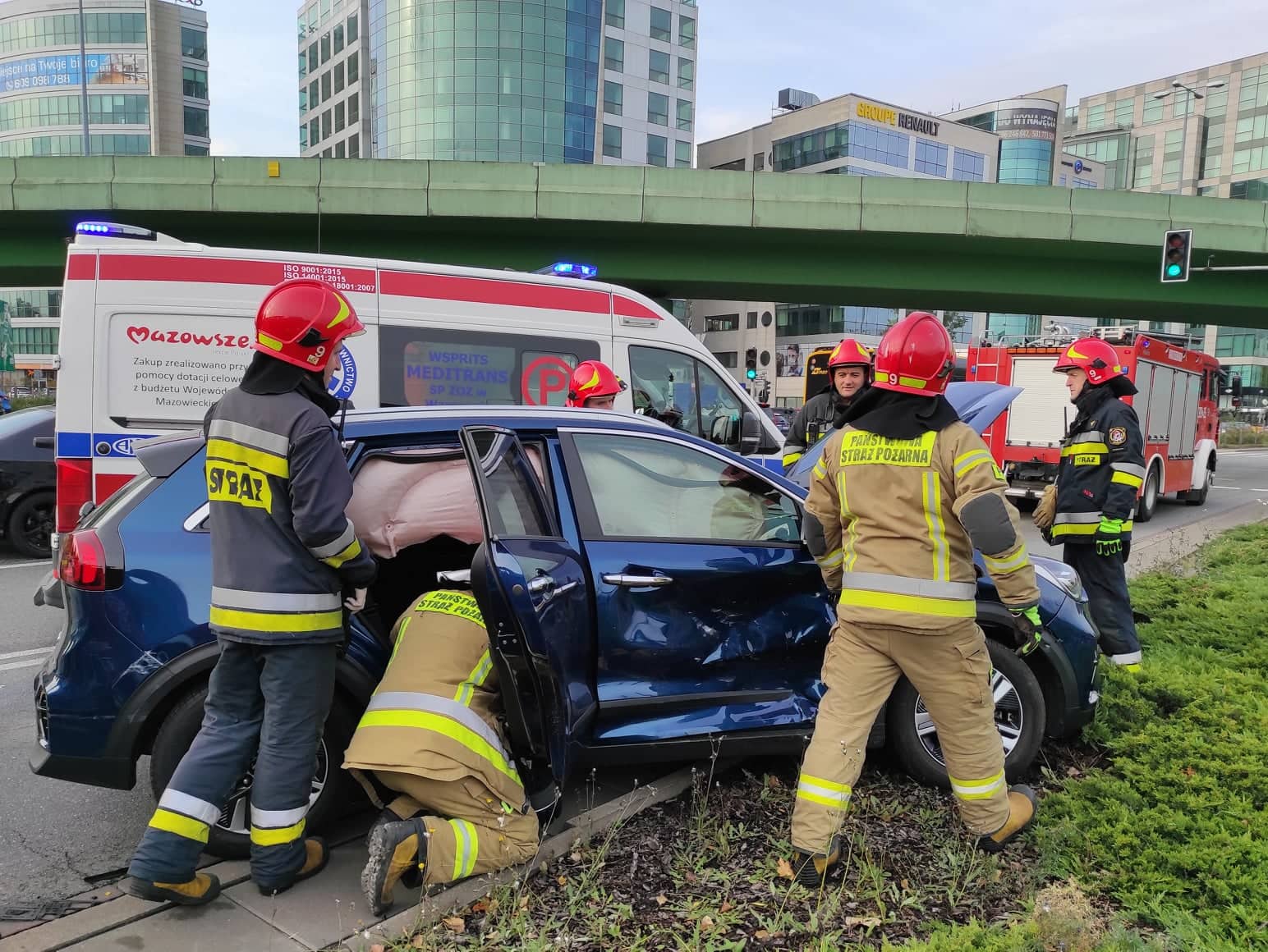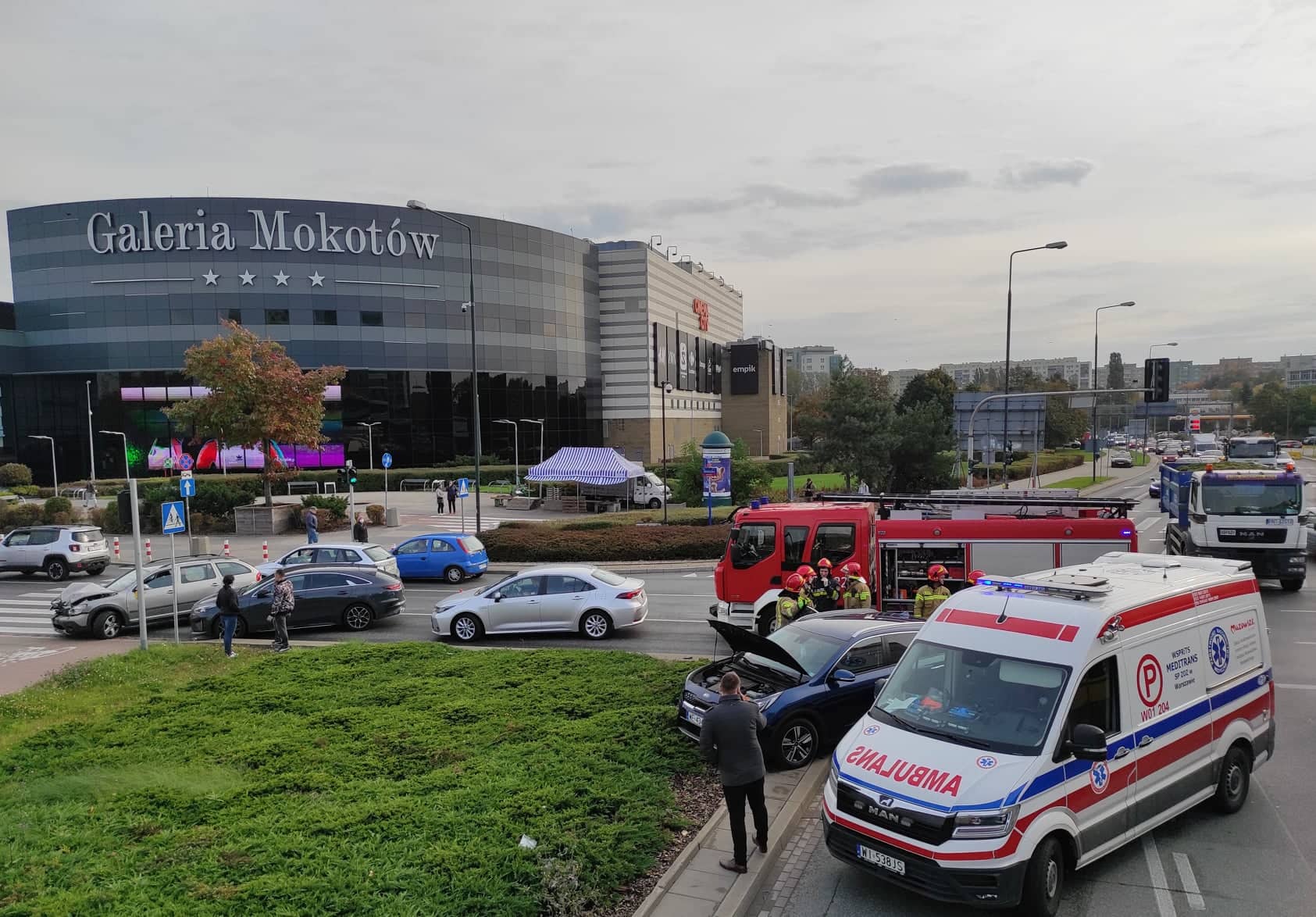W dniu 06.10.2021 r. około godziny 9:30 do Jednostki Ratowniczo - Gaśniczej nr 9 wpłynęło zgłoszenie o wypadku, do którego doszło na skrzyżowaniu o ruchu okrężnym ulicy Wołoskiej z Aleją Wilanowską. Do zdarzenia zadysponowano GCBA 5/32/2,5 oraz GBA Rt 2,5/25/2,5.