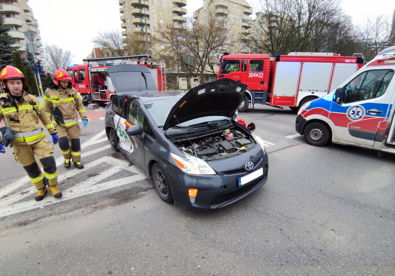 W wyniku rozpoznania ustalono, że samochód osobowy Toyota Prius (kolor biały), uderzył w drugi samochód, również Toyota Prius (kolor czarny). W zderzeniu brało udział łącznie 5 osób. Kierujący pojazdami oraz jeden z pasażerów odmówili udzielenia pomocy medycznej. Pozostali pasażerowie zostali przebadani na miejscu zdarzenia i po decyzji lekarza zostali przetransportowani na szczegółowe badania do placówek medycznych na ul. Kasprzaka i ul. Barską. W skutek wypadku zablokowane zostało skrzyżowanie.
