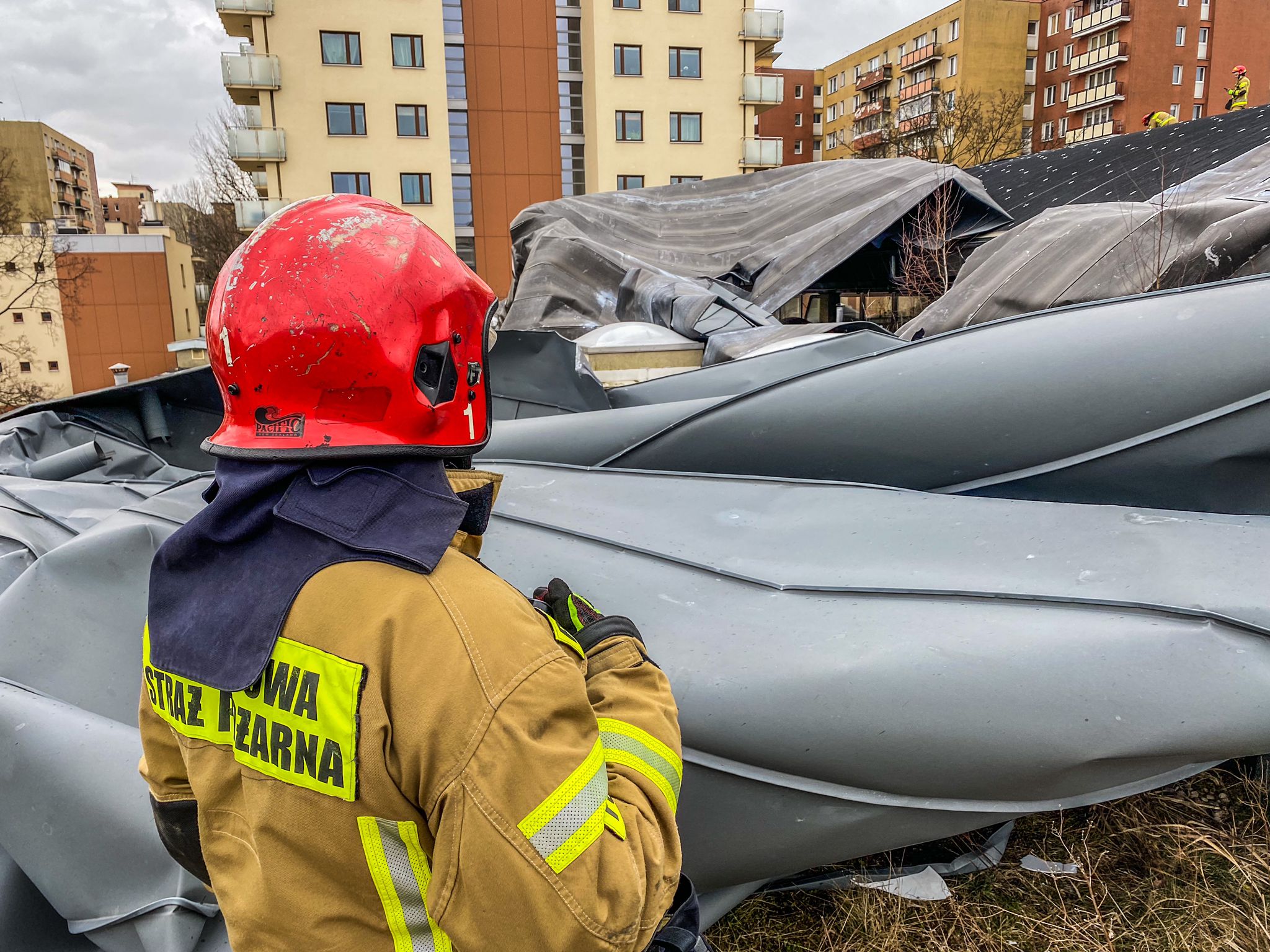 Ze wstępnych ustaleń wynika, że około 90 % poszycia dachu zostało zerwane. W początkowej fazie działań ewakuowano mieszkańców pobliskiego bloku, których okna bezpośrednio sąsiadowały z halą. Działania strażaków polegały na usunięciu zwisających elementów blachy oraz zabezpieczeniu dachu przed opadami.