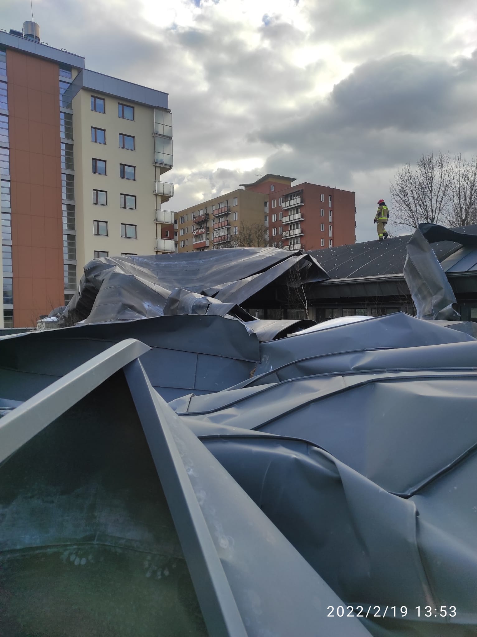 W dniu 19.02.2022r. o godzinie 11.45 do Stanowiska Kierowania Komendanta Miejskiego PSP m. st. Warszawy wpłynęło zgłoszenie o zerwanym dachu na hali sportowej Zespołu Szkół z Oddziałami Integracyjnymi numer 41 przy ulicy Bartniczej 2. Do zdarzenie zostały zadysponowane 3 zastępy straży pożarnej z JRG 1.