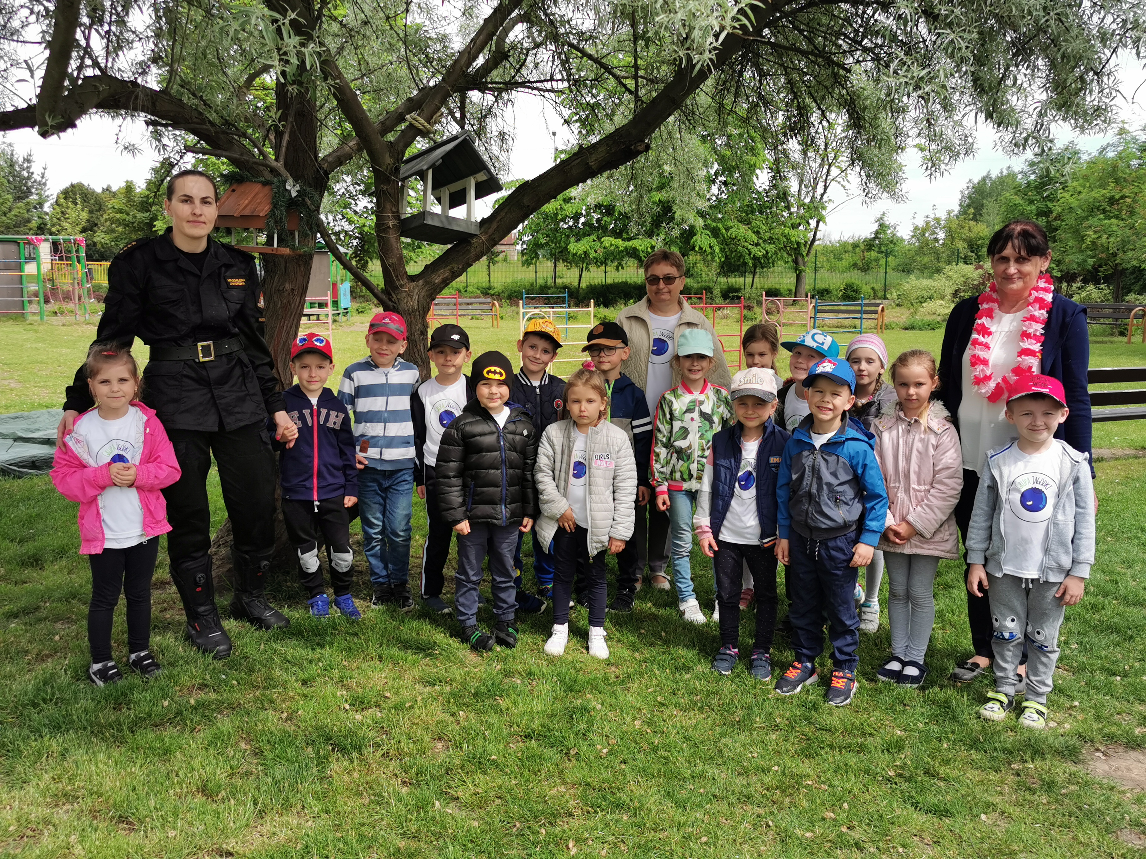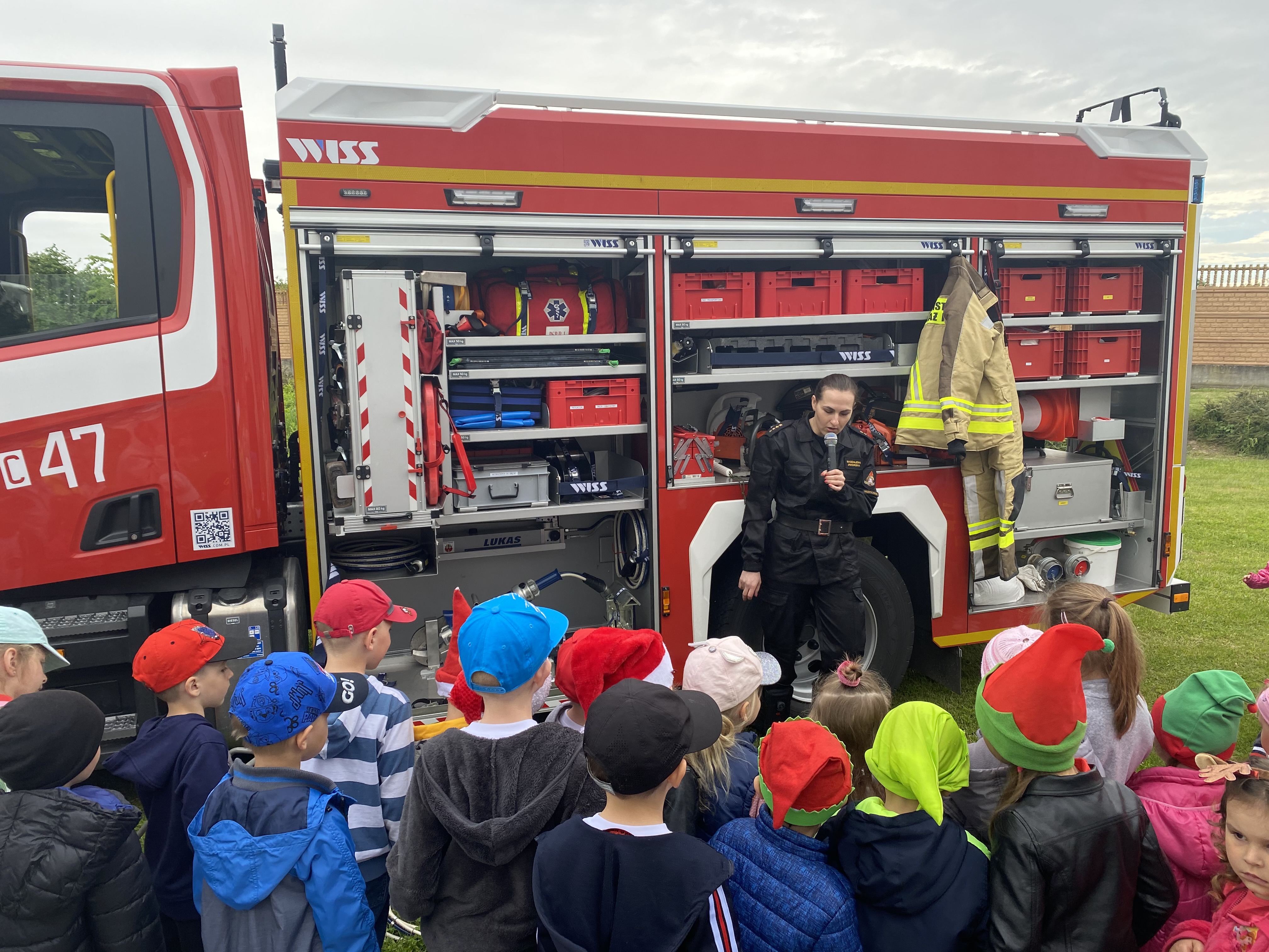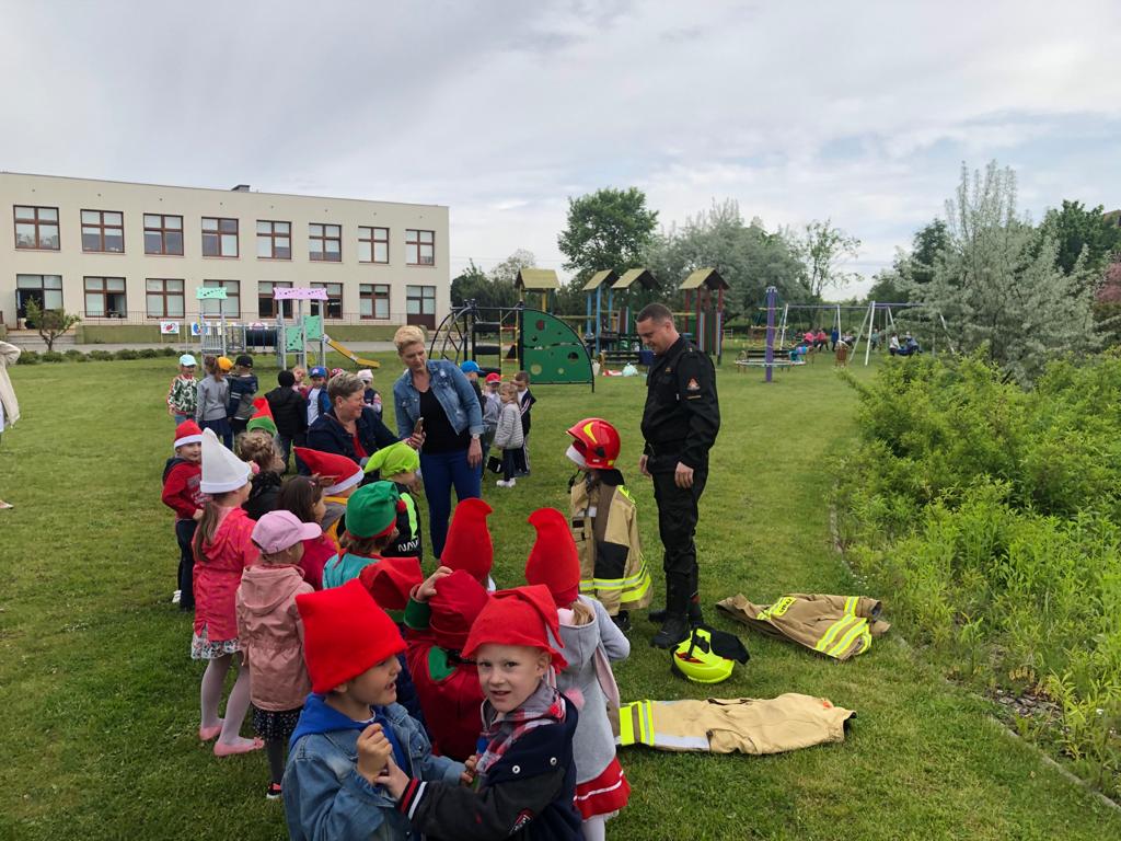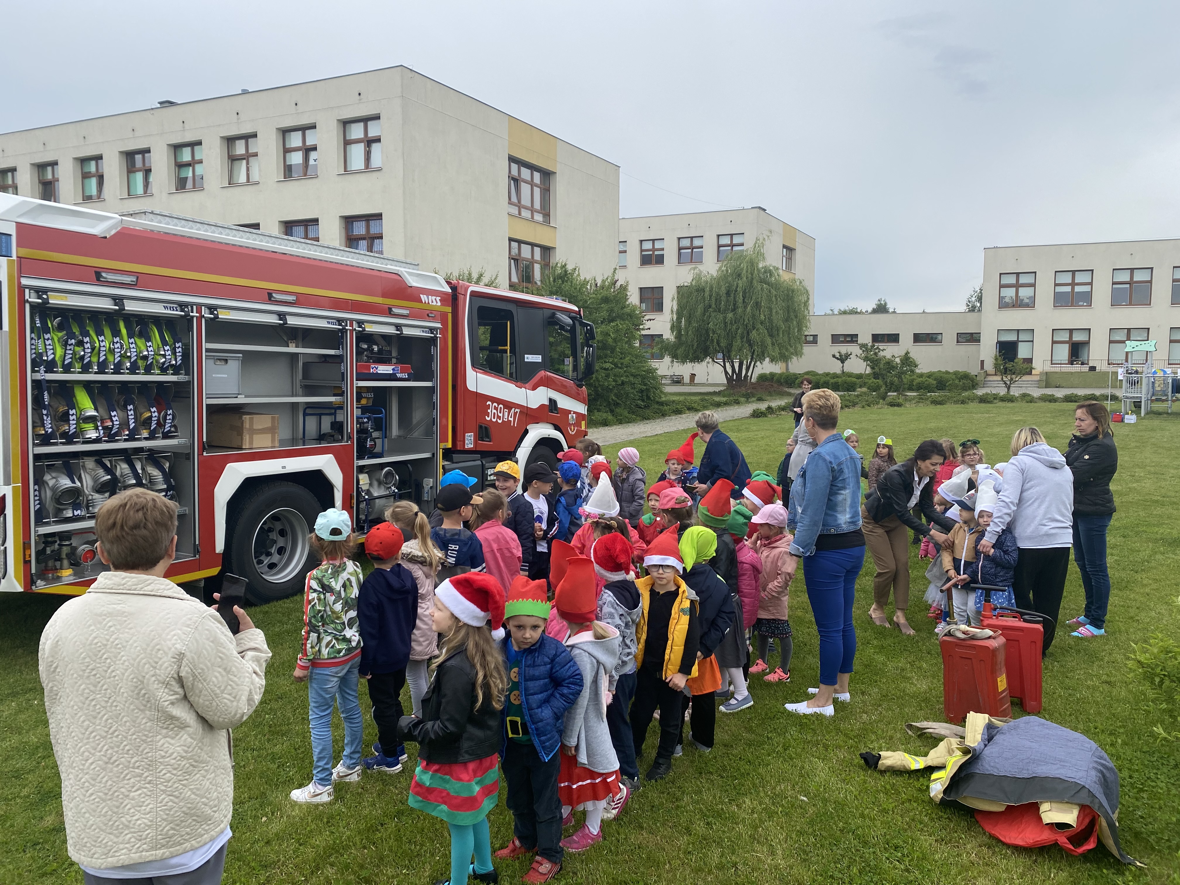 W ramach akcji "Kręci mnie bezpieczeństwo przez cały rok szkolny" zaprezentowano zawód strażaka, omówione zostały elementy umundurowania strażaka, pokazano samochód i sprzęt pożarniczy oraz przedstawiono sposoby zapobiegania zagrożeniom, z którymi dzieci mogą spotkać się w domu i w szkole.