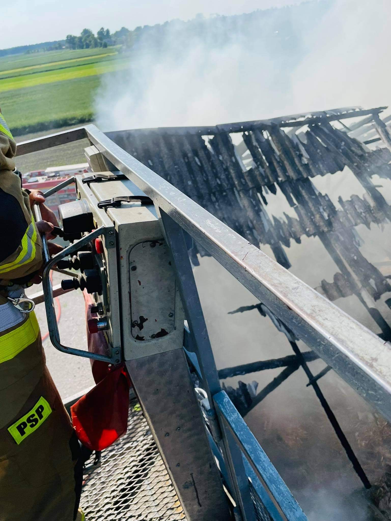 Działania straży polegały na zabezpieczeniu miejsca zdarzenia, ugaszeniu pożaru podając cztery prądy gaśnicze wody w natarciu w tym jeden z podnośnika hydraulicznego na palący się dach i ok. 30 bel słomy znajdującej się na poddaszu. W trakcie prowadzonych działań dokonano częściowej rozbiórki konstrukcji dachu, wyrzucano na zewnątrz słomę i dogaszano przelewając wodą. Pożar nie przedostał się do części parterowej. Podczas prowadzonych działań doszło do zniszczenia ok 1 ara kukurydzy i 1 ara rzepaku.