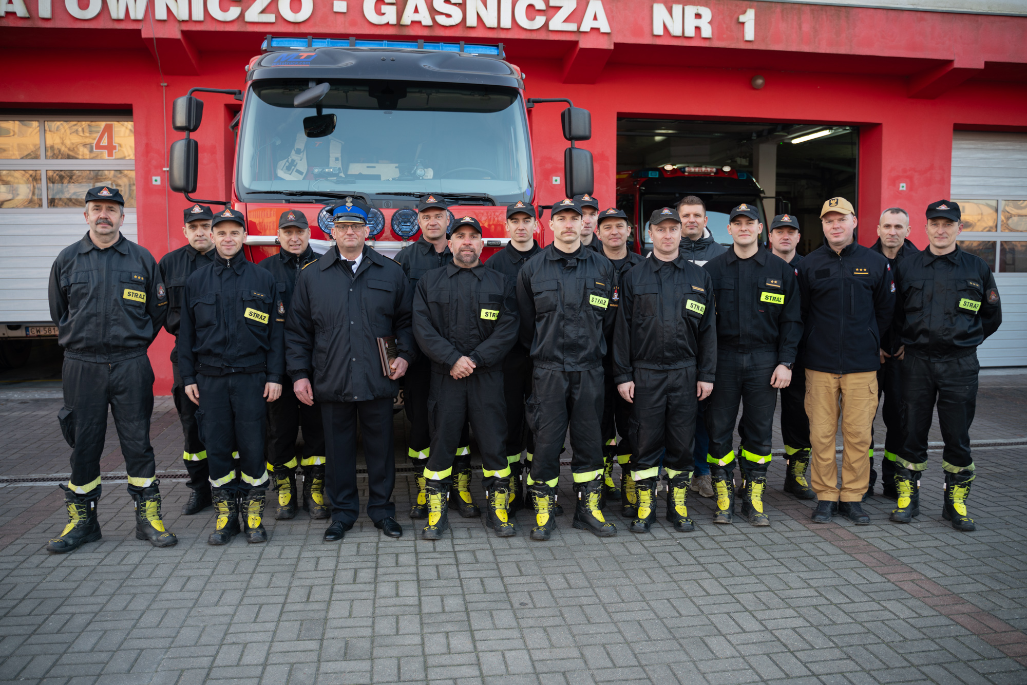 Podczas zmiany służby w Jednostce Ratowniczo-Gaśniczej nr 1 dowództwo jednostki bryg. Marcin Czerwiński i kpt. Maciej Kowalski wraz ze strażakami z Komendy Miejskiej PSP we Włocławku pożegnali odchodzącego na zaopatrzenie emerytalne strażaka ogn. Sebastiana Pilipa - starszego ratownika-kierowcę w JRG 1