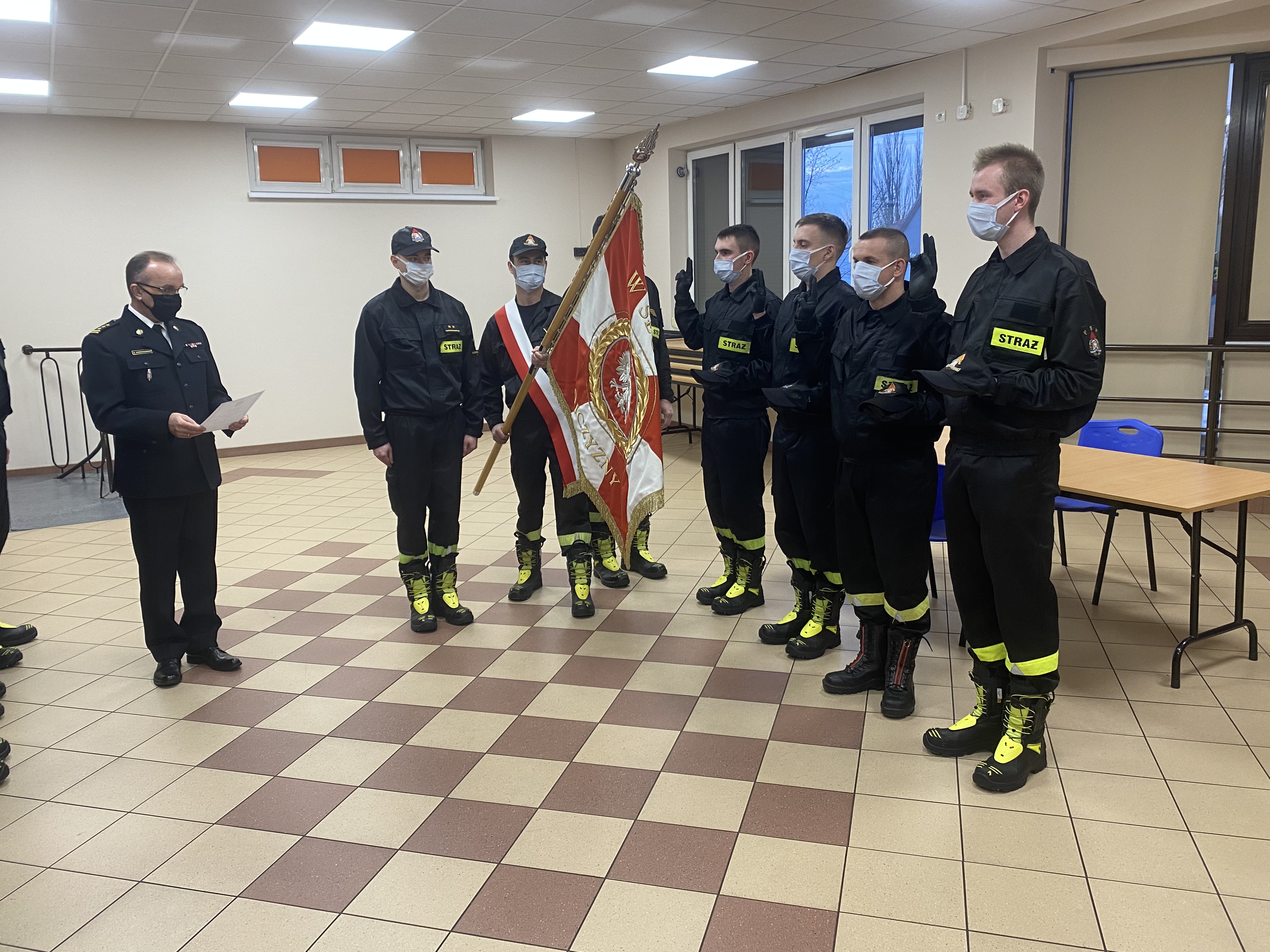Podczas zbiórki ślubowanie złożyli nowo przyjęci do służby strażacy: str. Konrad Kostrzewski, str. Bartłomiej Lipigórski, str. Kamil Wróblewski oraz str. Maciej Majewski.