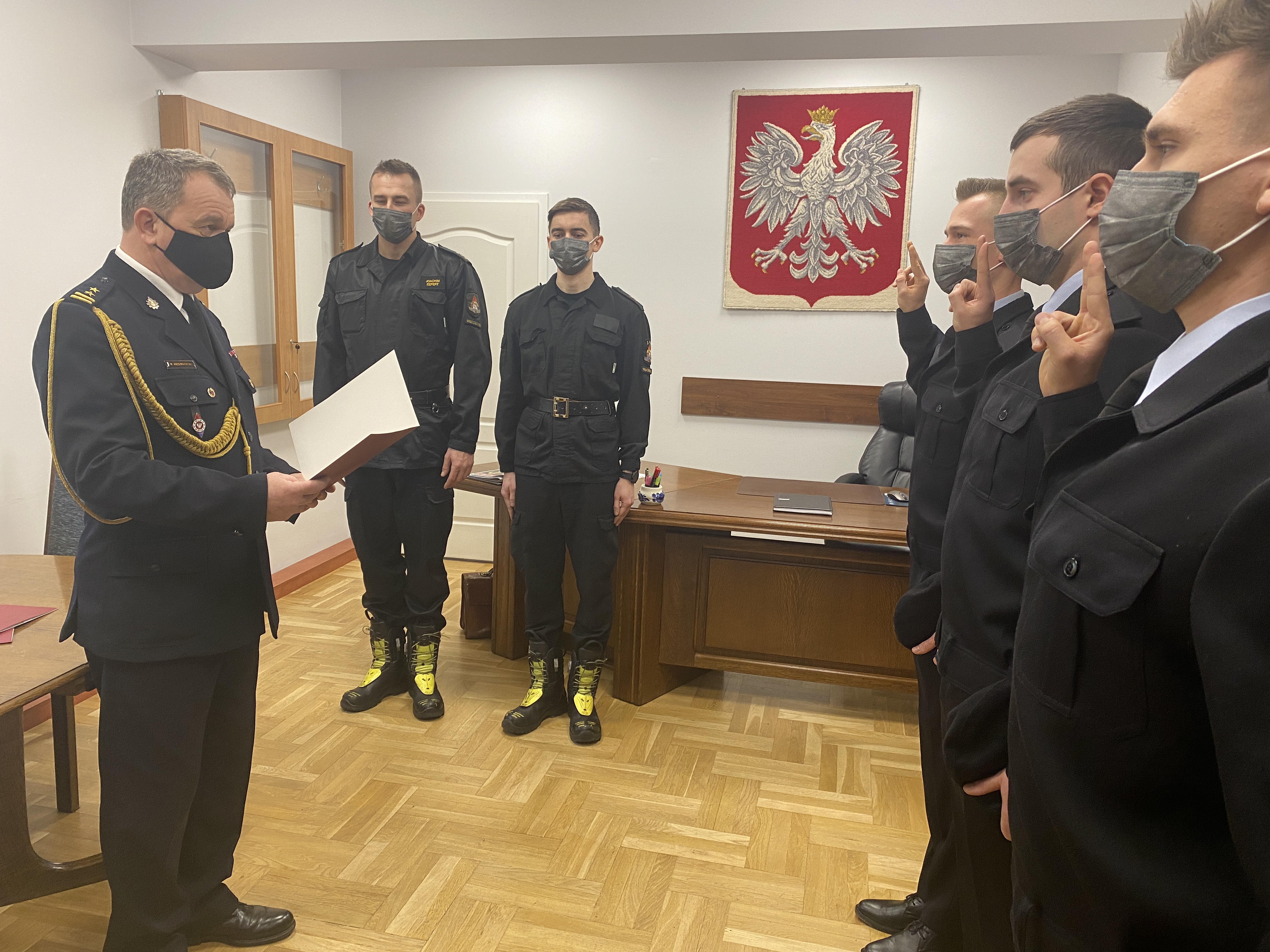 "Ja, obywatel Rzeczypospolitej Polskiej, świadom podejmowanych obowiązków strażaka, uroczyście ślubuję być ofiarnym i mężnym w ratowaniu zagrożonego życia ludzkiego i wszelkiego mienia - nawet z narażeniem życia. Wykonując powierzone mi zadania, ślubuję przestrzegać prawa, dyscypliny służbowej oraz wykonywać polecenia przełożonych. Ślubuję strzec tajemnic związanych ze służbą, a także honoru, godności i dobrego imienia służby oraz przestrzegać zasad etyki zawodowej."