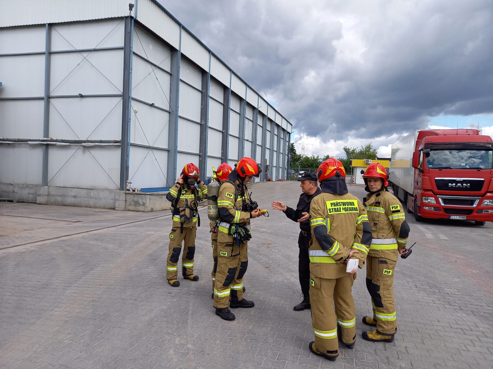 1. Sprawdzeniu pomieszczeń socjalnych i produkcyjnych przez strażaków ubranych w sprzęt OUO i wyposażonych w sprzęt pomiarowy. Detektory wskazały obecność tlenku węgla - 300ppm.