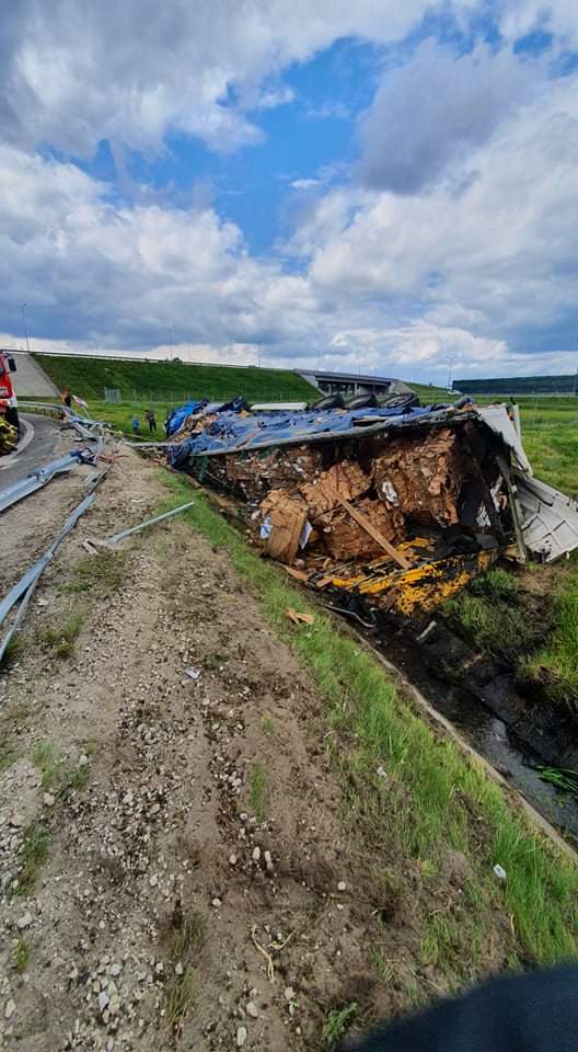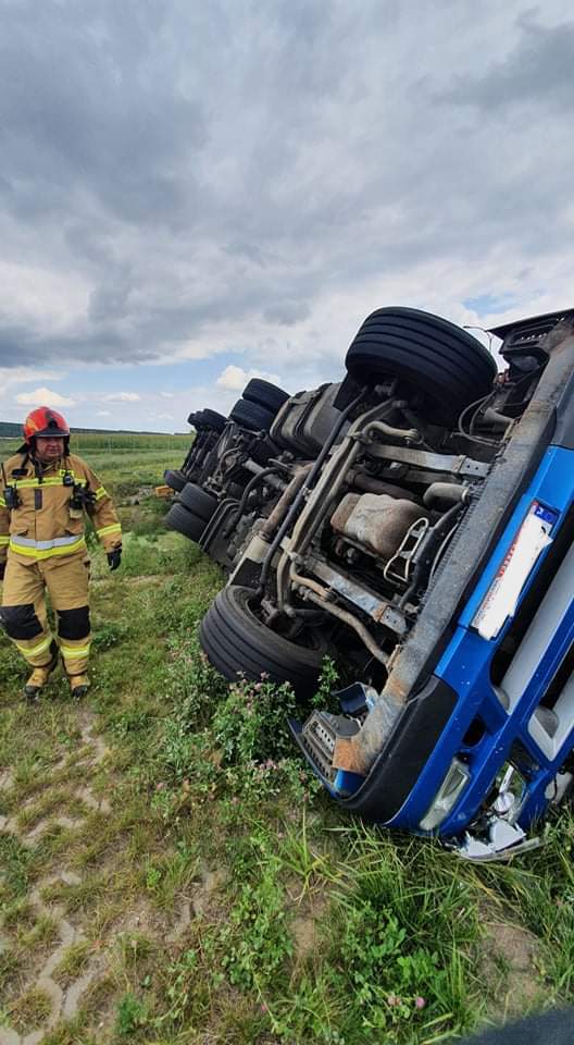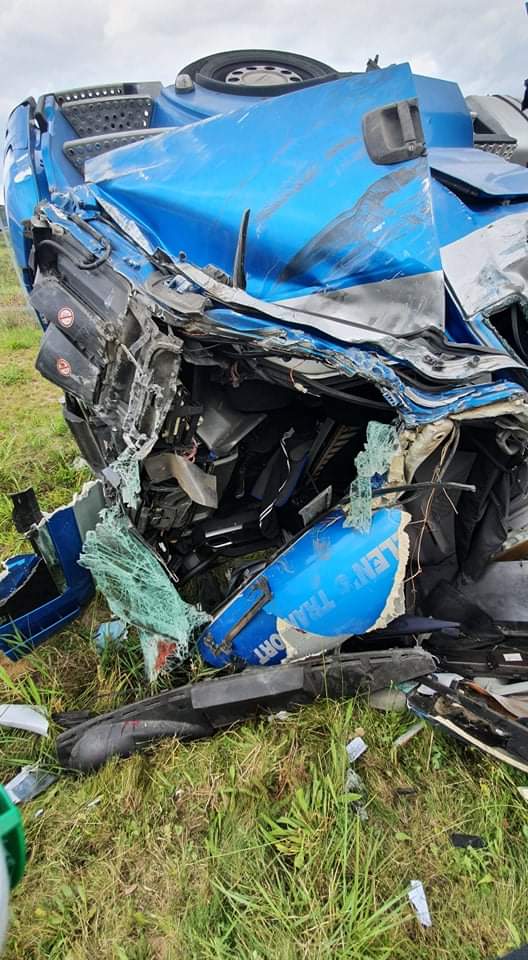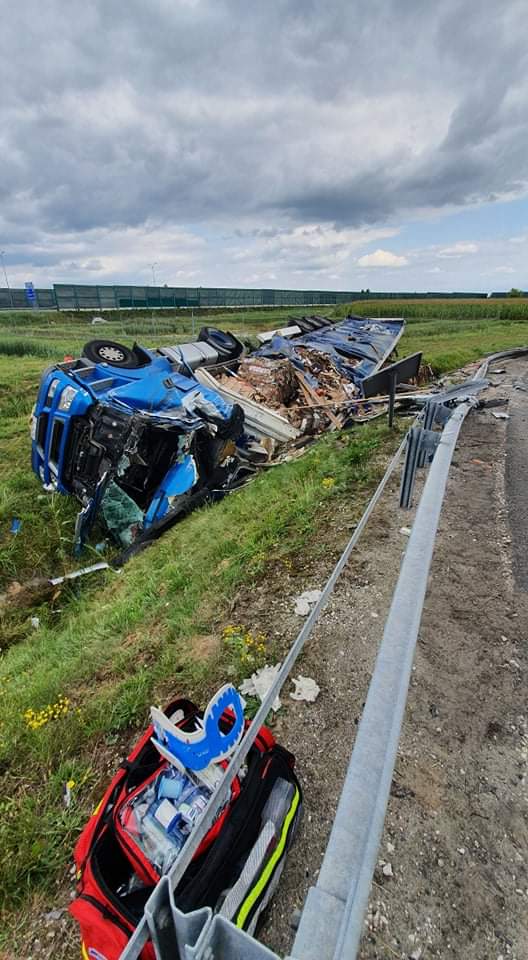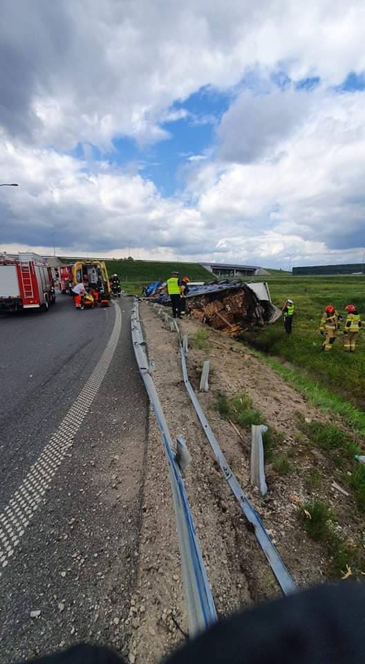 Pasażer wydostał się z pojazdu o własnych siłach i znajdował się pod opieką ZRM. Kierowca leżał przy kabinie ciężarówki. Był uwięziony przez plastikowe elementy karoserii pojazdu. Przy pomocy podręcznego sprzętu burzącego uwolniono go i przekazano ZRM. Decyzją ratownika medycznego obydwaj zostali przewiezieni do szpitala. Odłączono akumulatory w pojeździe. Sprawdzono czy nie doszło do wycieków oleju silnikowego i napędowego - brak zagrożeń. Podczas działań ruch na drodze dojazdowej do A1 był wstrzymany.