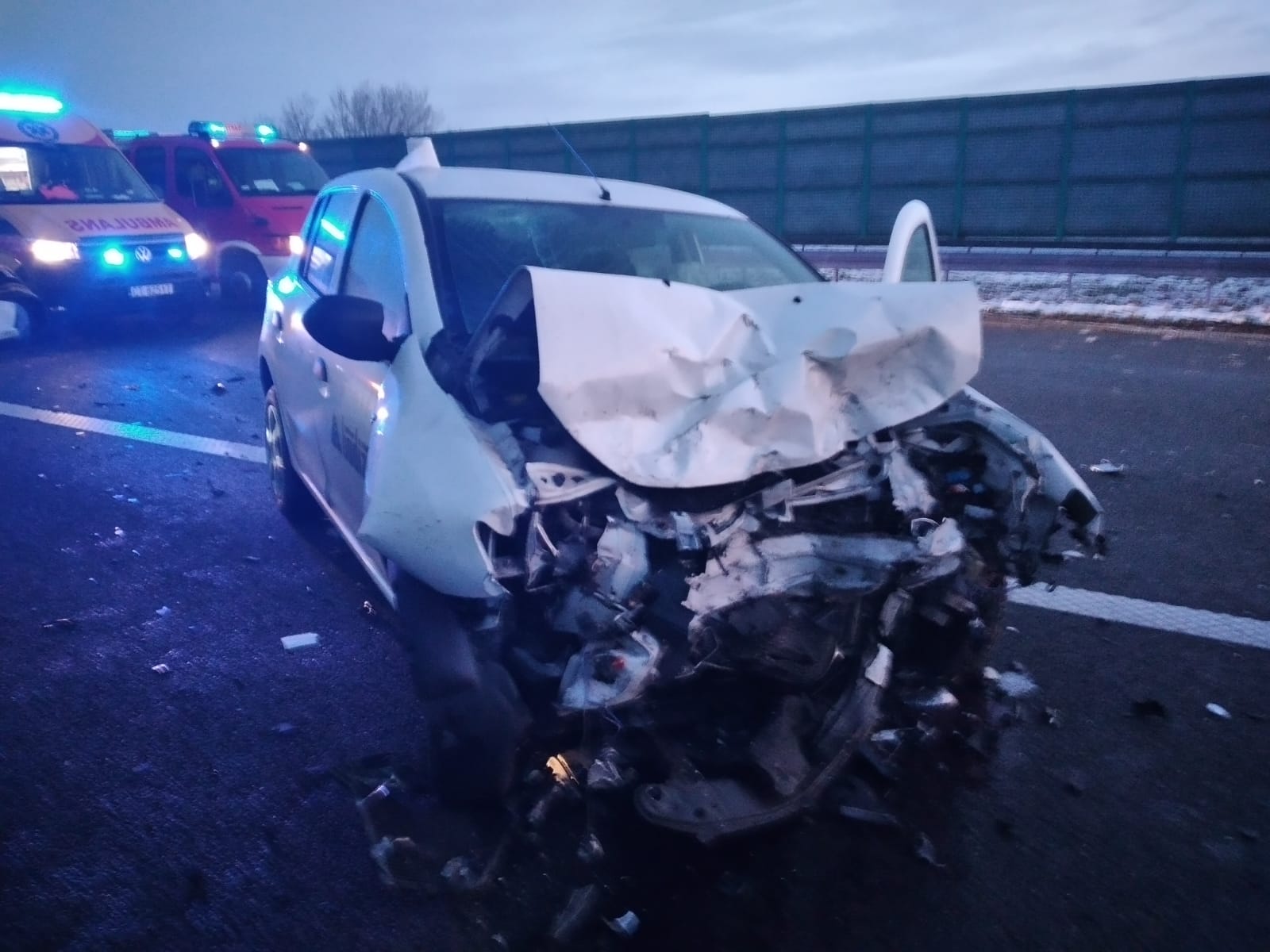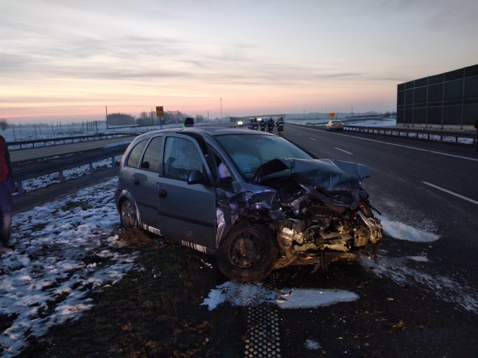 Samochody osobowe Dacia oraz Opel zatrzymały się w miejscu zdarzenia na pasach ruchu autostrady A1 w kierunku Łodzi. W odległości około 200 metrów po lewej stronie jezdni stał Mercedes Sprinter, którym podróżowało dwóch mężczyzn. Osoby samodzielnie opuściły pojazd, nie odnieśli obrażeń. Przybyły przed zastępami Jednostek Ochrony Przeciwpożarowej (JOP) zespół Pogotowia Ratunkowego (PRM) udzielał pomocy medycznej osobom przebywającym w samochodzie Dacia. Istniała możliwość ewakuacji poszkodowanych z pojazdu po ręcznym otworzeniu drzwi przednich. Mężczyzna i kobieta zostali przeniesieni przez ratowników JOP do przybyłych zespołów PRM. Po przebadaniu na miejscu działań poszkodowani (przytomni) zostali zabrani do szpitala. Z informacji uzyskanej od ratownika medycznego PRM na miejscu działań po przebadaniu pozostał kierujący Opla Merivy. Droga podczas działań była nieprzejezdna. Przybyła na miejsce działań obsługa GDKiA zabezpieczyła i oznakowała teren. Działania JOP polegały na zabezpieczeniu pojazdów, odłączeniu akumulatorów. Przy użyciu sprzętu burzącego (łom) dokonano stłuczenia szyby tylnej w Oplu Merivie i zakręcono zawór butli LPG znajdującej się w przedziale bagażowym. Opel Meriva przewoził farbę w ilości 60 litów oraz klej do tapet, natomiast Mercedes Sprinter odzież w przedziale bagażowym. W trakcie działań przy użyciu liny holowniczej zaczepionej do pojazdu JOP przemieszczono pojazdy Opel i Dacia na pas zieleni oddzielający kierunki jazdy na autostradzie A1. Jezdnia została uprzątnięta przez firmę sprzątającą z rozbitych elementów pojazdów oraz przywrócono ruch drogowy na prawym pasie drogi. Działania zakończono, mieksce zdarzenia zabezpieczono.