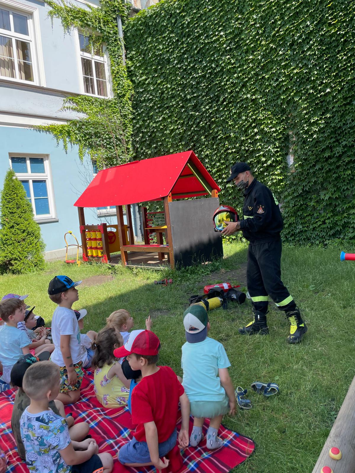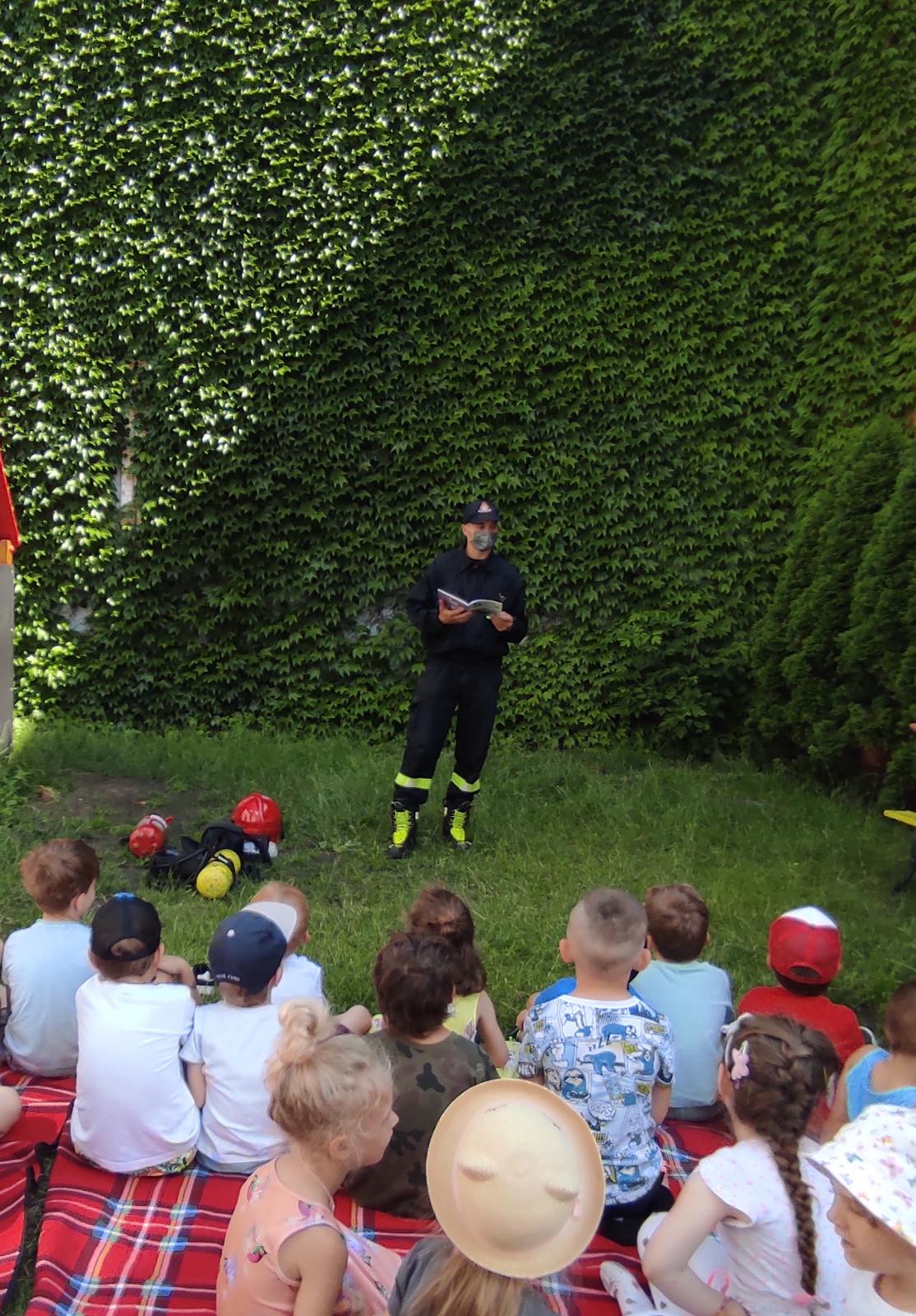 W ramach prowadzonej przez przedszkole kampanii edukacyjnej "Kim będę jak dorosnę", przy okazji wizyty jeden ze strażaków mł. asp. Przemysław Walczak przeczytał dzieciom krótką historyjkę.
