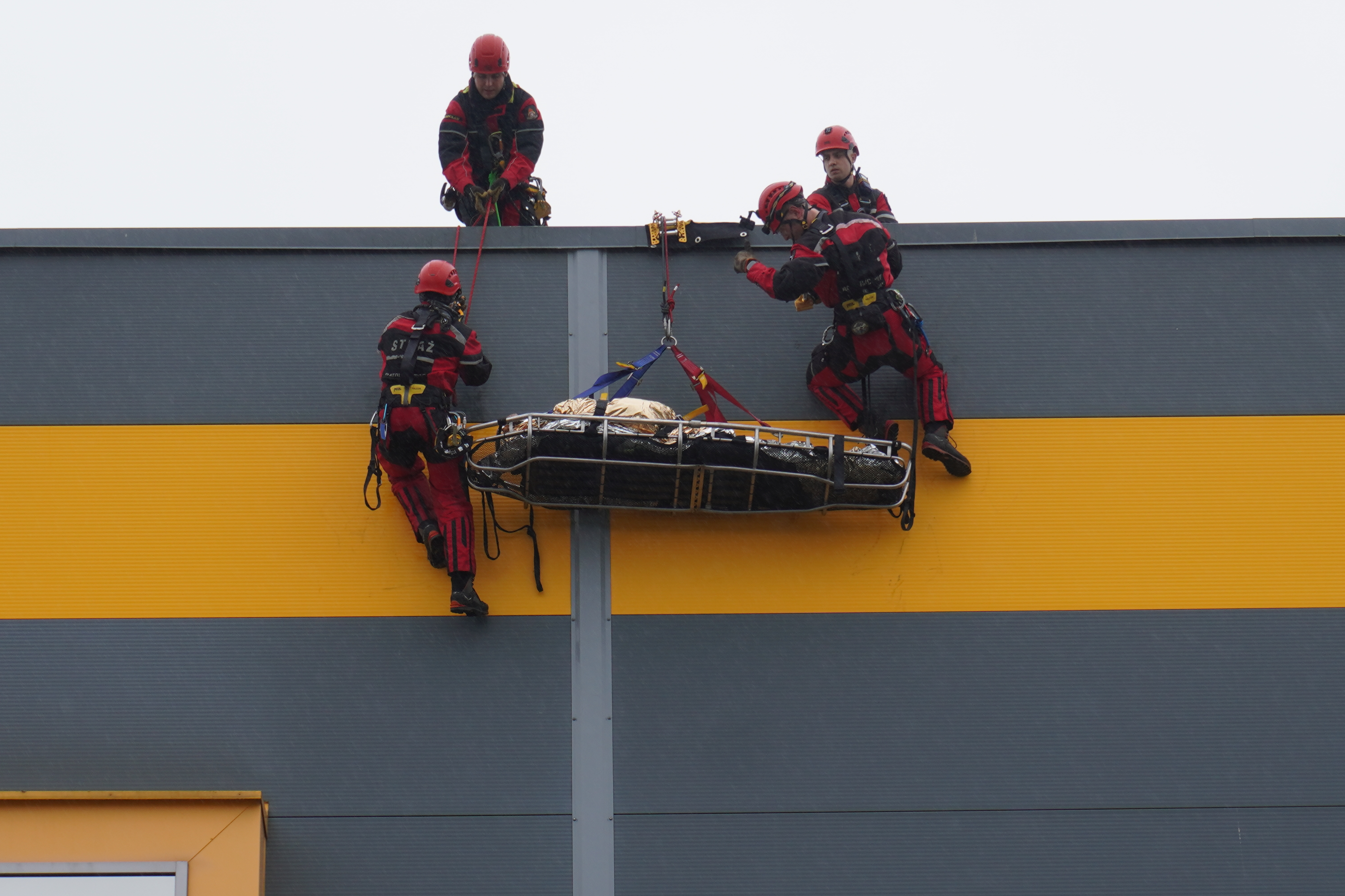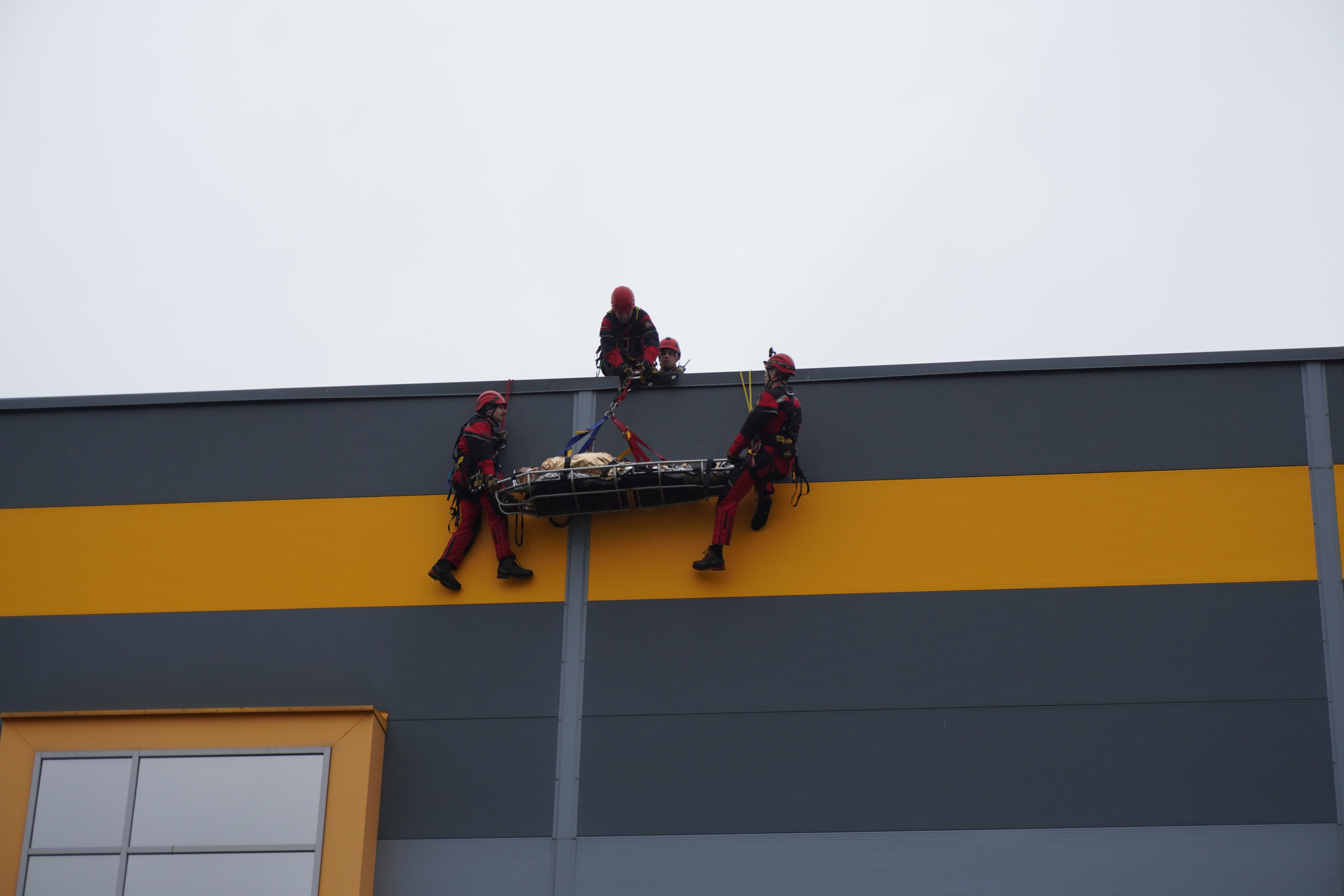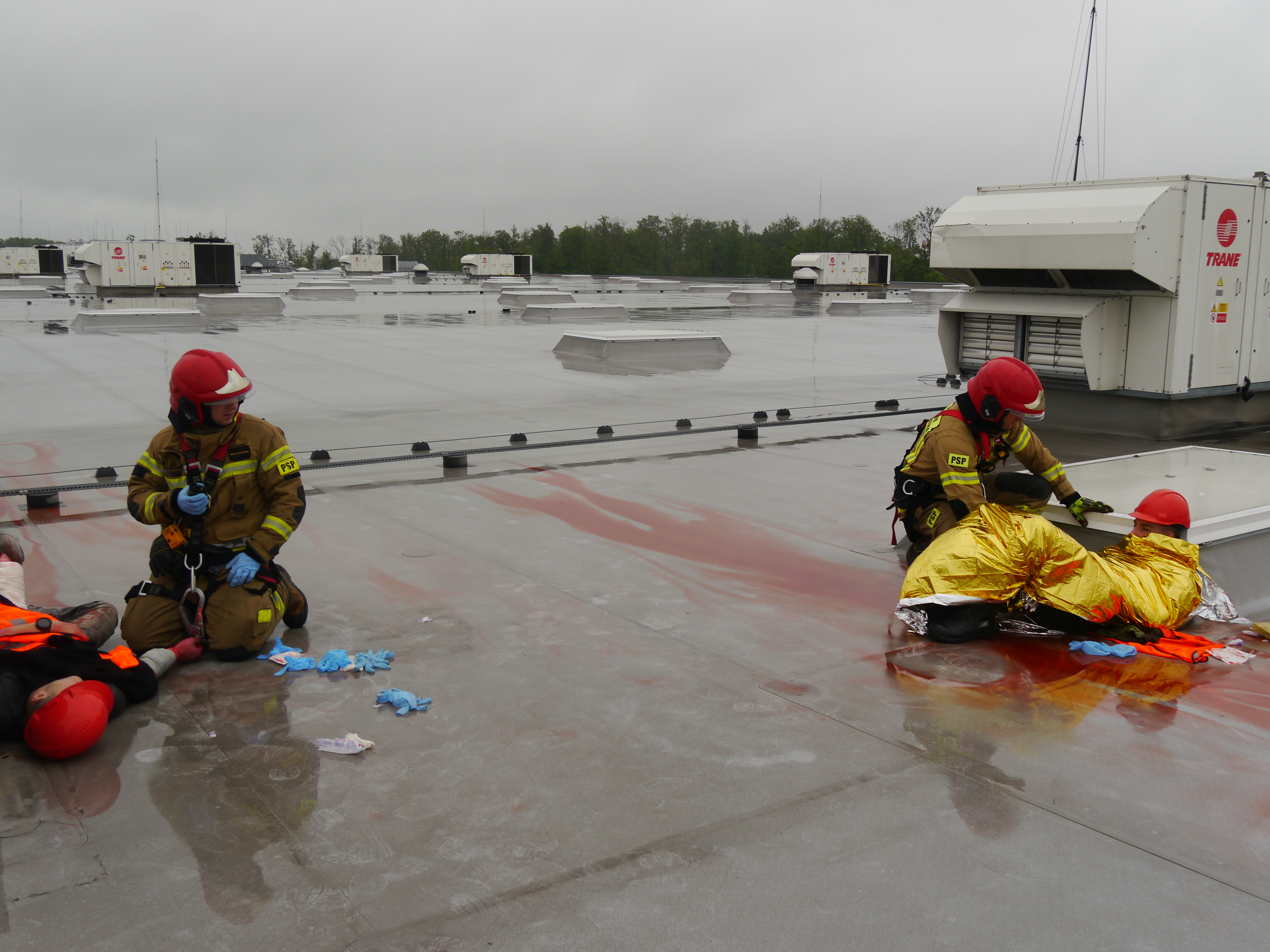 W czasie prowadzonej KPP osób poszkodowanych i rozpoznania przez SGRChem doszło do kolejnego incydentu, w którym agresywny mężczyzna poranił nożem dwie osoby znajdujące się na dachu hali. Po obezwładnieniu agresora przez Policjantów i udzieleniu KPP poszkodowanym zaistniała konieczność ewakuacji tych osób z dachu za pomocą technik linowych. Dlatego też KDR podjął decyzję o zadysponowaniu na miejsce zdarzenia SGRW „Wrocław 9”.