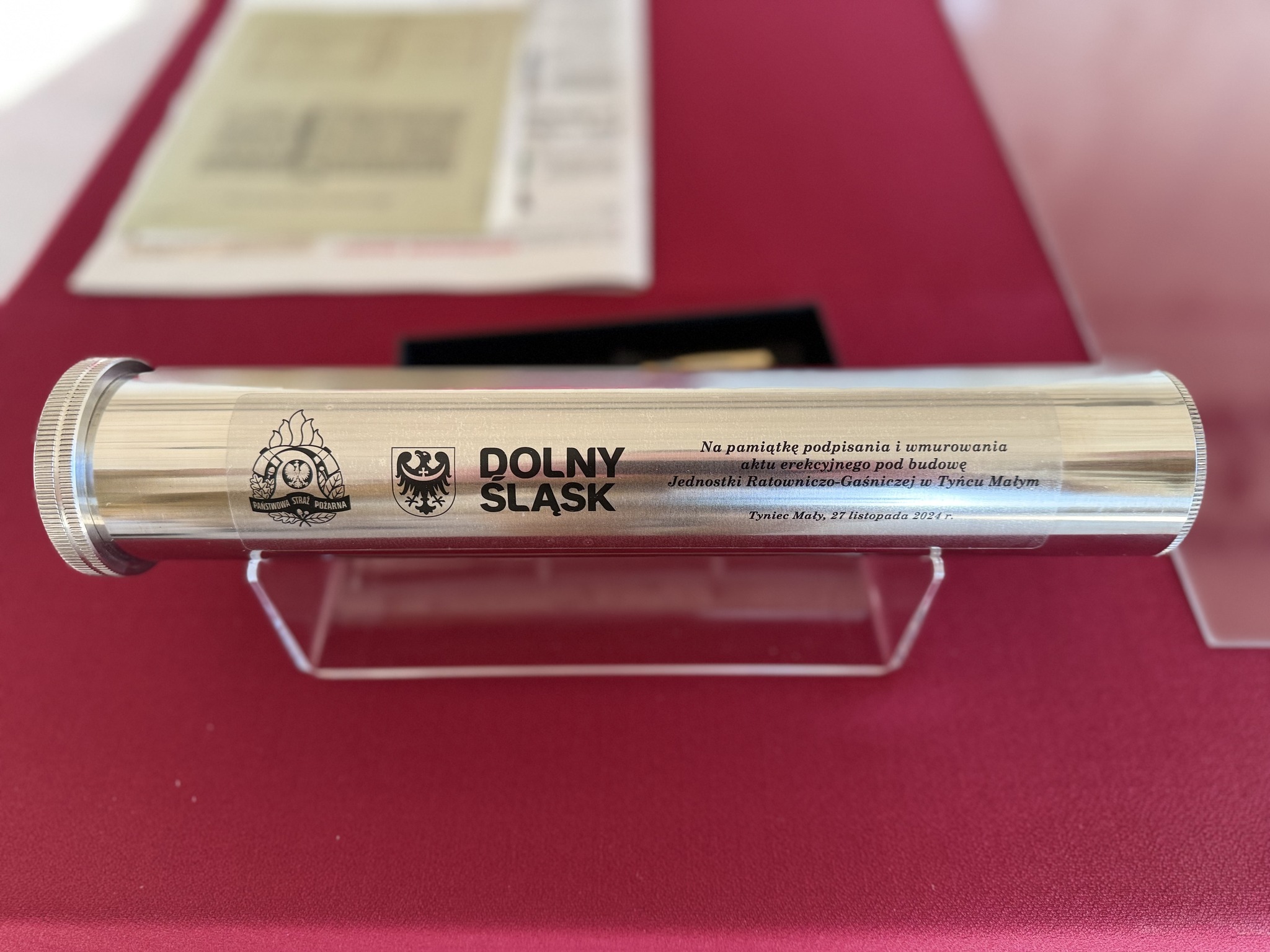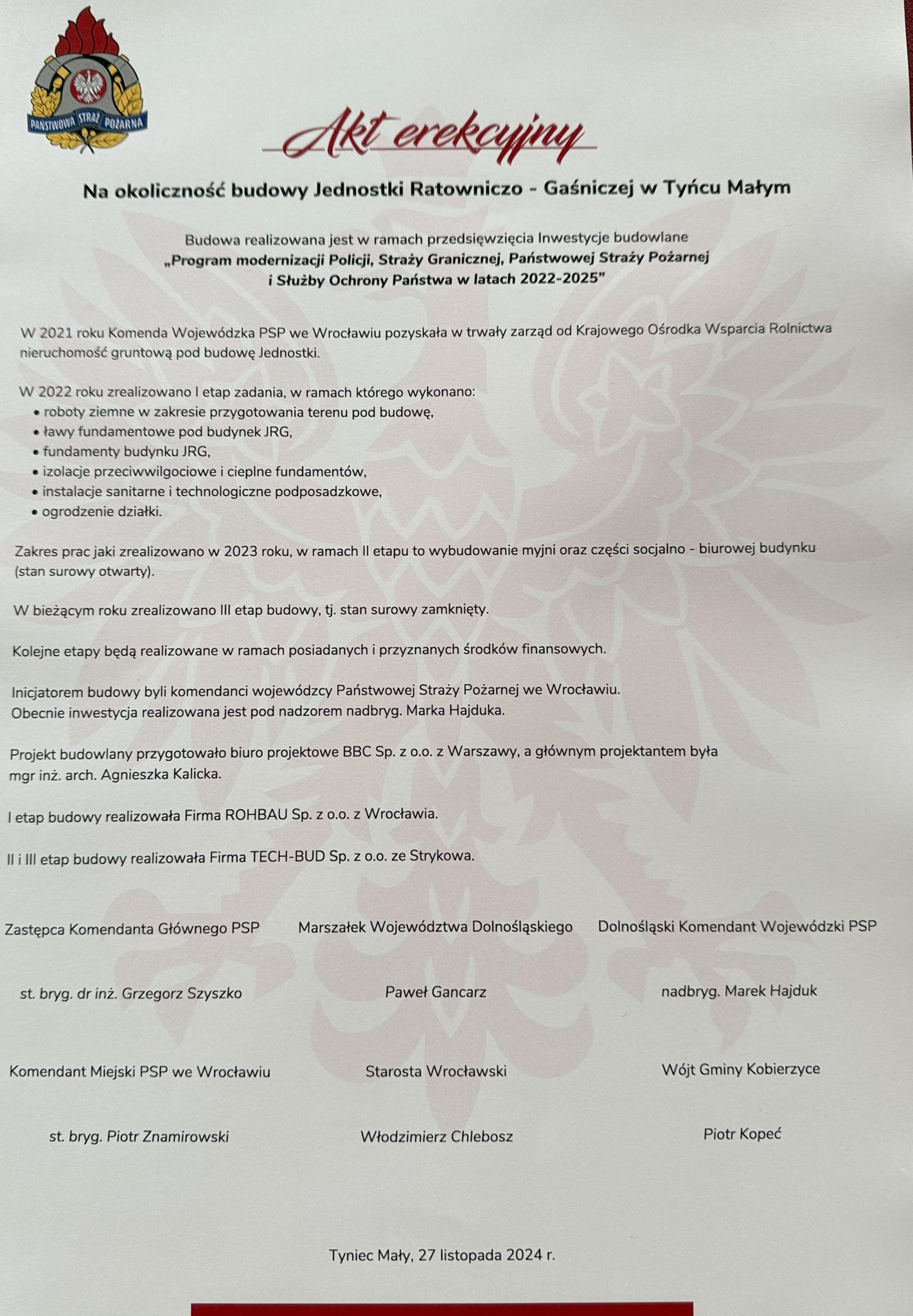 W dniu 27 listopada 2024 r. odbyła się uroczystość podpisania aktu erekcyjnego i wmurowania kamienia węgielnego pod budowę nowego obiektu Jednostki Ratowniczo-Gaśniczej w Tyńcu Małym.