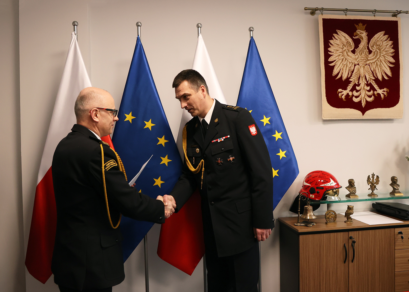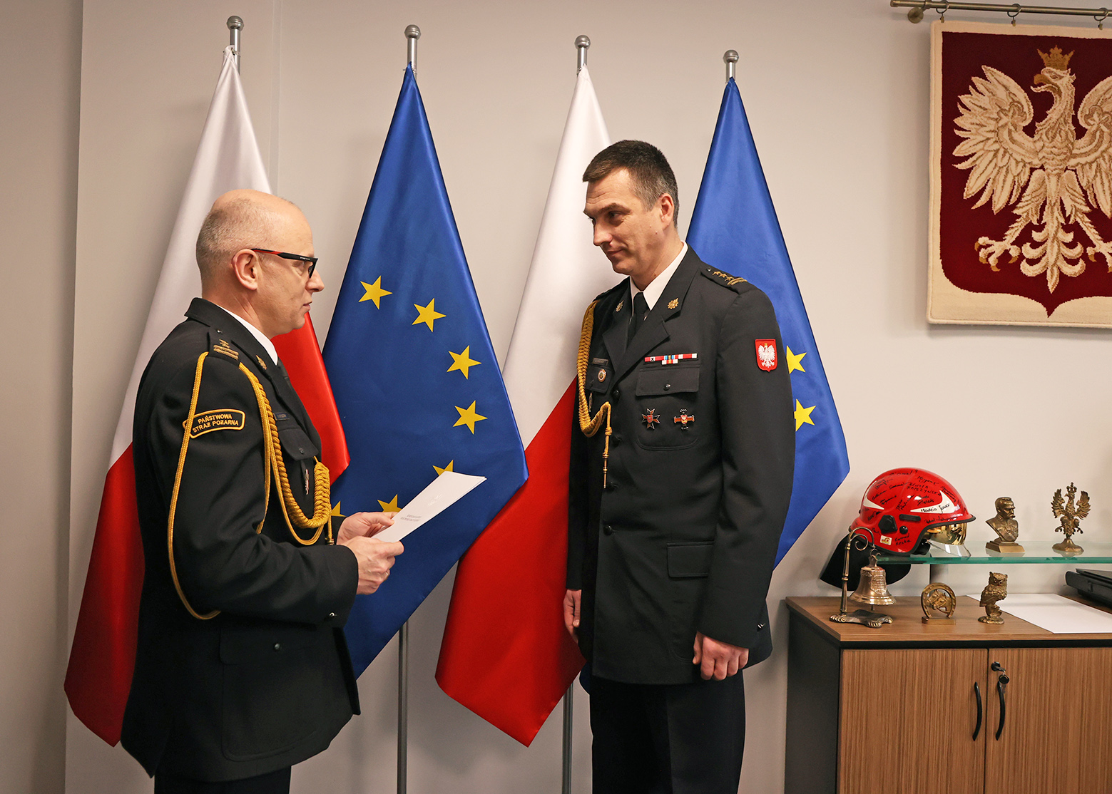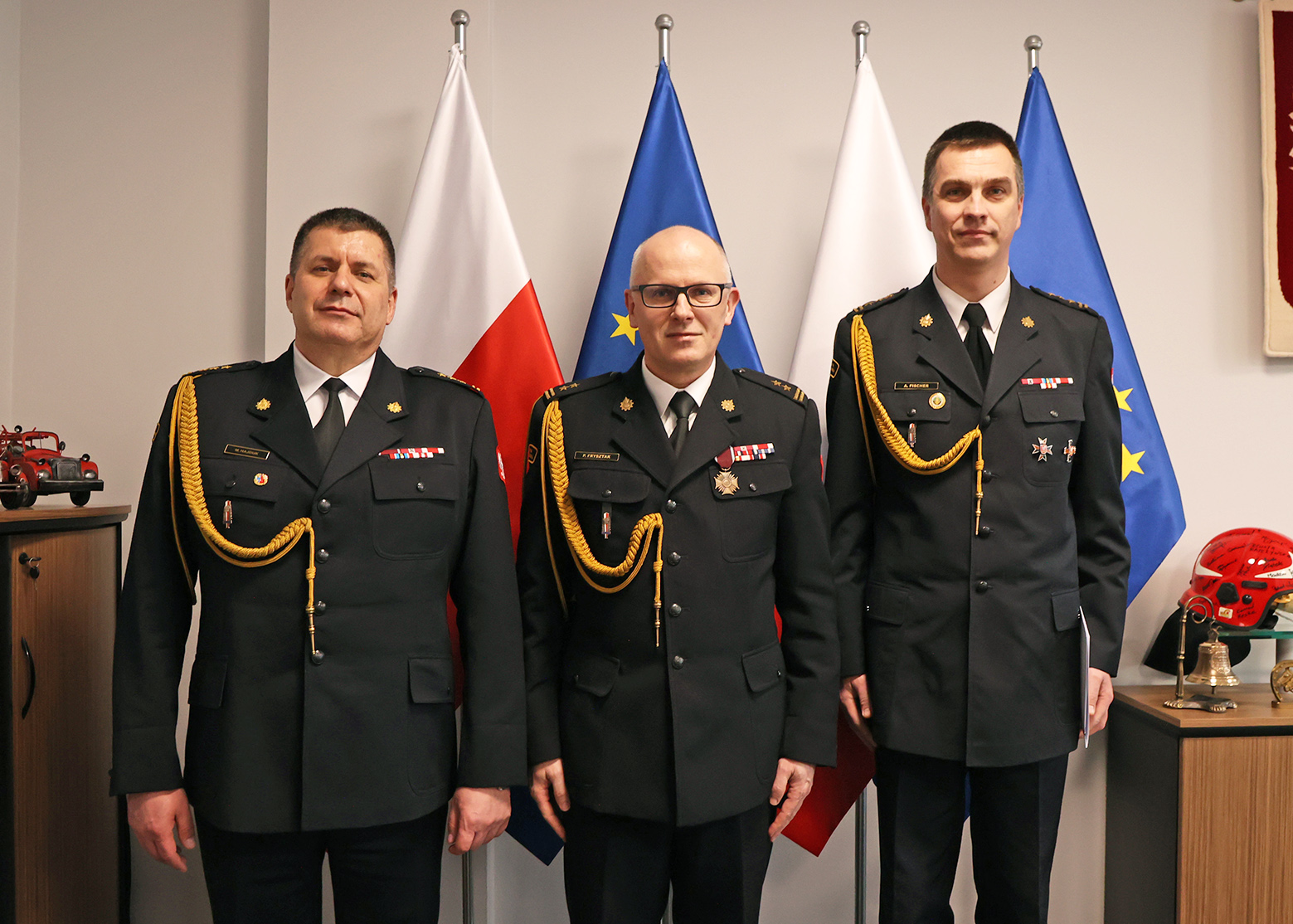 Wręczenie decyzji odbyło się w dniu dzisiejszym tj. 28.02.2024 r. przez Zastępcę Komendanta Głównego Państwowej Straży Pożarnej bryg. Pawła Frysztaka w siedzibie Komendy Głównej. W uroczystości uczestniczył Dolnośląski Komendant Wojewódzki st. bryg. Marek Hajduk.