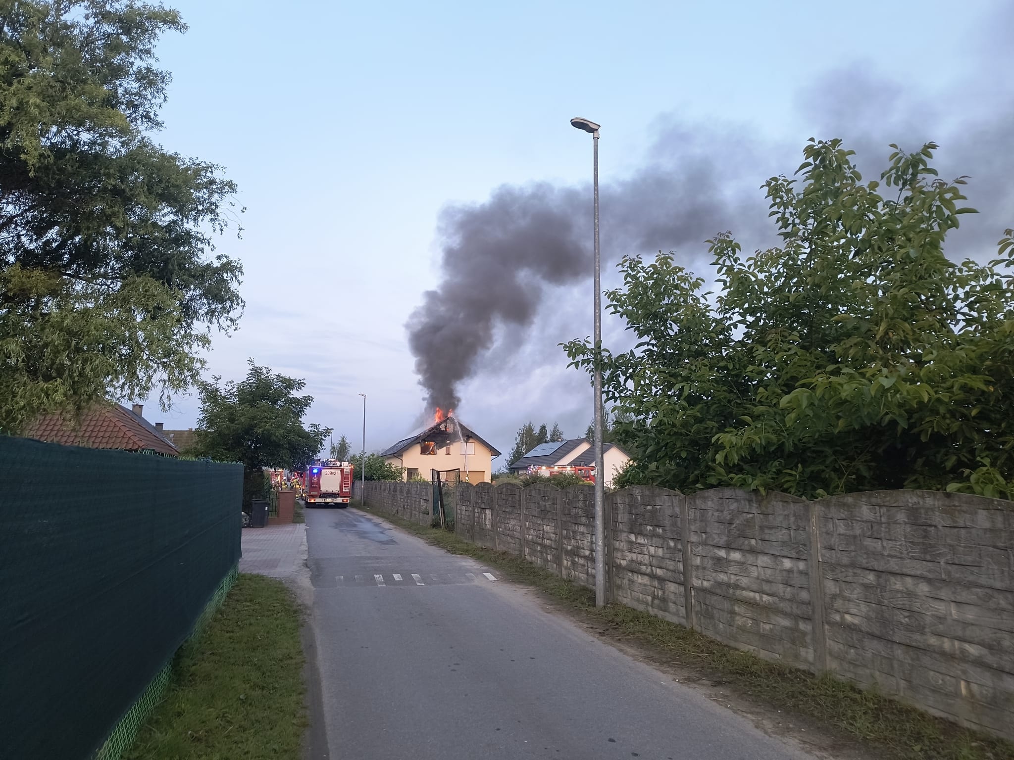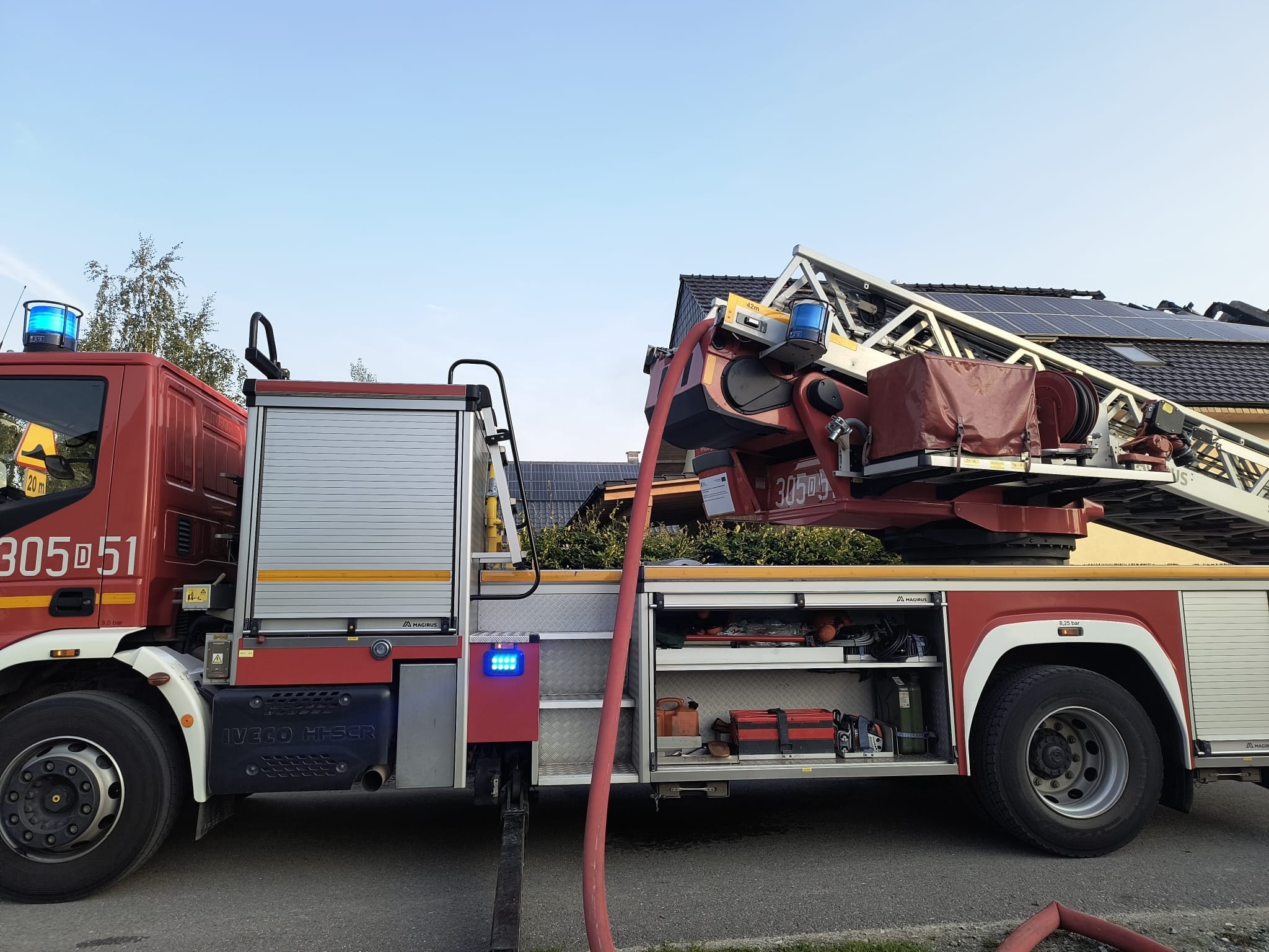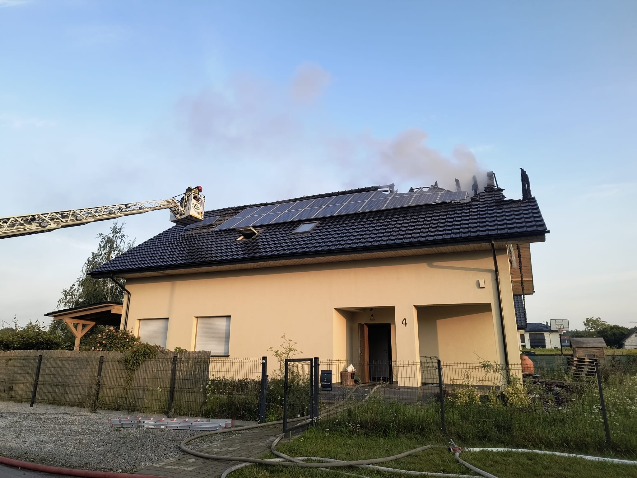 W dniu 07.08.2025 o godz. 04:59 – Stanowisko Kierowania Komendanta Miejskiego PSP we Wrocławiu otrzymało zgłoszenie o pożarze budynku jednorodzinnego. Pożarem objęte zostały dach oraz poddasze budynku, na którym znajdowały się panele fotowoltaiczne.