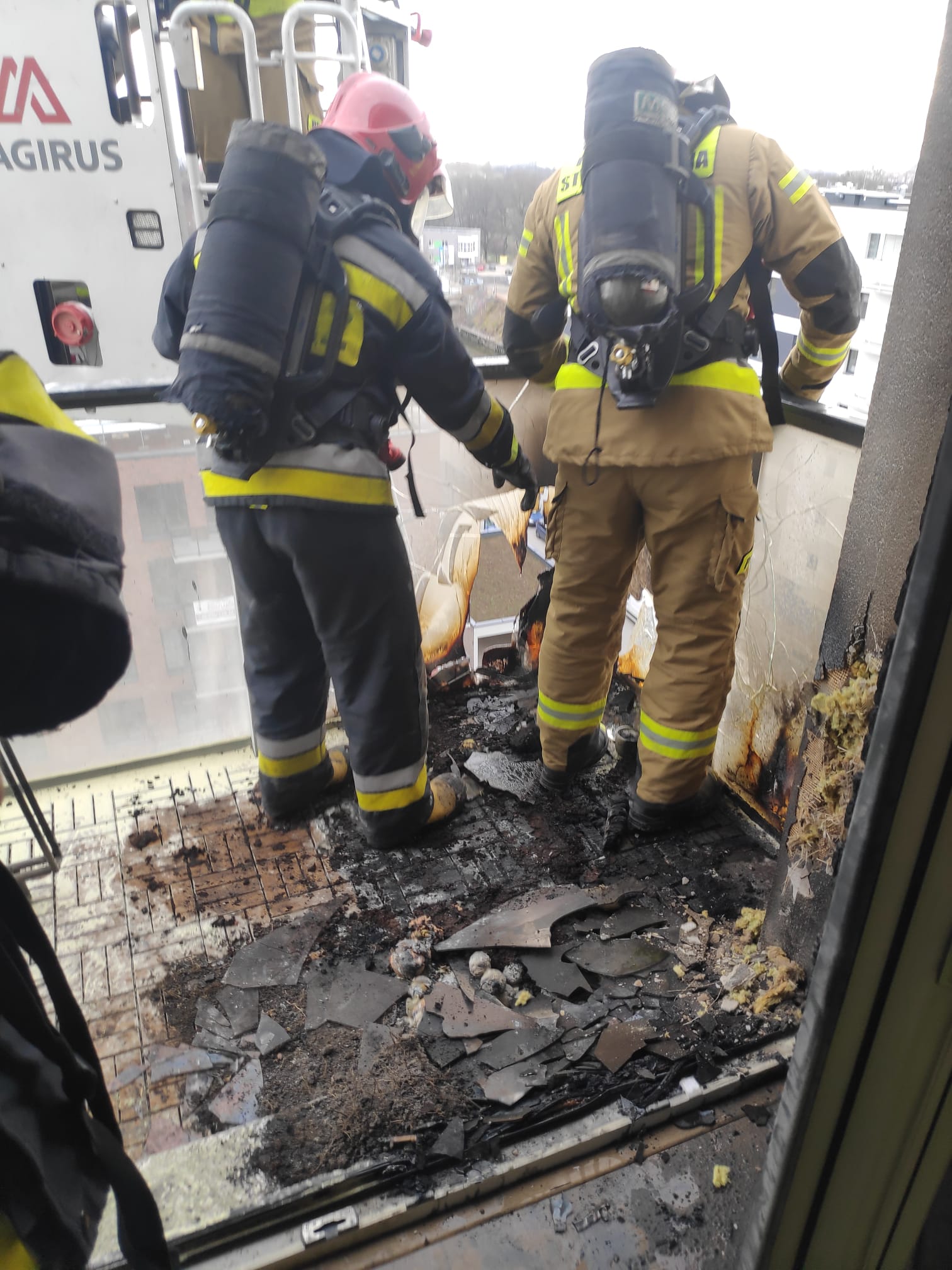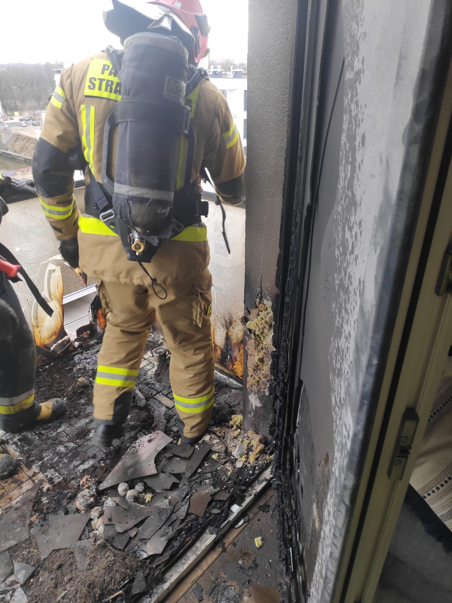 Po przybyciu na miejsce zdarzenia, Kierujący Działaniem Ratowniczym ustalił, że w mieszkaniu na 8 piętrze palą się meble na balkonie. W celu ugaszenia pożaru podany został prąd wody z drabiny mechanicznej do całkowitego ugaszenia pożaru. Pogorzelisko zostąo sprawdzone kamerą termowizyjna w celu wykluczenia ukrytych zarzewi ognia.