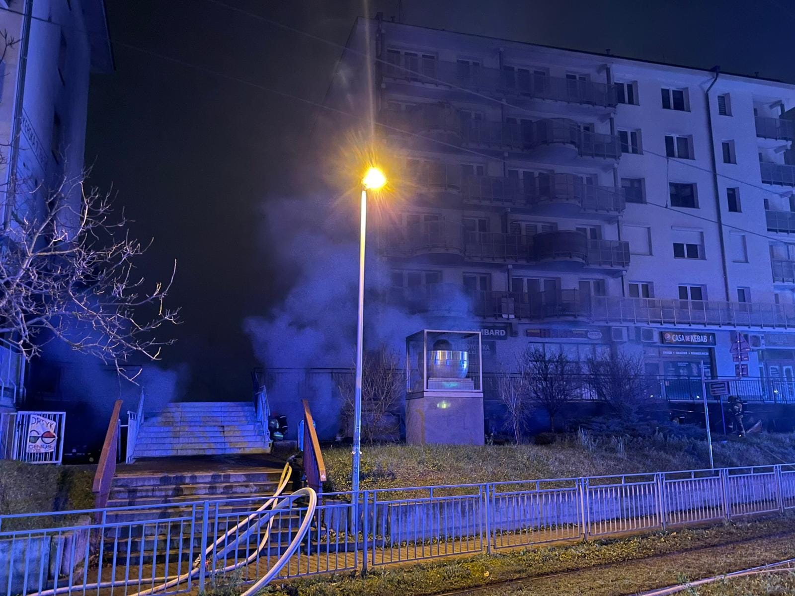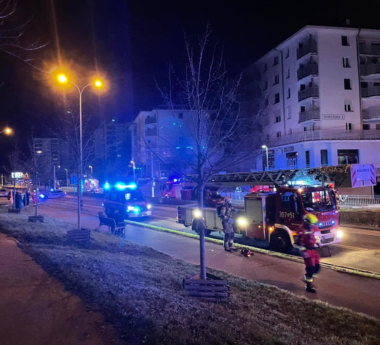 W dniu 18 grudnia około godzinyu 01:56 Stanowisko Kierowania Komendy Miejskiej Państwowej Straży Pożarnej otrzymało zgłoszenie o pożarze w garażu podziemnym na ulicy Dokerskiej. Pożarem objęty był cały garaż. Do zdarzenia zostały zadysponowane zastępy PSP: z JRG-7, JRG-4, JRG-3, JRG-8 oraz OSP GRS Starówka. Z budynku ewakuowało się łącznie 55 osób. W wyniku pożaru jedna osoba uskarżała się na dolegliwości zwiazane z krótkim przebywaniem w zadymieniu i została przebadana przez Zespół Ratownictwa Medycznego. Na czas prowadzenia działań ruch na torowisku i na drodze został wstrzymany. Akcja ratowniczo - gaśnicza zakończyła się około godz. 8.00 rano.