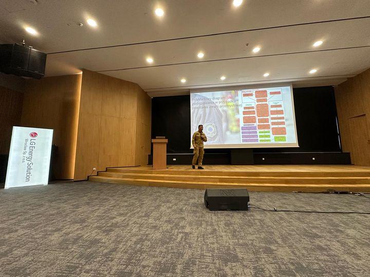 W dniu 24.04.2023 r. funkcjonariusze Komendy Miejskiej PSP we Wrocławiu ze Specjalistycznej Grupy Ratownictwa Chemiczno - Ekologicznego Wrocław-3 brali udział w "SAFETY DAY 2024" realizowany przez LG Energy Solution Wrocław Sp. z o.o. Szkolenie było przeznaczone dla menadżerów i kierowników odpowiedzialnych za zapewnienie bezpieczeństwa procesowego oraz prewencję w przypadku sytuacji mogących prowadzić do zdarzeń mających znamiona awarii . Funkcjonariusze przeprowadzili prelekcję, w której zostały poruszone takie zagadnienia jak: struktury PSP ze szczegółowym opisem ratownictwa chem-eko na poziomie specjalistycznym, rodzaje oraz klasyfikację zagrożeń z udziałem substancji niebezpiecznych, a także przykładowe schematy postępowania pracowników w sytuacji powstania pożaru lub awarii przemysłowej. Po przeprowadzonym wykładzie strażacy zademonstrowali specjalistyczny sprzęt znajdujących się na zastępie rozpoznania chemicznego.