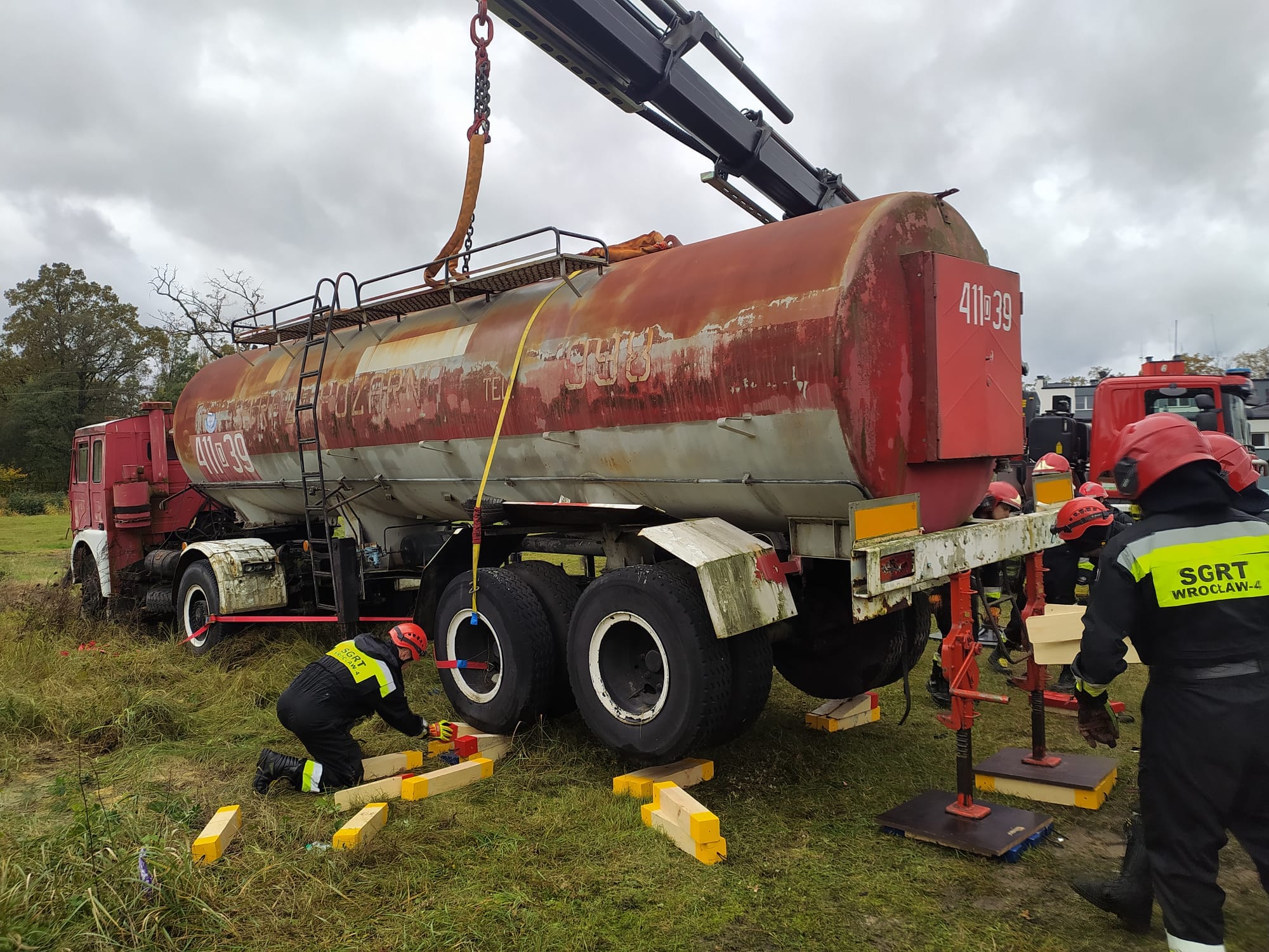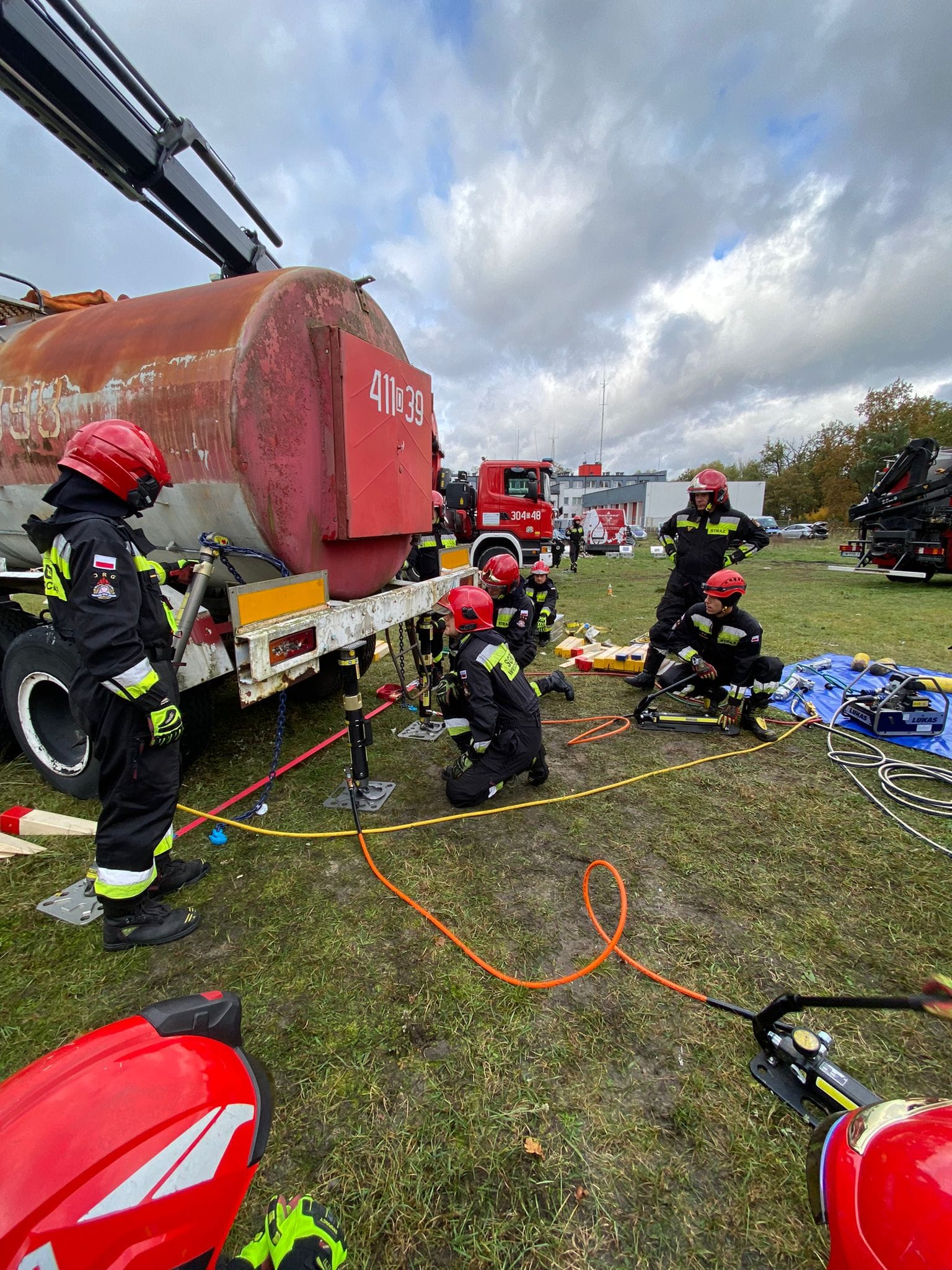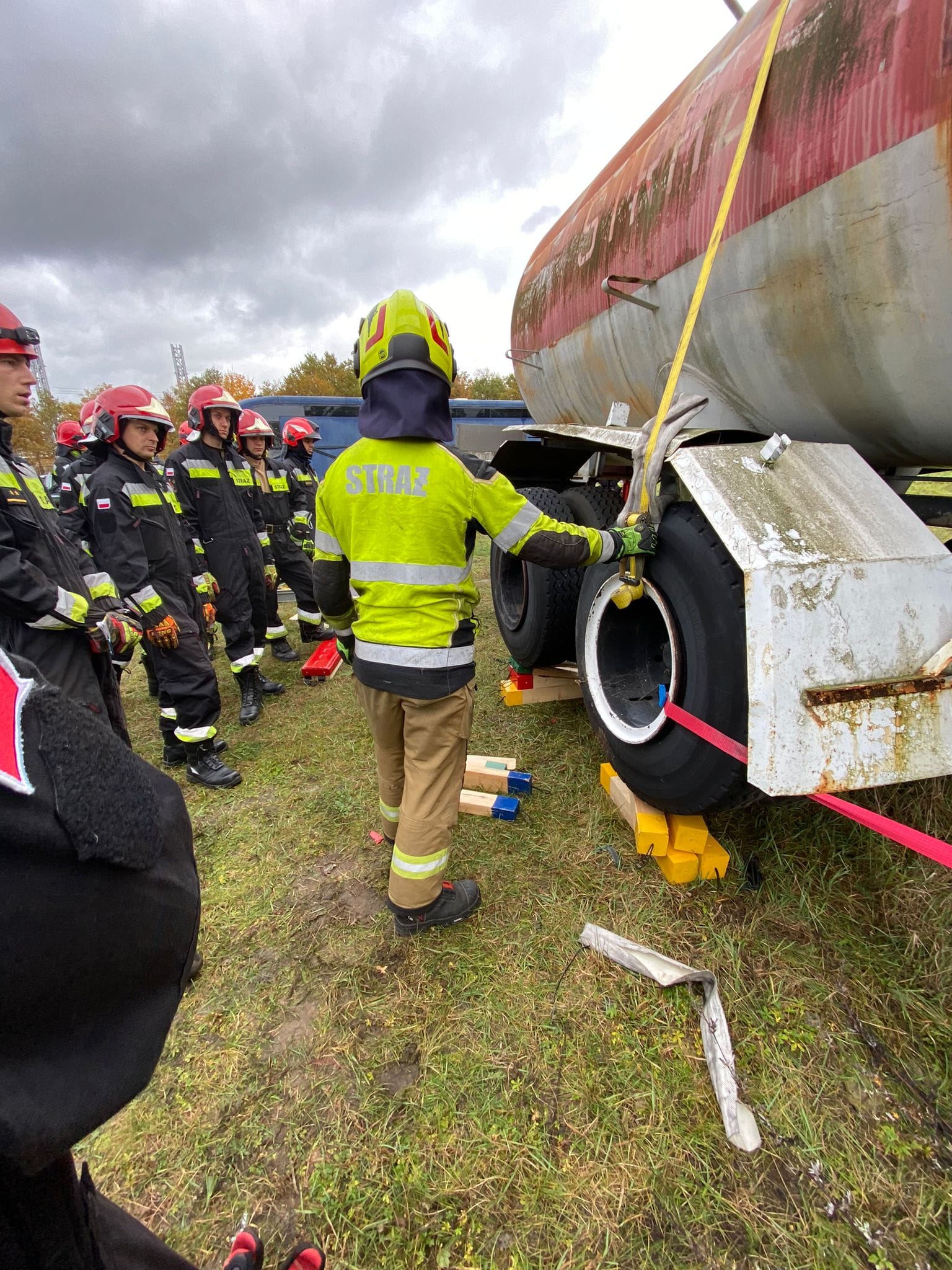 Kolejny dzień ćwiczeń to doskonalenie technik stabilizacji podnoszenia, na zestawie pojazdów ciągnik siodłowy z naczepą typu cysterna. Dzięki uprzejmości firmy Kadimex, strażacy mieli również możliwość przetestowania zestaw podpór do stabilizacji firmy Paratech.