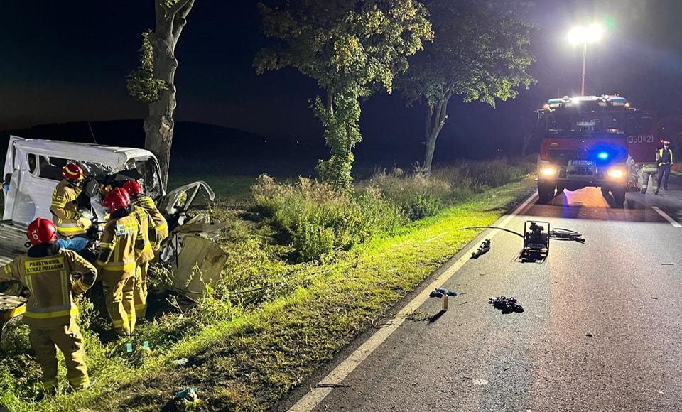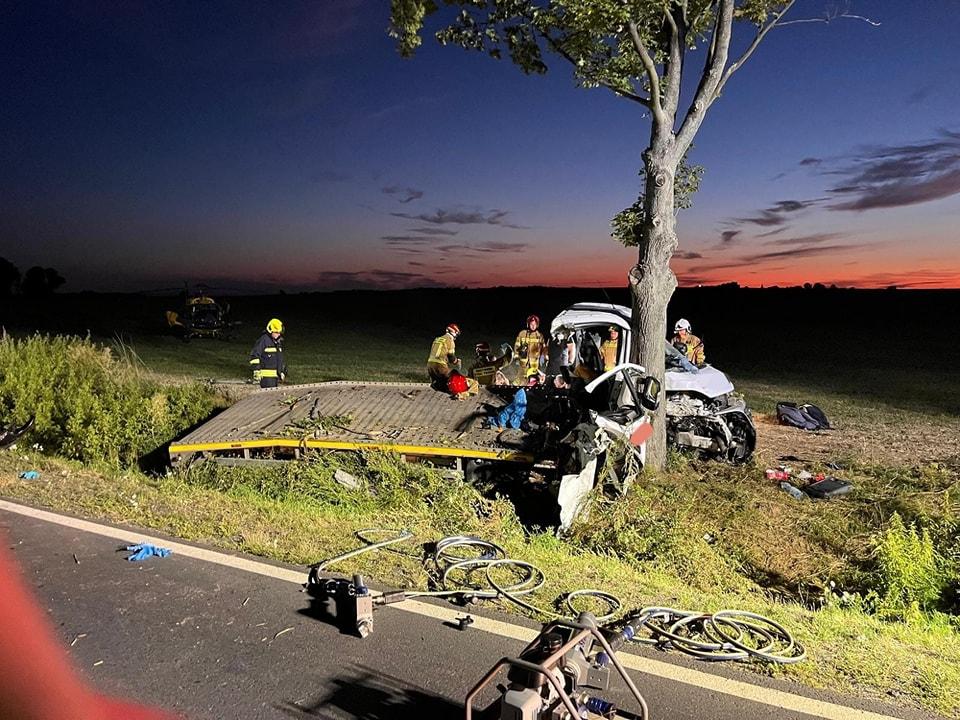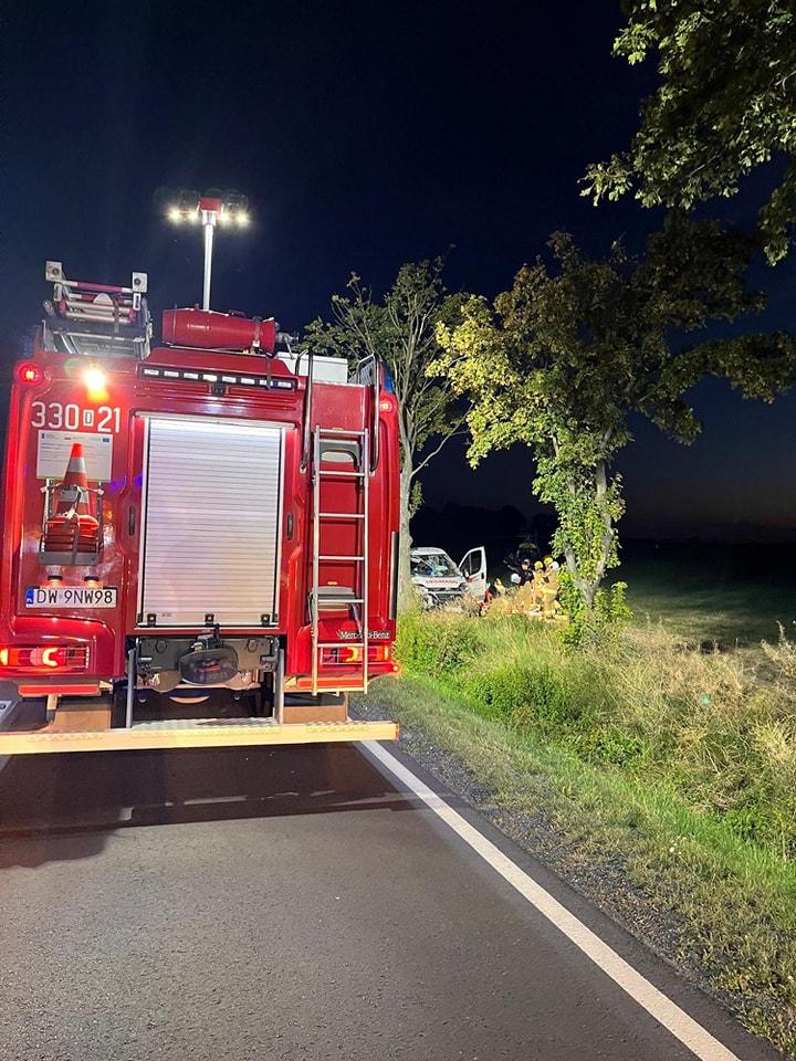 W dniu 12.08.2024 r. o godz. 20:17 Dyżurni SKKM PSP we Wrocławiu przyjęli zgłoszenie o wypadku samochodu lawety na Drodze Krajowej nr 35 pomiędzy miejscowością Gniechowice a Siedlakowice. W wyniku zdarzenia poszkodowane zostały 2 osoby: kierujący oraz pasażer. Na miejsce zadysponowano 6 zastępów JOP w tym Oficera Operacyjnego KM PSP we Wrocławiu. Dodatkowo na miejscu obecny był ZRM oraz śmigłowiec LPR. Droga podczas działań była całkowicie zablokowana. Niestety lekarz stwierdził zgon jednej osoby.