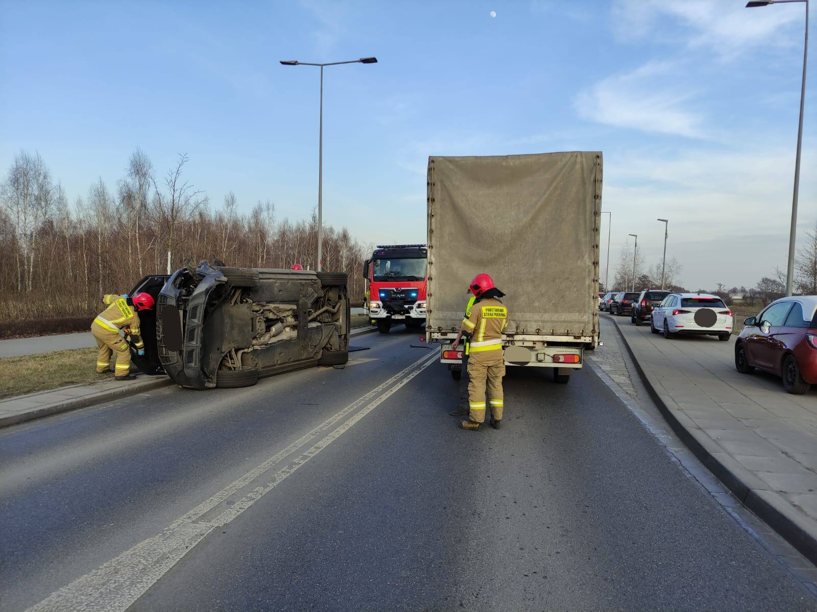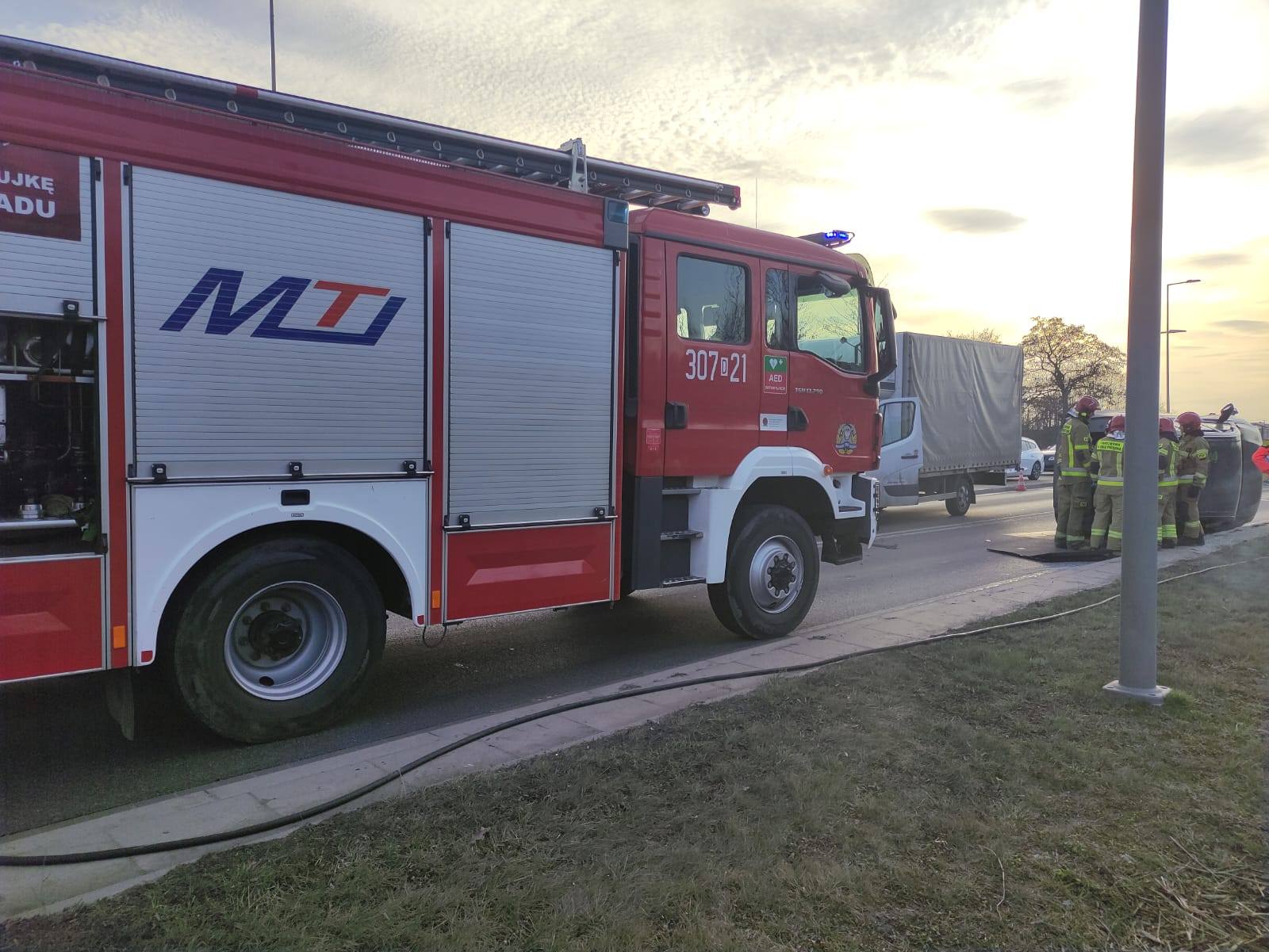 W działaniach brały udział: 4 pojazdy ratowniczo-gaśnicze w tym Oficer Operacyjny. Łącznie w akcji zaangażowanych było 12 strażaków, Policja, ZRM oraz służba drogowa. Droga Krajowa w kierunku Leśnicy zablokowana.