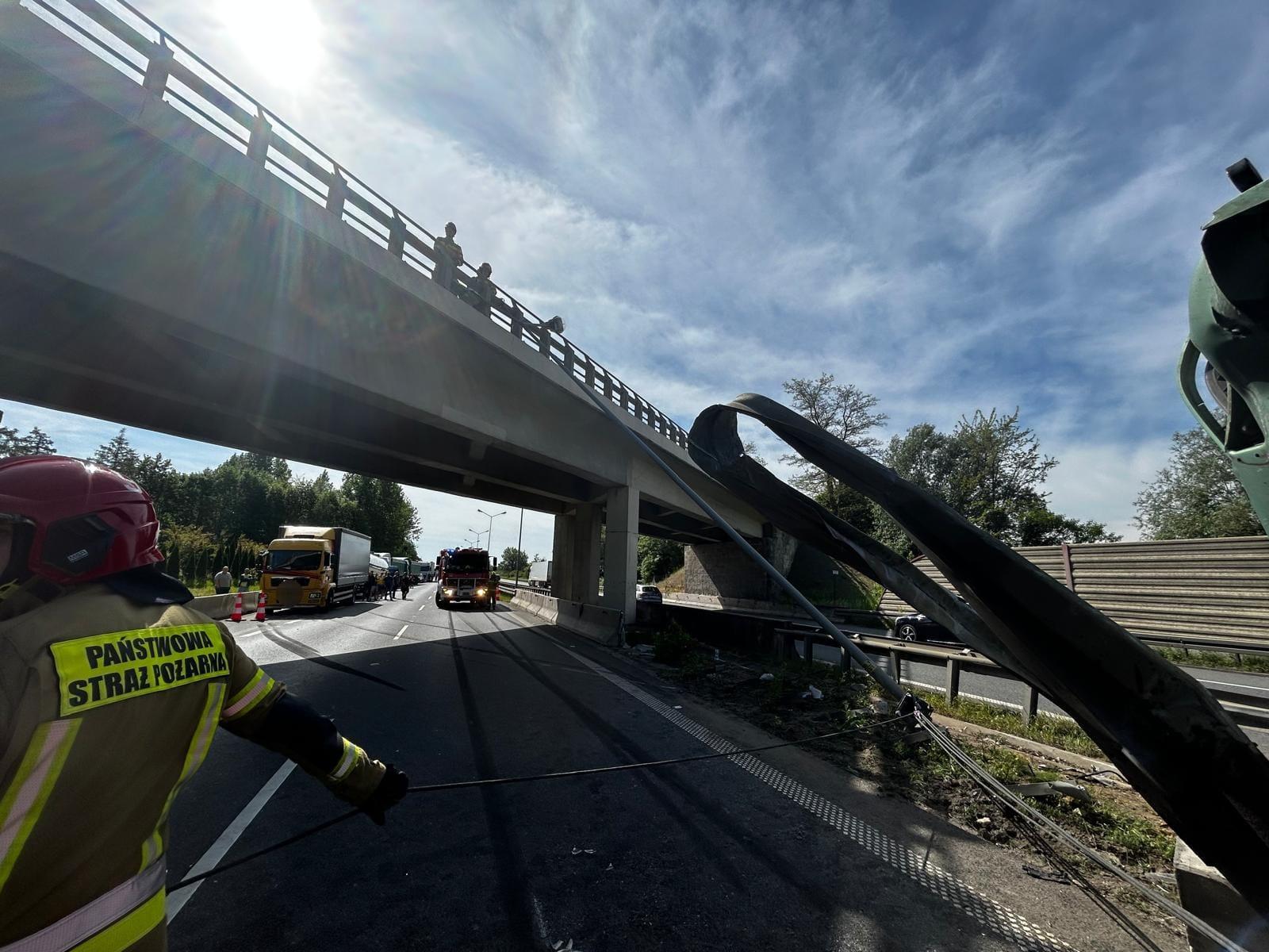 w wyniku zderzania samochód osobowy znajduje się pod pojazdem ciężarowym, a ruch w kierunku Wrocławia jest zablokowany.