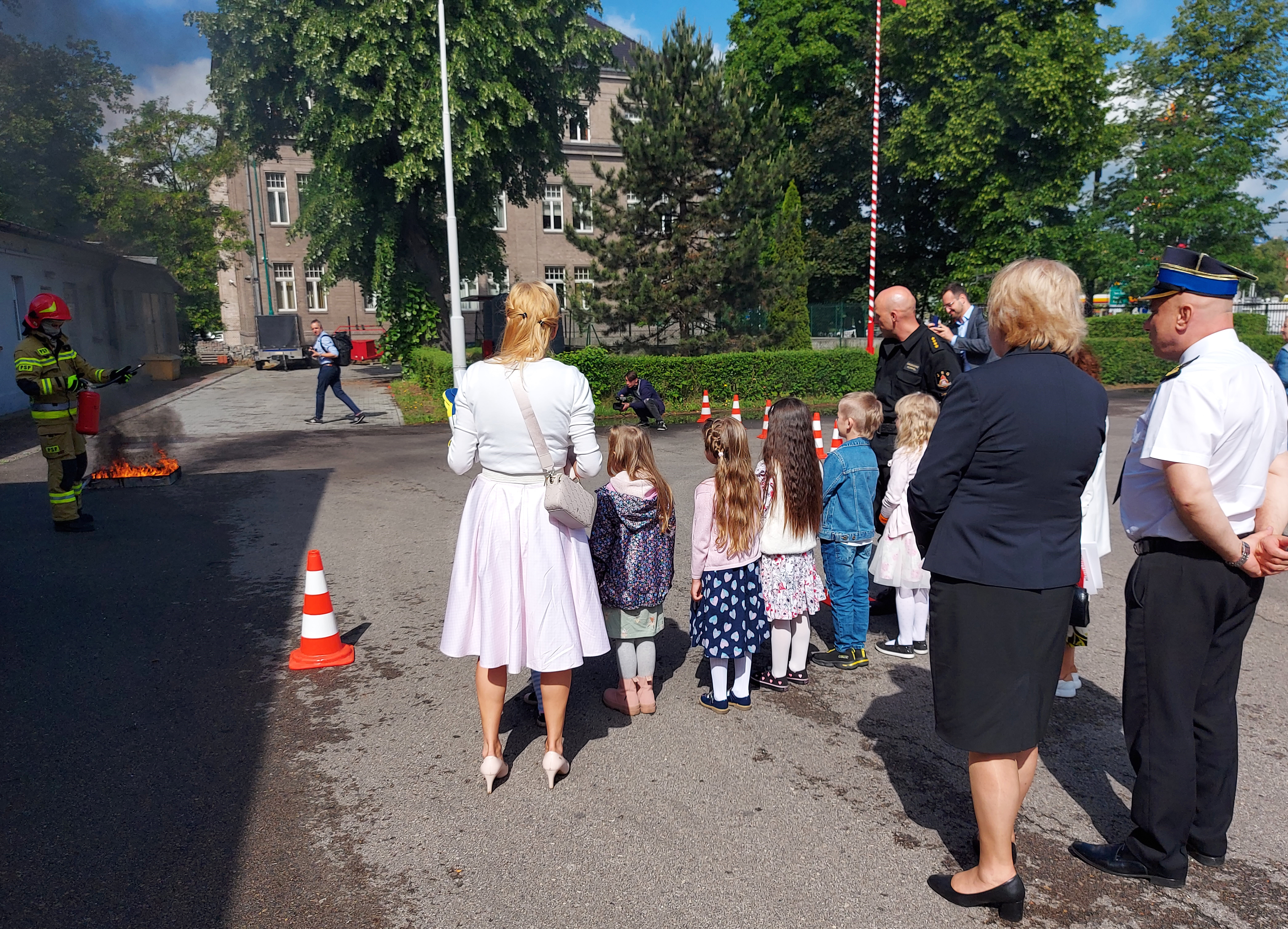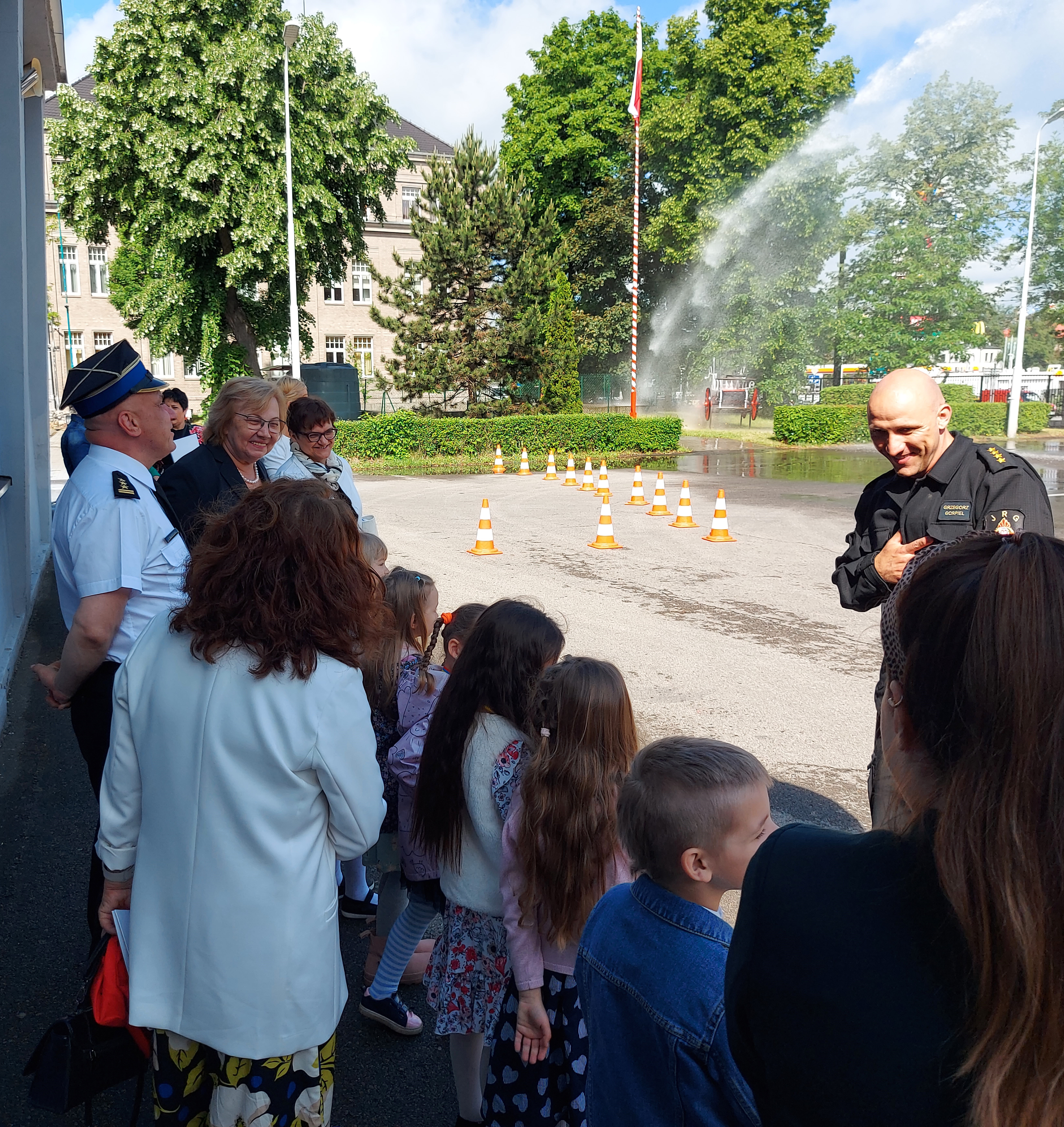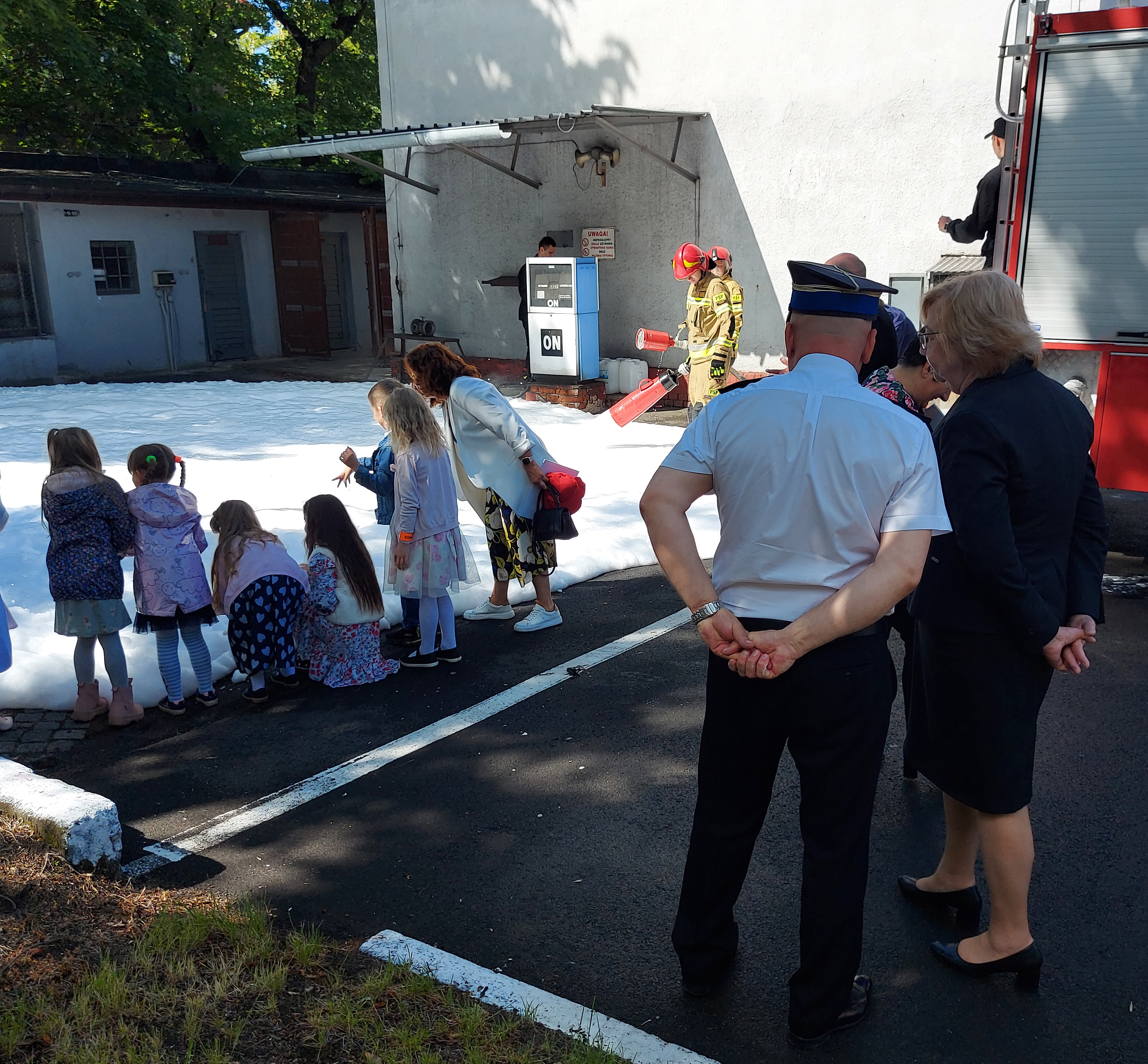 Całość wizyty zwieńczył pokaz przygotowany dla dzieci przez strażaków zabrzańskiej jednostki ratowniczo-gaśniczej. Dzieci mogły zobaczyć działania gaśnicze z użyciem gaśnicy proszkowej oraz możliwości wykorzystania armatury pianotwórczej. Dużą atrakcją okazała się prezentacja działka wodnego.