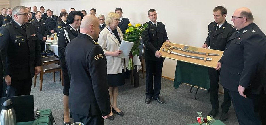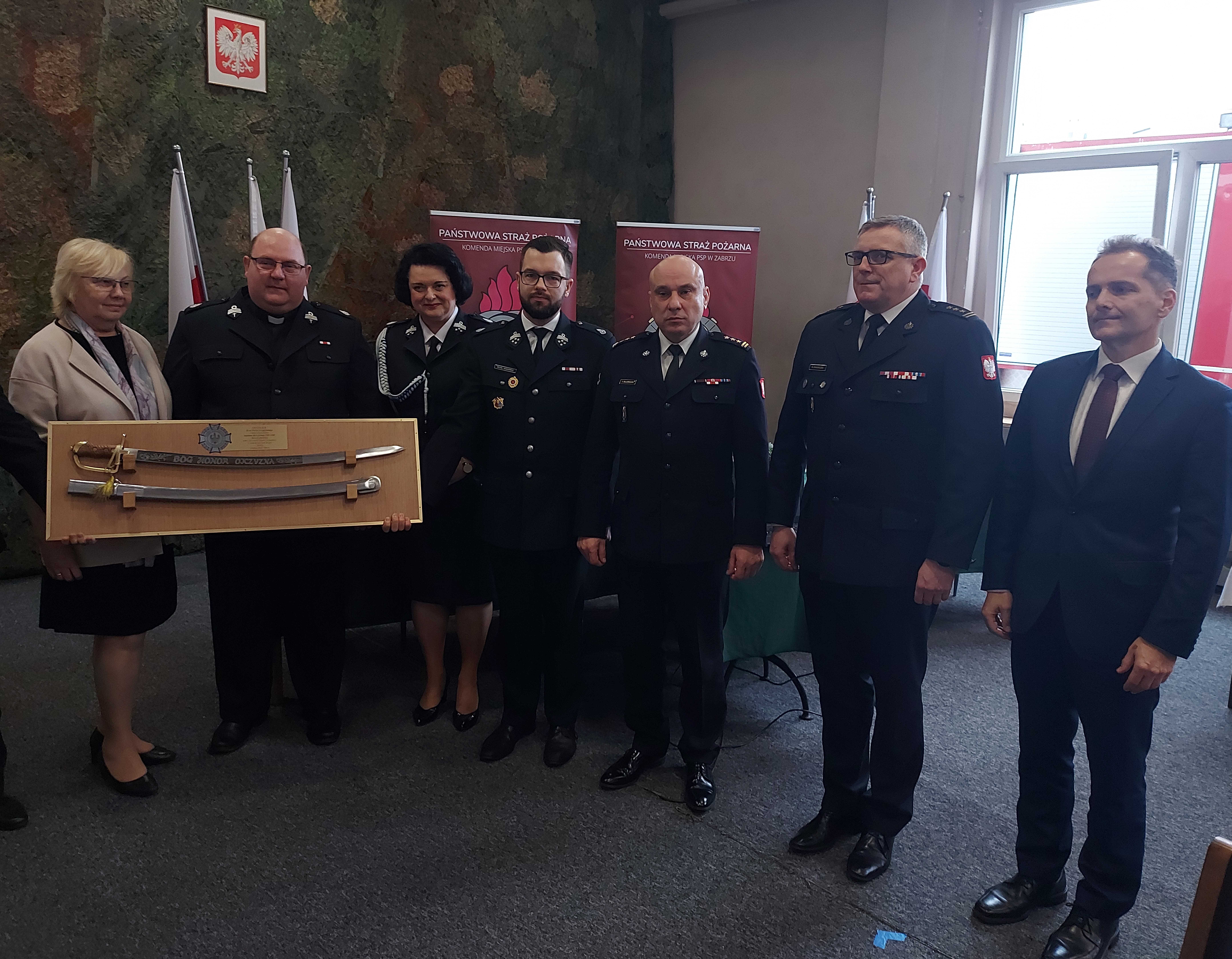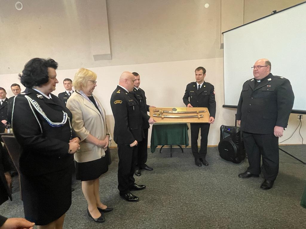 Na początku narady Komendant Miejski PSP w Zabrzu st. bryg. Tomasz Bajerczak wraz z Zastępcą Śląskiego Komendanta Wojewódzkiego PSP st. bryg. Rafałem Świerczkiem, Panią Poseł na Sejm Barbarą Dziuk oraz Prezydentem Miasta Zabrze Panią Małgorzatą Mańką-Szulik, wręczył Księdzu Piotrowi Szczygielskiemu pamiątkową szablę z okazji objęcia funkcji kapelana diecezjalnego PSP i OSP diecezji gliwickiej.