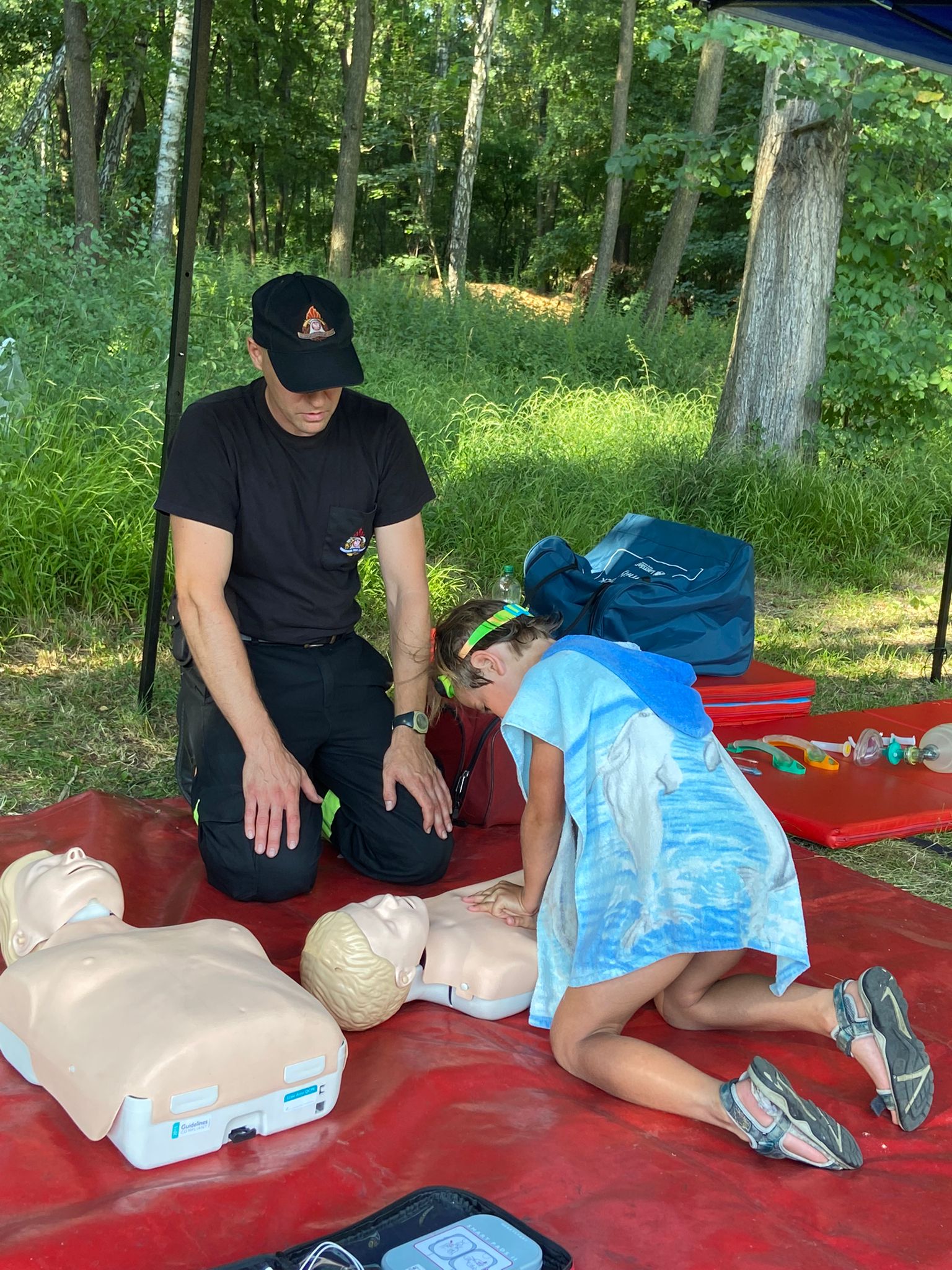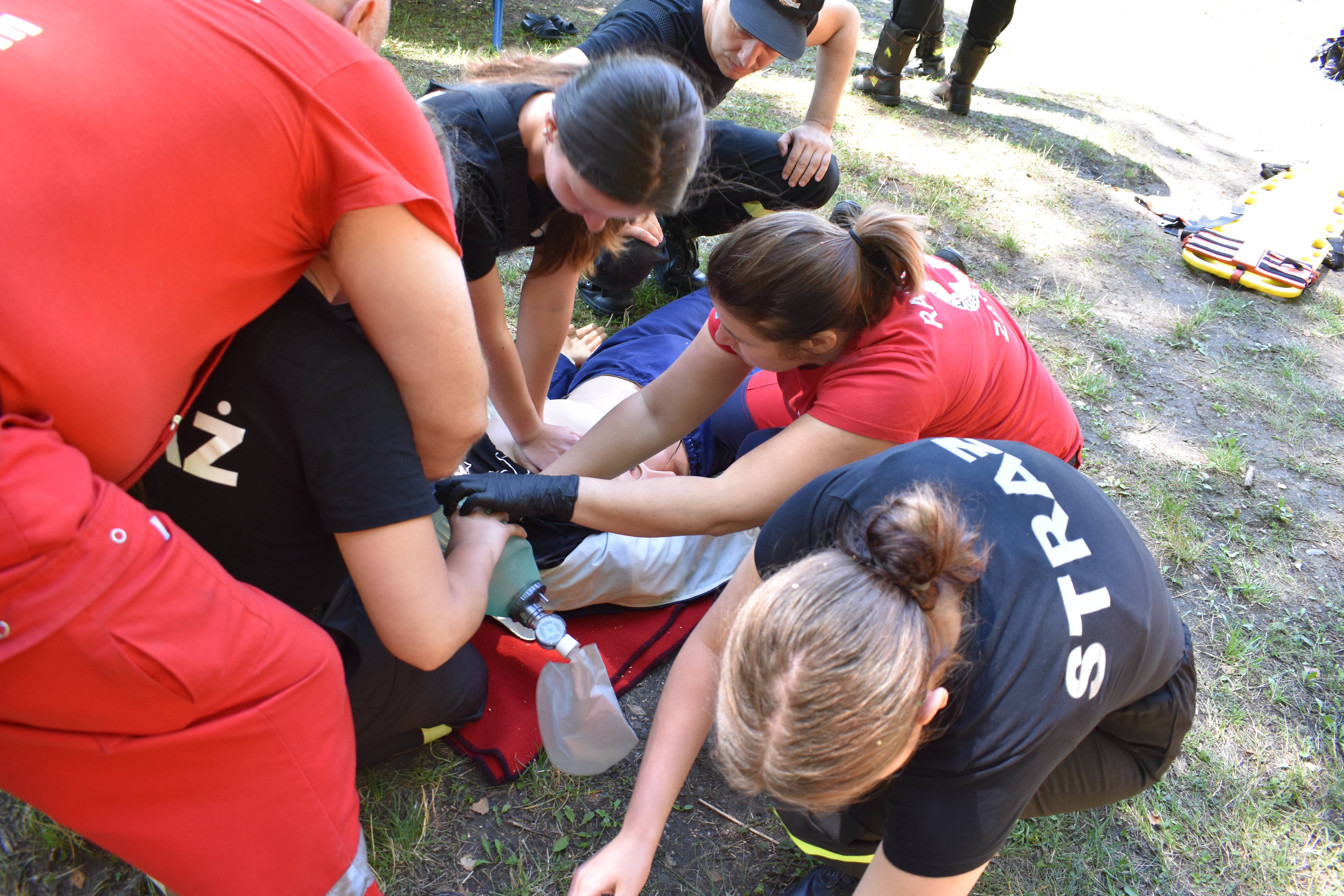 Ratownicy z PCK zaprezentowali posiadany sprzęt oraz przeprowadzili ćwiczenia z udzielania Kwalifikowanej Pierwszej Pomocy.