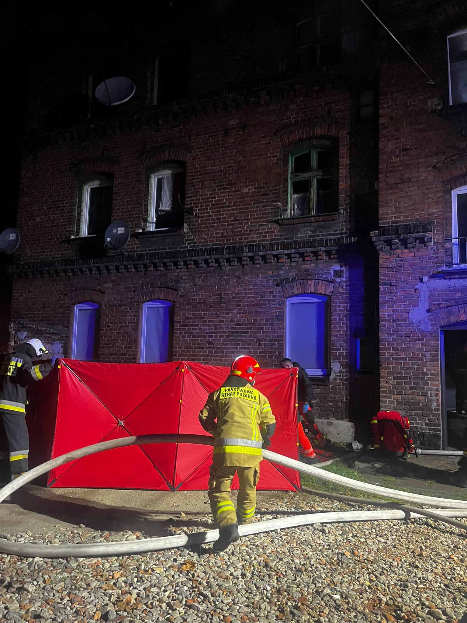 W płonącym mieszkaniu odnaleziono dwie nieprzytomne osoby, które ewakuowano na zewnątrz budynku. Zostały one przekazane Pogotowiu Ratunkowemu i przewiezione do szpitala. Równocześnie prowadzono działania gaśnicze, podając dwa prądy wody w celu opanowania ognia. Strażacy w sposób szybki i sprawny opanowali ogień, który nie rozprzestrzenił się na sąsiednie mieszkania.