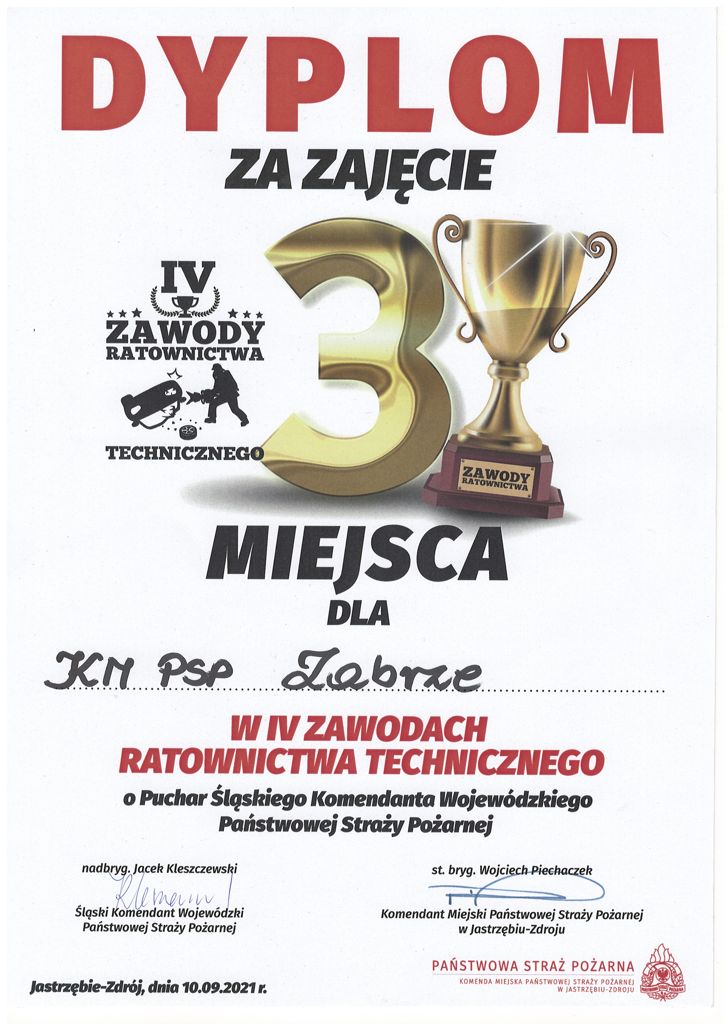 W dniu 10 września 2021 r. w Jastrzębiu-Zdroju odbyły się „IV Zawody Ratownictwa Technicznego o Puchar Śląskiego Komendanta Wojewódzkiego Państwowej Straży Pożarnej”, w których wzięli udział zabrzańscy strażacy i zajęli trzecie miejsce.