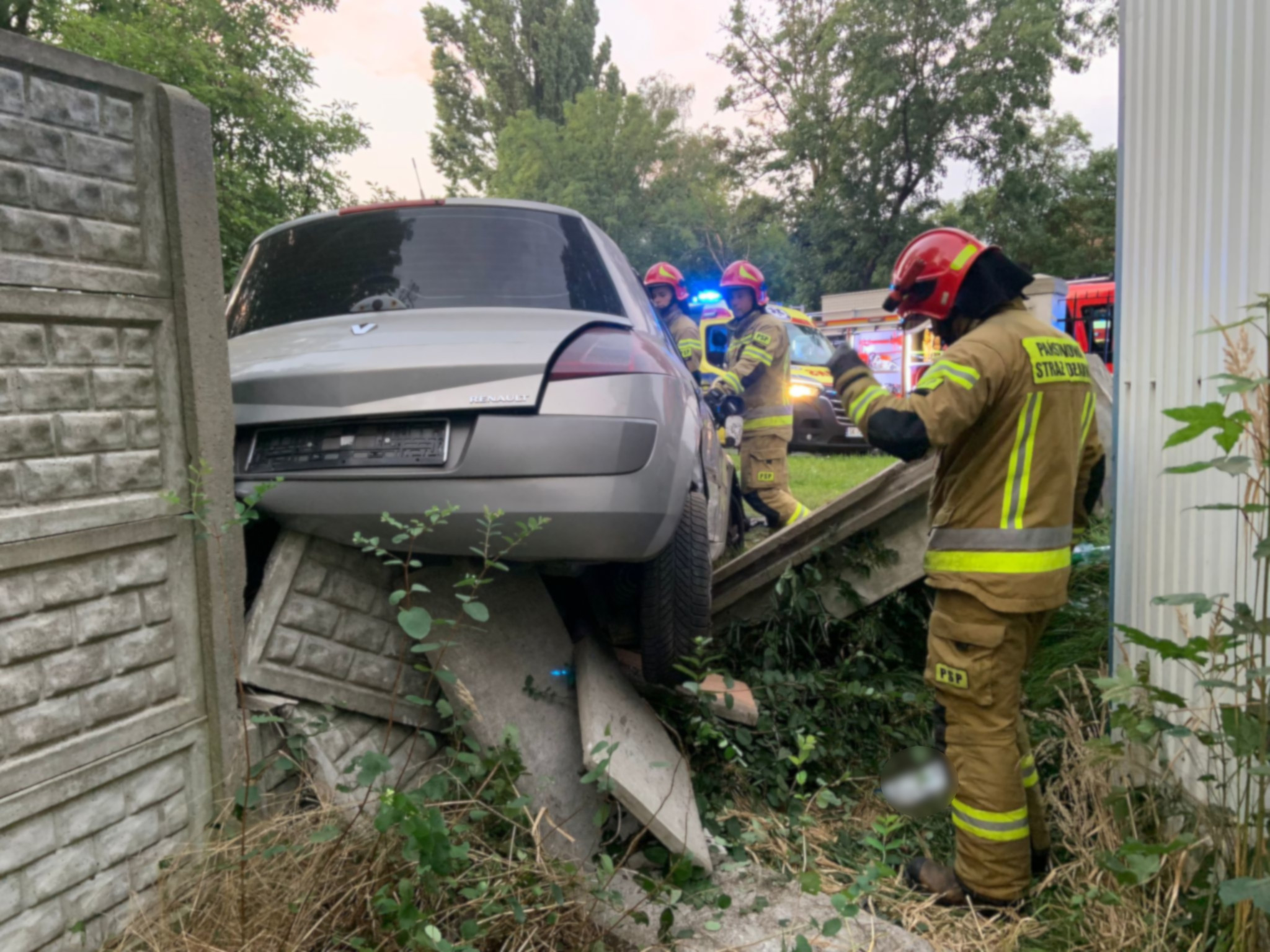 Po przybyciu na miejsce zdarzenia stwierdzono, że doszło do uderzenia samochodu osobowego w betonowe ogrodzenie posesji. Pojazdem podróżowały 3 osoby. Dwie osoby opuściły pojazd o własnych siłach, a nieprzytomny kierowca znajdował się wewnątrz pojazdu.