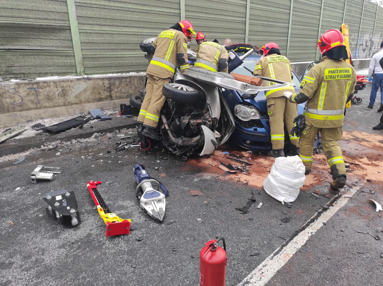 Po przybyciu na miejsce stwierdzono, iż doszło do zderzenia trzech samochodów osobowych. W wyniku zderzenia jeden z kierowców został zakleszczony w samochodzie.
