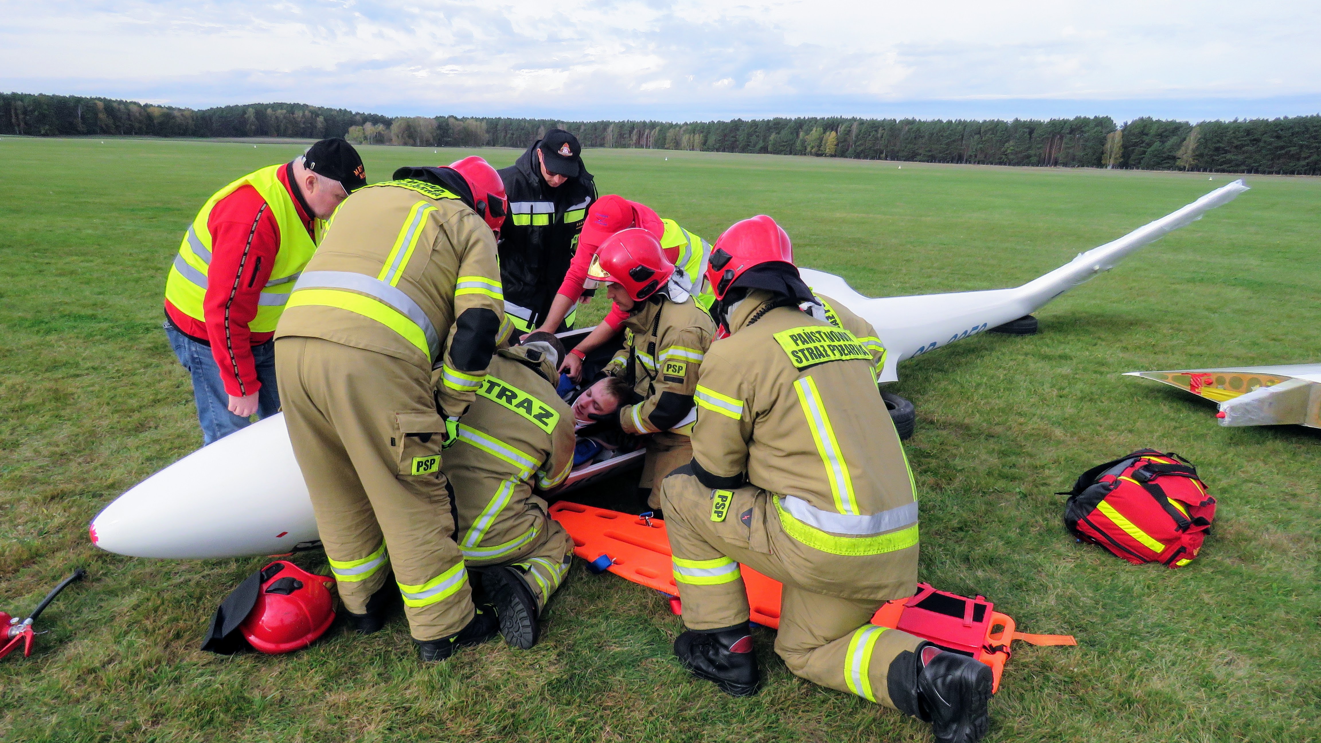 Plan ćwiczeń zakładał wypadek szybowca szkoleniowego, który krótko po starcie rozbił sie o płytę lotniska. Zadaniem przybyłych na miejsce zdarzenia strażaków była ewakuacja ciężko rannego pilota z szybowca, udzielenie mu pierwszej pomocy medycznej oraz przekazanie Pogotowiu.