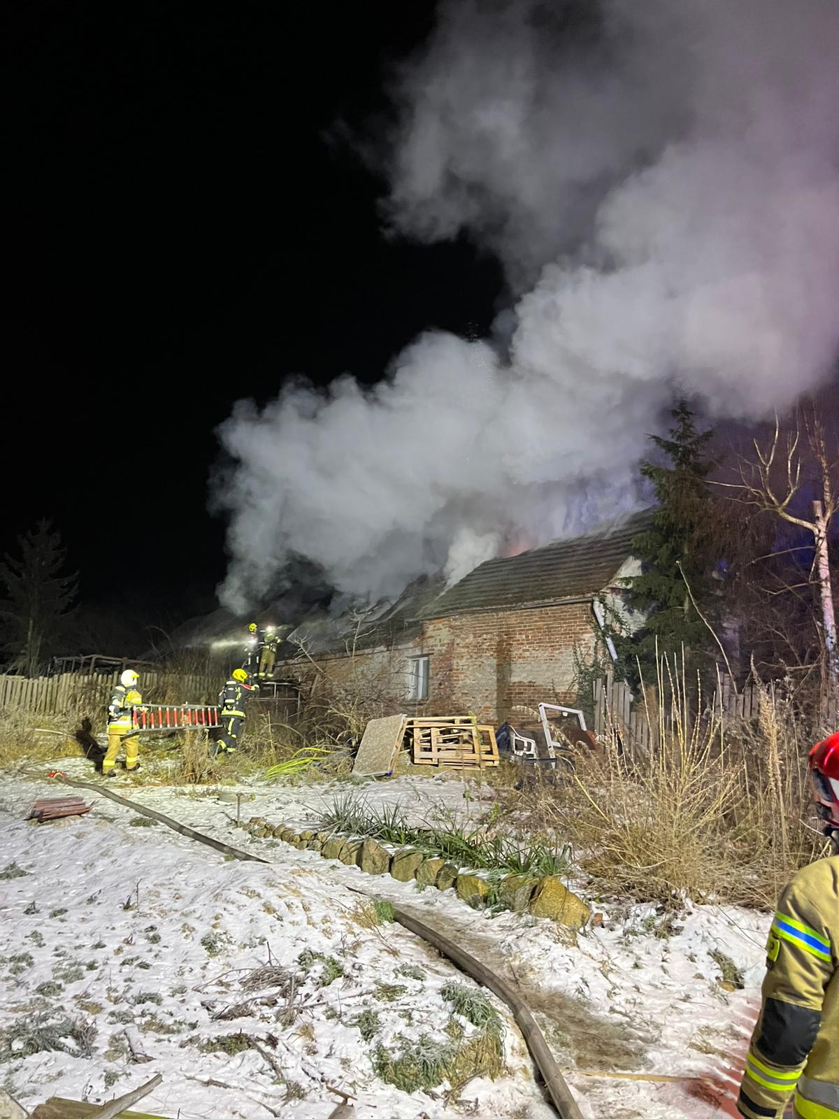 Duża powierzchnia pożaru groziła zawaleniem konstrukcji dachowej, istniało ryzyko przeniesienia ognia na przyległy budynek gospodarczy w którym znajdował się opał, deski i inne materiały palne.