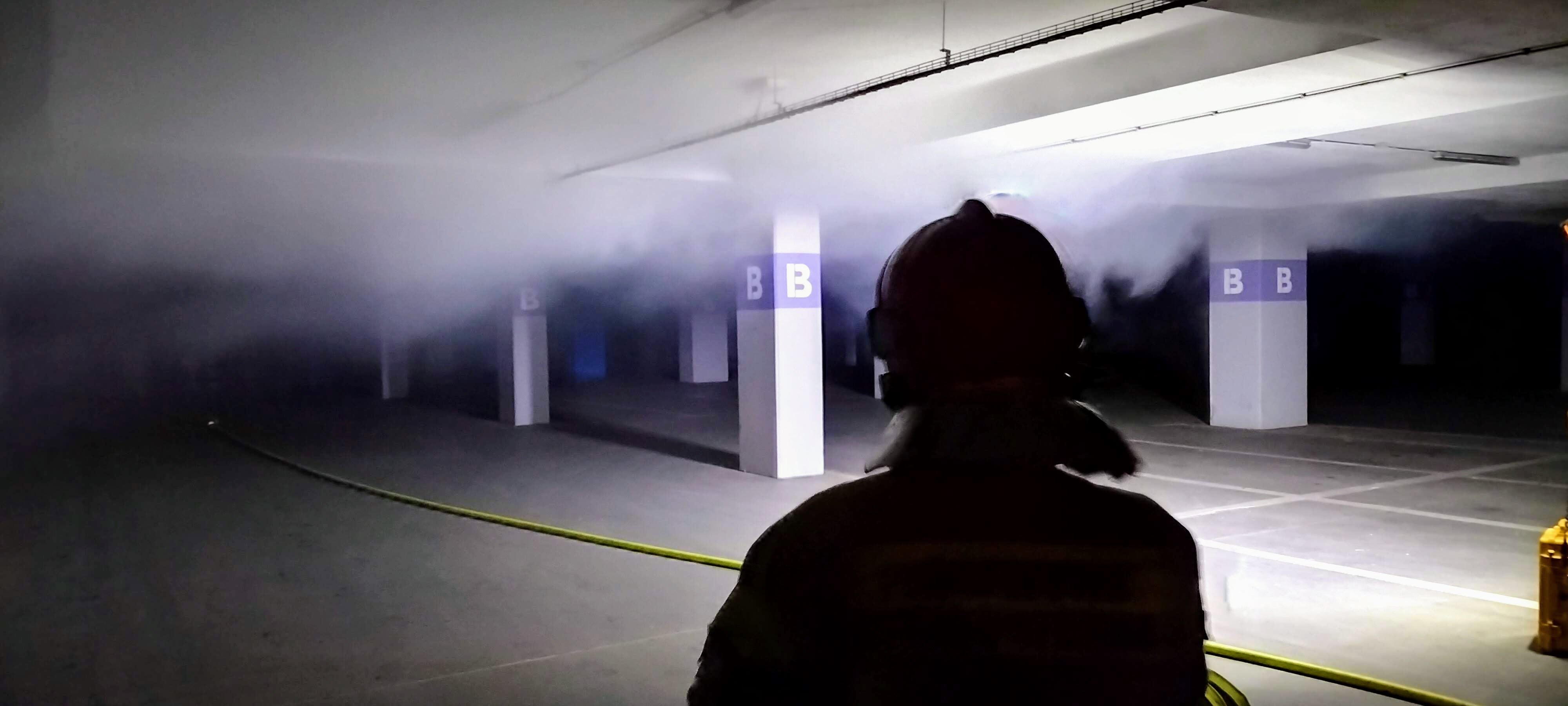 Dym wydobywający się z całej przestrzeni podziemnego parkingu wskazywał na to, że pożar rozwija się w tej części budynku. Natychmiast przystąpiono do rozwijania linii gaśniczych.