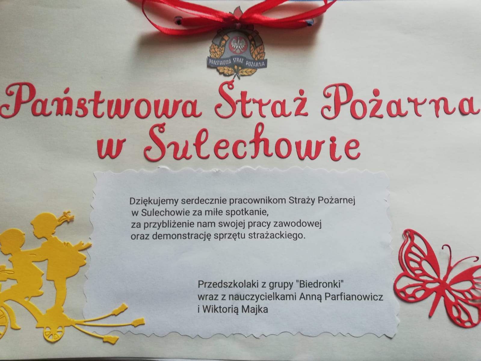 Każdego dnia odwiedzały nas maluchy z zaprzyjaźnionych przedszkoli z Sulechowa i okolicznych wiosek. Strażacy w prosty i zrozumiały sposób opowiadali o swojej pracy. Przedszkolaki mogły zapoznać się z zawodem strażaka, specyfiką służby oraz z zasadami postępowania na wypadek powstania pożaru lub innego zagrożenia. Dzieci dowiedziały się, że strażacy nie tylko gaszą pożary, ale pomagają również w czasie innych zdarzeń min.: wypadków drogowych, powodzi czy ulewnych deszczy, silnych wiatrów. Maluchy miały okazję zobaczyć wozy strażackie wraz z całym wyposażeniem, sprzęt gaśniczy i ubrania bojowe w których strażacy prowadzą działania ratowniczo - gaśnicze. Każdy kto chciał mógł przymierzyć hełm strażacki. Jak zwykle największą atrakcją było lanie wody z węża strażackiego. Na zakończenie każdego spotkania przedszkolaki z uśmiechem na twarzach dziękowały za poświęcony czas i przekazywały własnoręcznie zrobione prezenty.