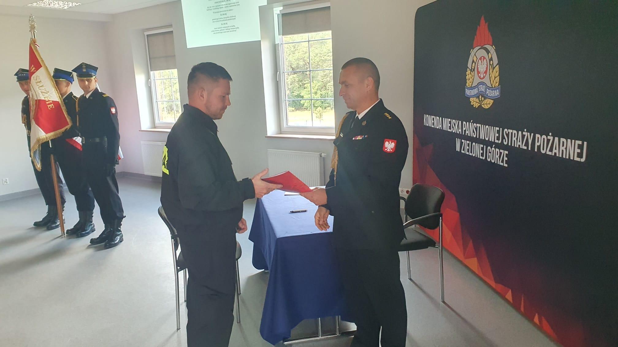 Strażacy Dawid Budziński oraz Mateusz Leśniak wstąpili w szeregi Państwowej Straży Pożarnej. Uroczyste akty mianowania wręczył Komendant Miejski PSP w Zielonej Górze, st. kpt. Łukasz Januszewicz.