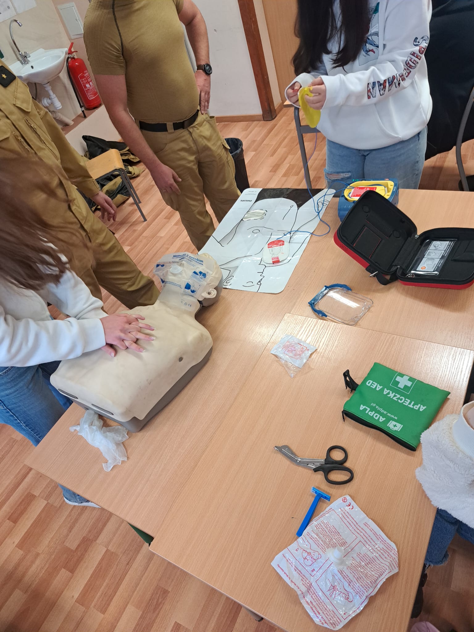W części praktycznej młodzież miała możliwość poczucia na sobie ciężaru wyposażenia osobistego i uzbrojenia strażaka oraz zaznajomienia się z obsługą sprzętu ratowniczego, w tym defibrylatora AED, co spotkało się z ogromnym zainteresowaniem młodych ludzi.