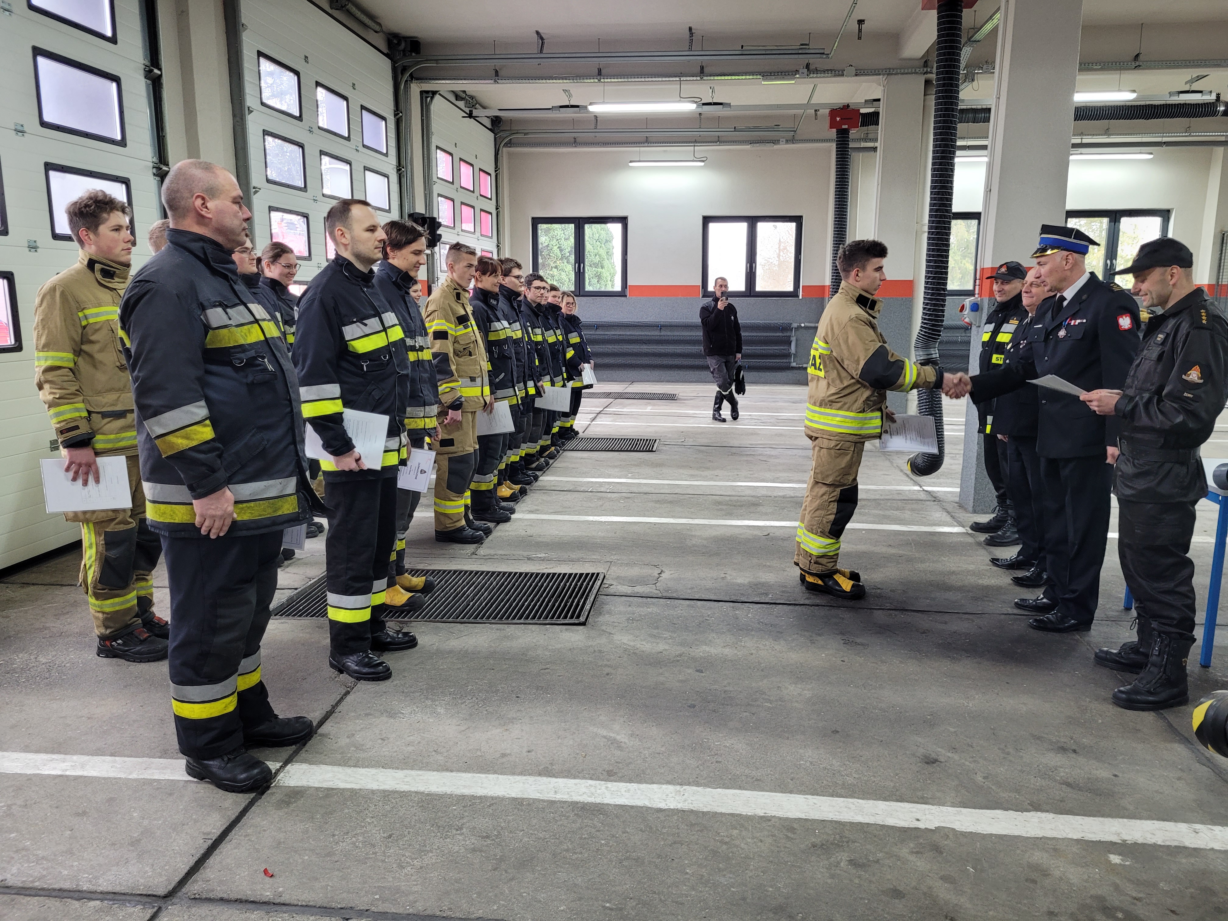 Zaświadczenia o ukończeniu szkolenia wręczył Komendant Miejski PSP w Żorach bryg. Marek Zdziebło oraz Prezes Zarządu Oddziału Powiatowego ZOSP RP w Żorach dh Mirosław Orłowski.