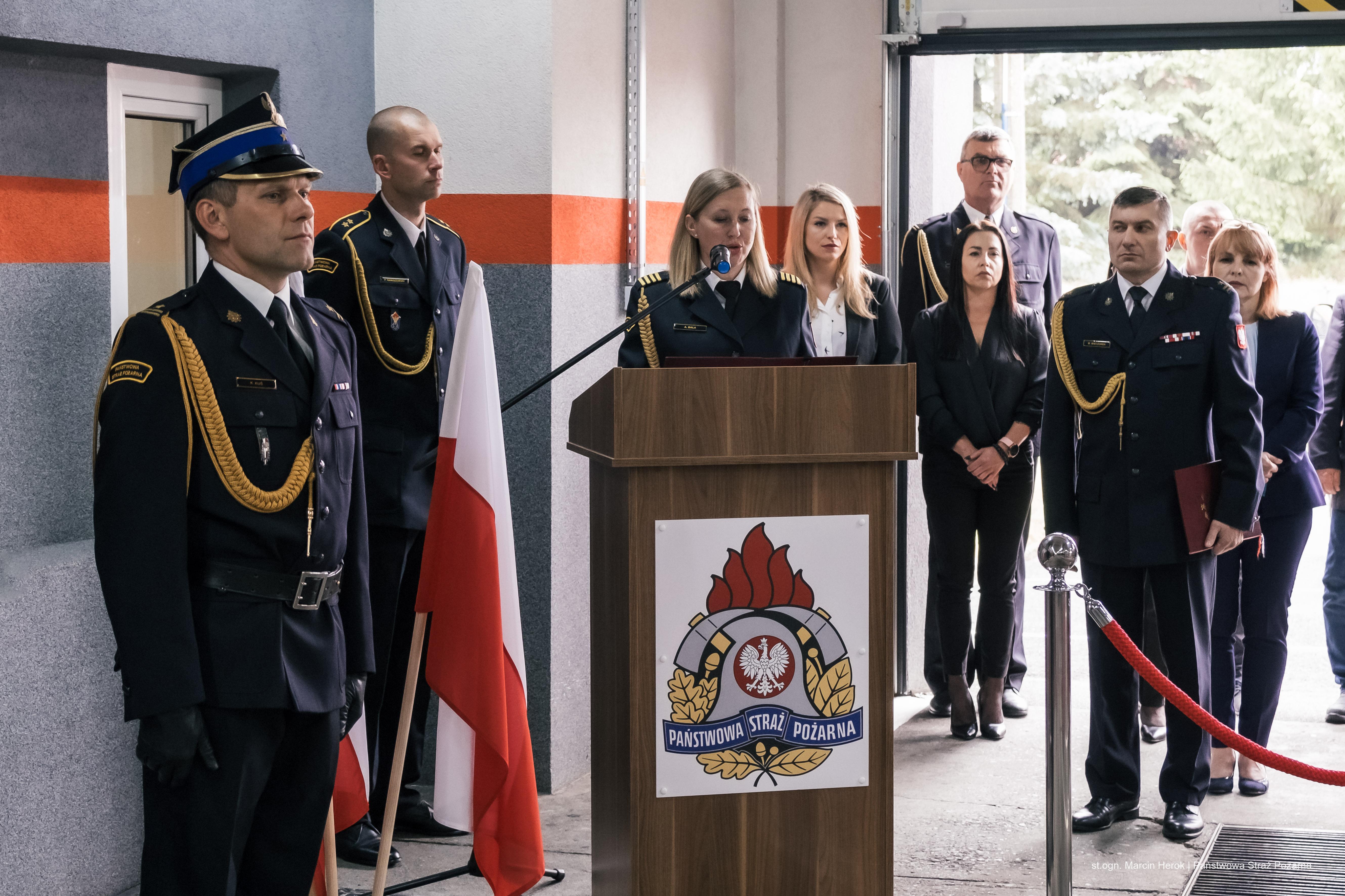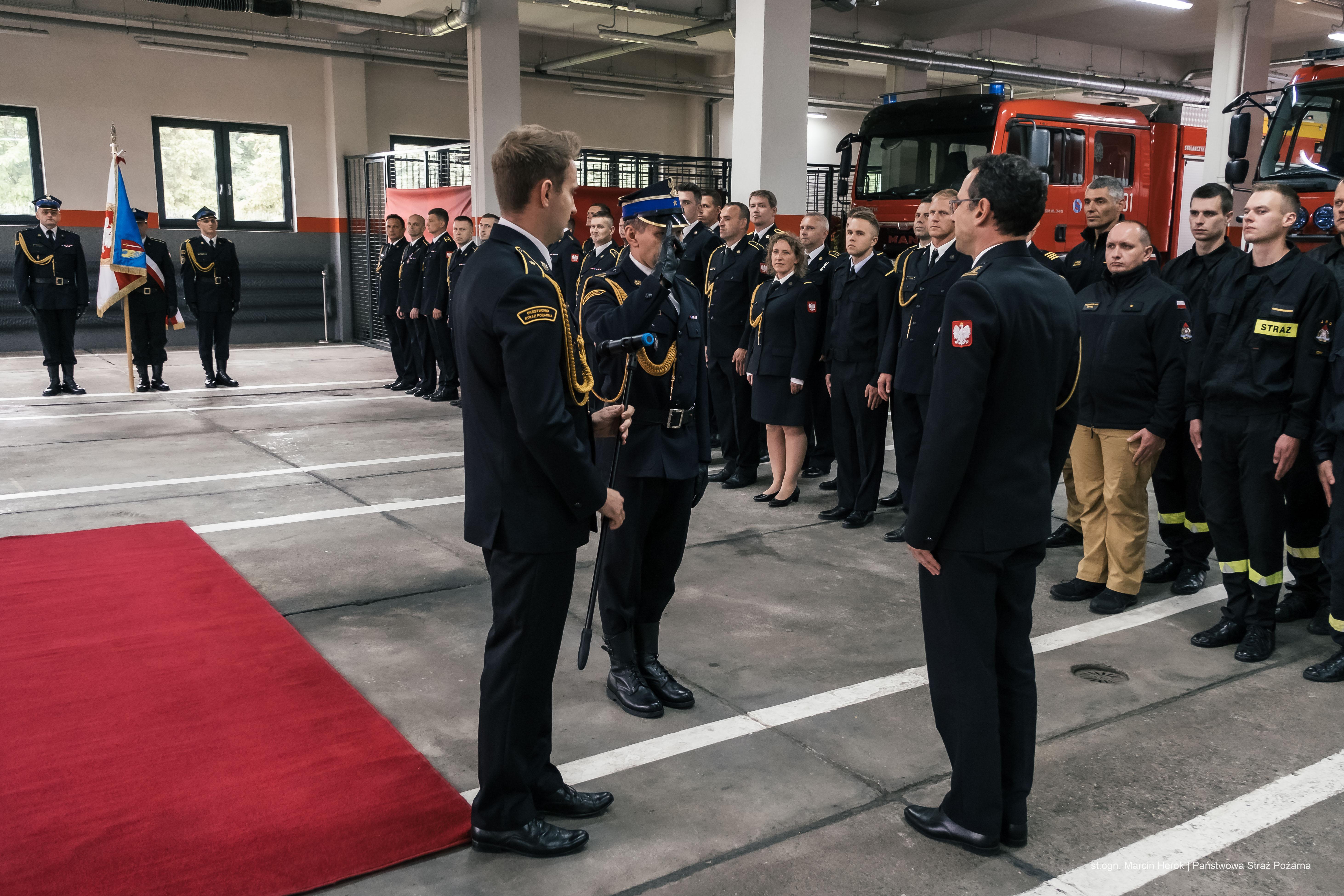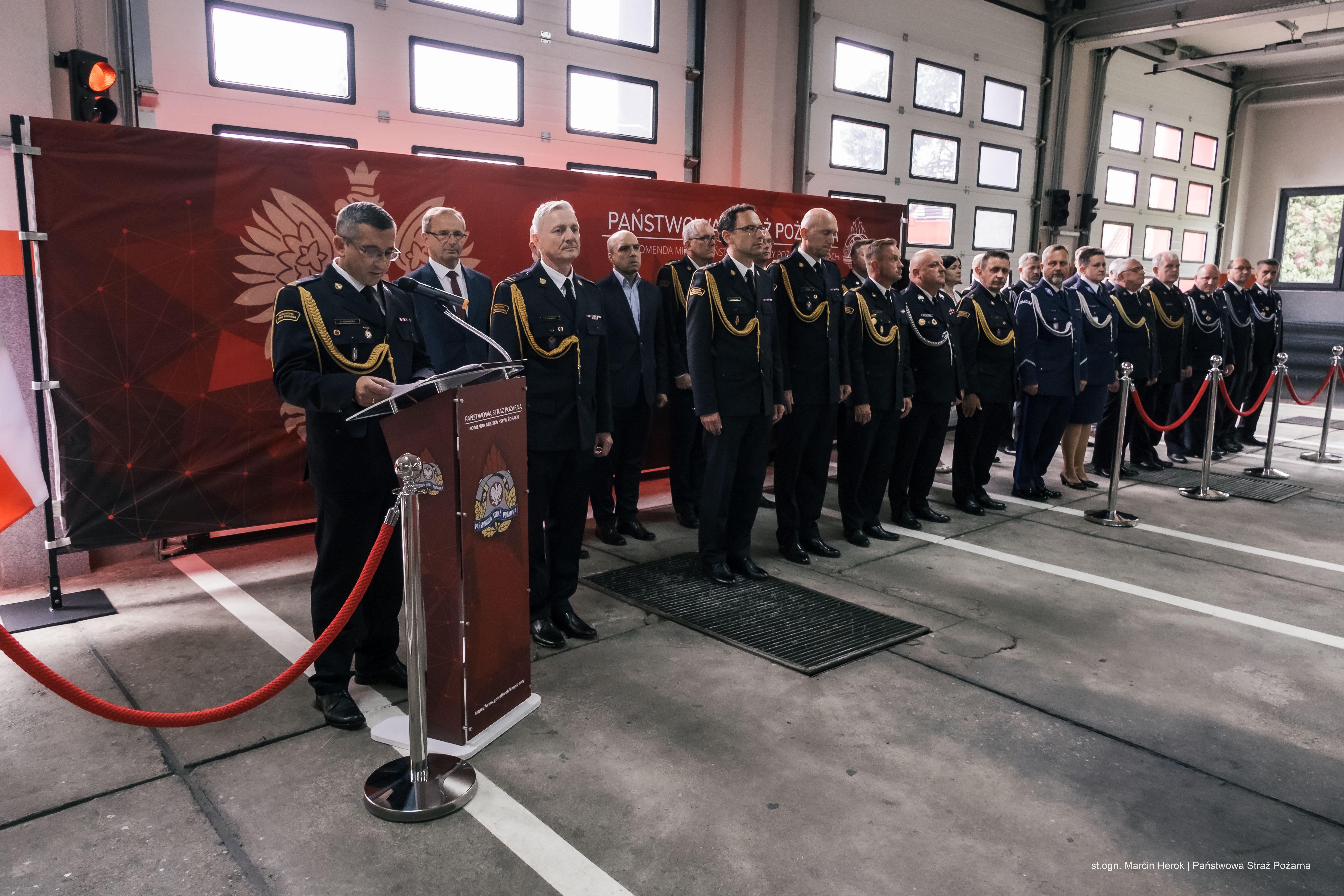 Uroczystość rozpoczęła się złożeniem meldunku Śląskiemu Komendantowi Wojewódzkiemu PSP st. bryg. Wojciechowi Kruczkowi przez dowódcę uroczystości mł. bryg. Krzysztofa Kusia, po czym wprowadzono sztandar komendy oraz odtworzono hymn państwowy. W uroczysty sposób nastąpiło odczytanie aktu powołania na stanowisko Komendanta Miejskiego PSP w Żorach oraz przywitanie ze sztandarem mł. bryg. Krzysztofa Ograbka. Następnie Śląski Komendant Wojewódzki PSP przyjął meldunek o przyjęciu obowiązków Komendanta Miejskiego PSP w Żorach.