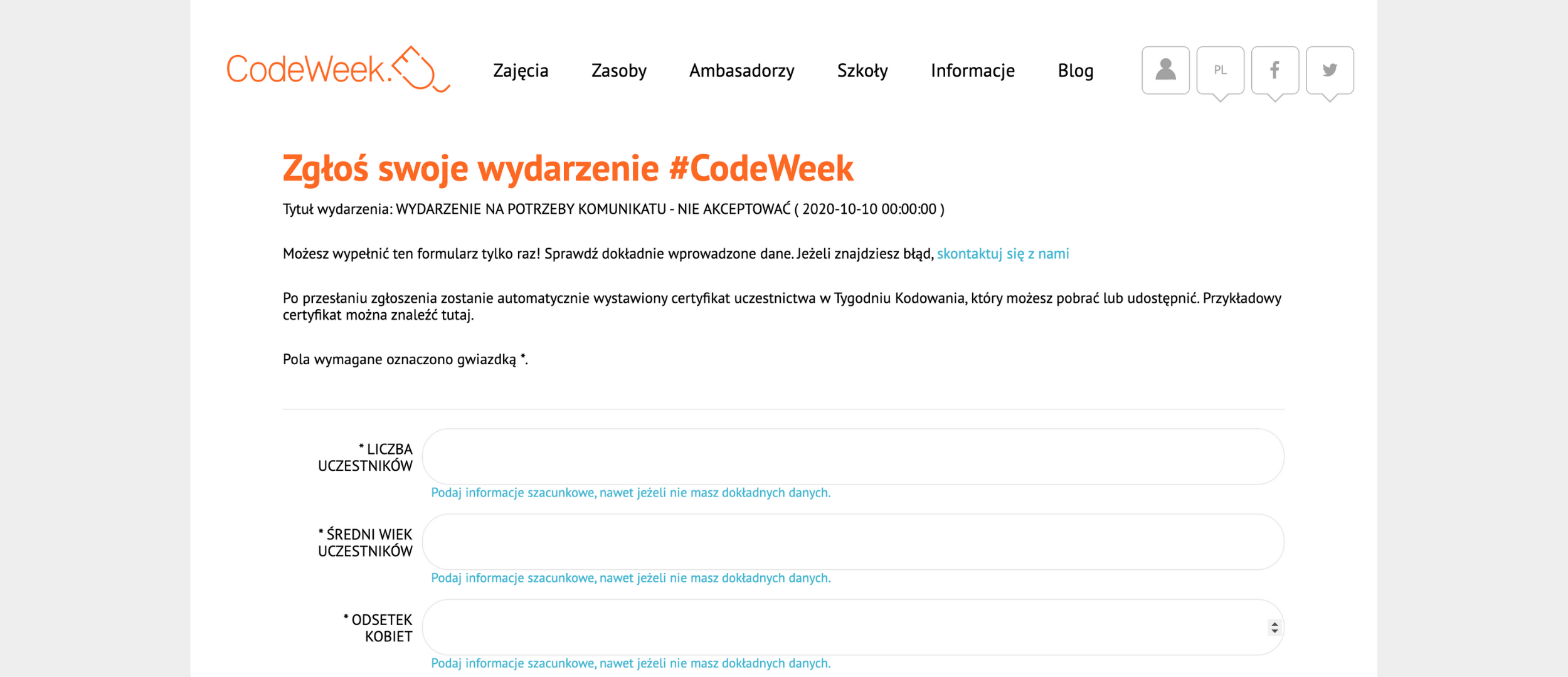 WAŻNE! Aby wygenerować certyfikat uczestnictwa nie musisz zgłaszać swojego wydarzenia! Dzięki temu certyfikaty dla uczestników możesz przygotować przed wydarzeniem i rozdać je po zakończeniu Twojej inicjatywy.