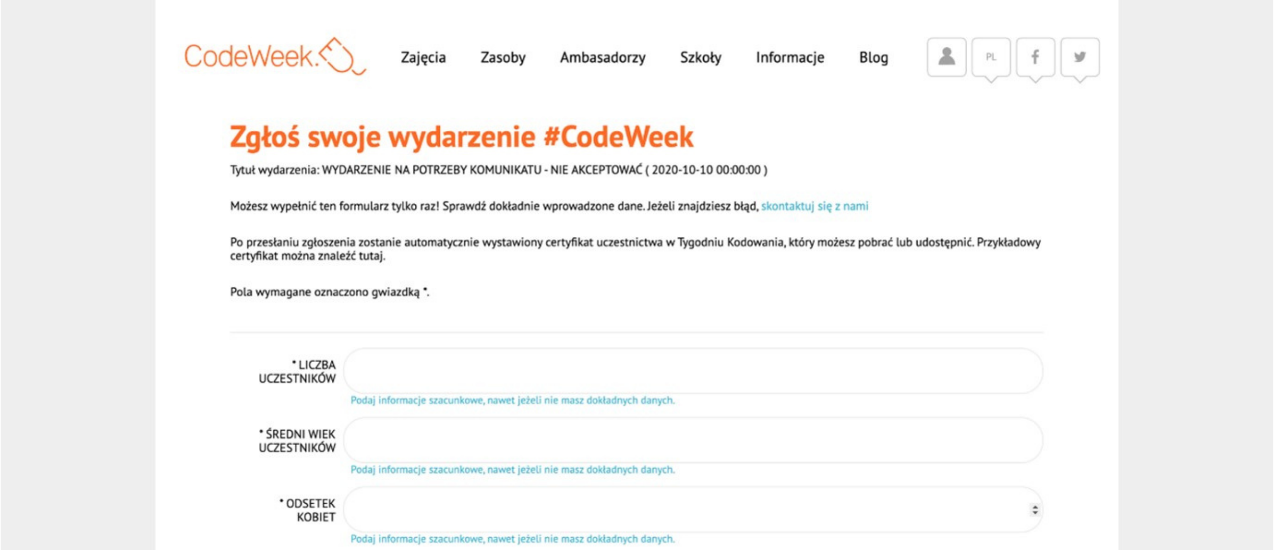 4. Teraz otworzy się specjalny formularz raportowania Twojego wydarzenia. Uważnie wypełnij wszystkie pola, podając szacunkowe dane dotyczące organizowanej przez Ciebie inicjatywy. Naciśnij przycisk „Prześlij zgłoszenie wydarzenia”. Jeżeli wypełniłeś formularz poprawnie, powinieneś zobaczyć ekran, informujący, że Twój certyfikat jest gotowy.