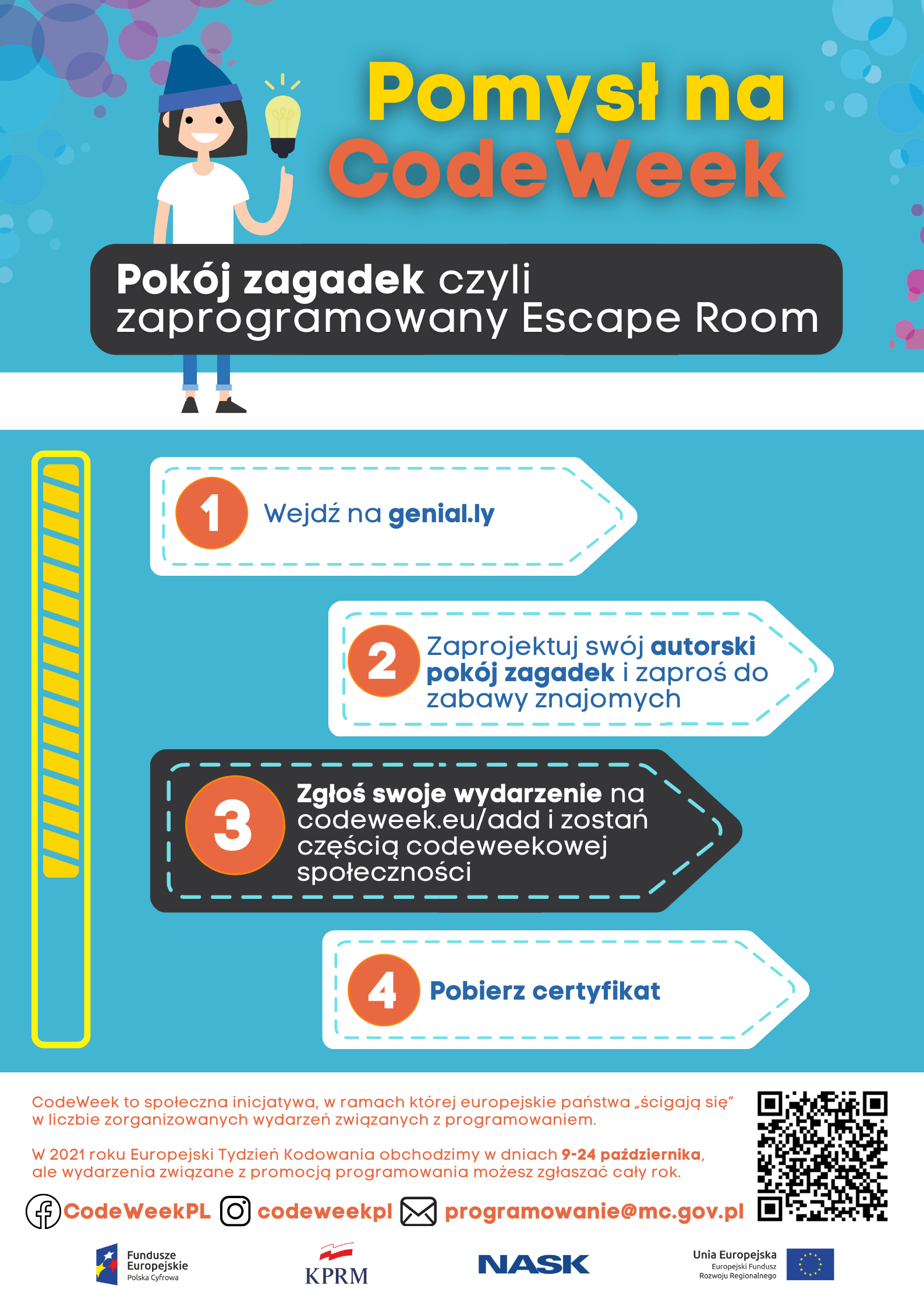 Więcej inspiracji: wejdź na mapę CodeWeek, w wyszukiwarce wybierz kolejno: rok – np. 2020, kraj – Polska, a w wyszukiwarce wpisz hasło „escape room”. Uwaga! W ten sposób możesz wyszukiwać też inne wydarzenia i zainspirować się do przygotowania własnej inicjatywy 😊