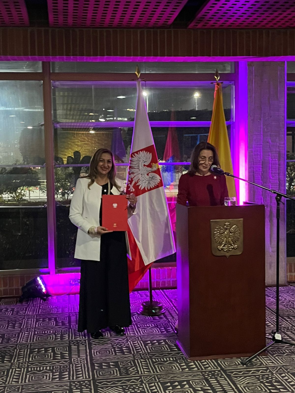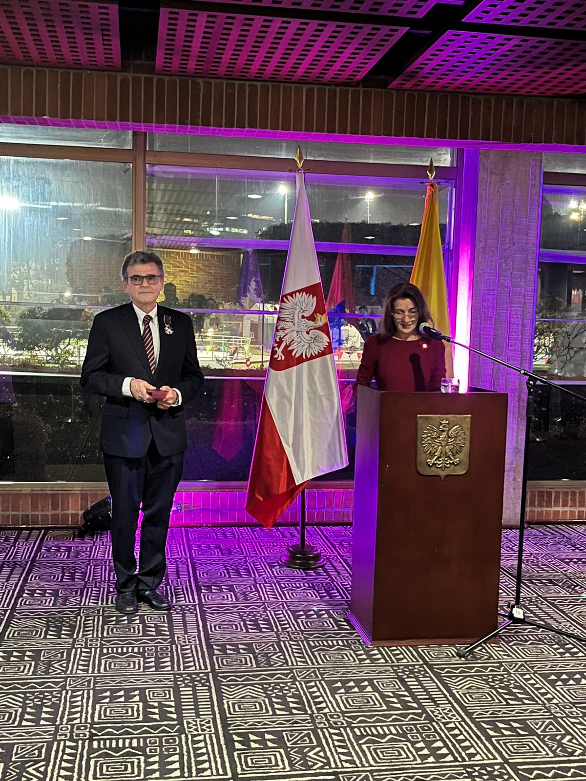 Po koncercie nastąpiła część oficjalna. Po powitaniu gości i wygłoszeniu okolicznościowego przemówienia z okazji rocznicy odzyskania przez Polskę niepodległości w 1918 r., Ambasador RP w Kolumbii Barbara Sośnicka wręczyła akt nadania obywatelstwa p. Marcie Oramas, wieloletniej pracownicy Ambasady RP; odznaczyła p. Marco Sergio Vera Baczyńskiego Srebrnym Krzyżem Zasługi, nadanym przez Prezydenta RP za osiągnięcia w rozwoju współpracy polsko-kolumbijskiej; a także przekazała Konsulowi Honorowemu RP w Medellín p. Gabrielowi Restrepo akt powołania na kolejną kadencję. Następnie uczestnicy wydarzenia zostali zaproszeni do obejrzenia wystawy „Polskie wynalazki, które zmieniły świat”. Mieli także okazję skosztować tradycyjnych polskich wypieków i pysznych polskich jabłek, które Kolumbia importuje bezpośrednio z naszego kraju.